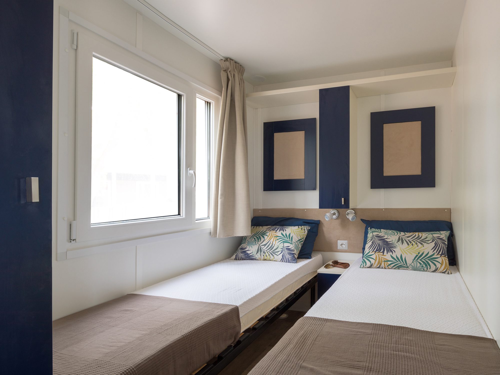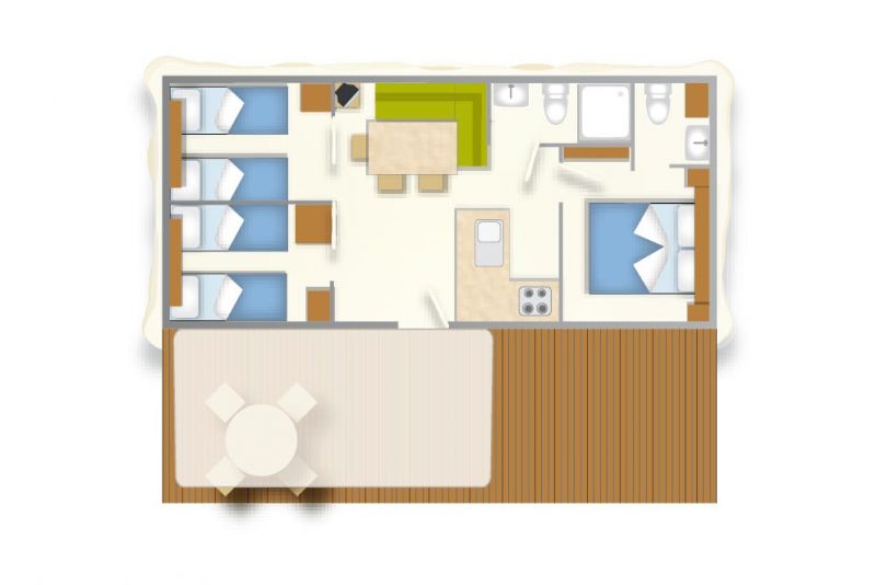 Das frische, junge und gemütliche Mobilhome Baia Elite mit einer Fläche von ca. 33 Quadratmetern ist für Familien oder Gruppen von Freunden mit bis zu 6 Personen konzipiert. Die Inneneinrichtung ist modern und komfortabel: eine Küchenecke mit Halbinsel (Halbinsel nur in einigen Unterkünften vorhanden), komplett mit 4-Flammen-Herd, Spüle, Töpfen und Geschirr sowie einem großen Kühlschrank mit Gefrierfach. Die große Fenstertür, die auf die geräumige Holzveranda führt, verleiht dem geräumigen Wohnzimmer, das mit einem Sofa, einem Tisch und Stühlen ausgestattet ist, Helligkeit. Die Unterkunft verfügt über einen Schlafbereich mit 3 Schlafzimmern, eines mit einem Doppelbett und 2 mit 2 Einzelbetten, ein komplettes Badezimmer mit WC, Dusche, Waschbecken und, in einigen Einheiten, ein zweites Badezimmer mit WC und Waschbecken.