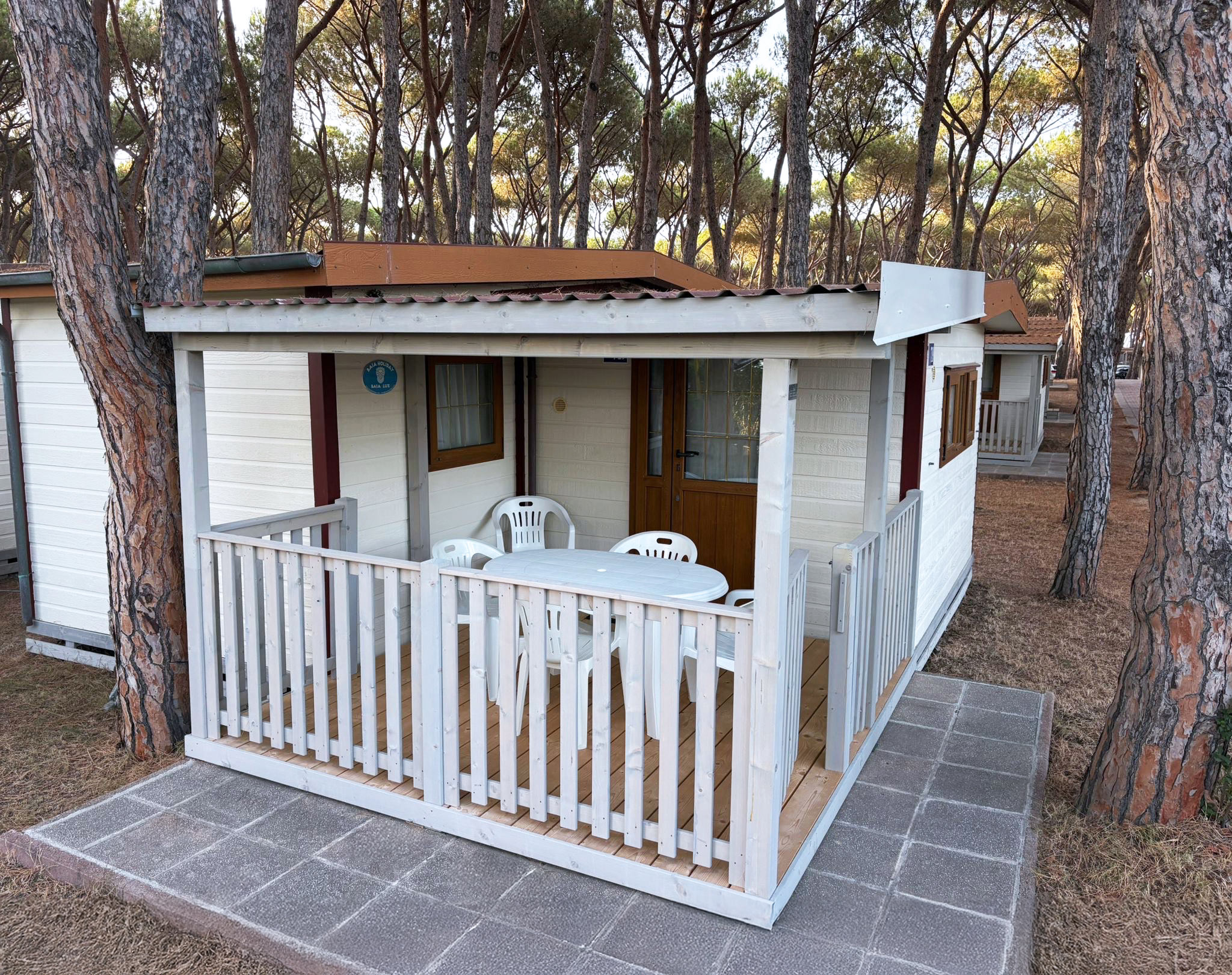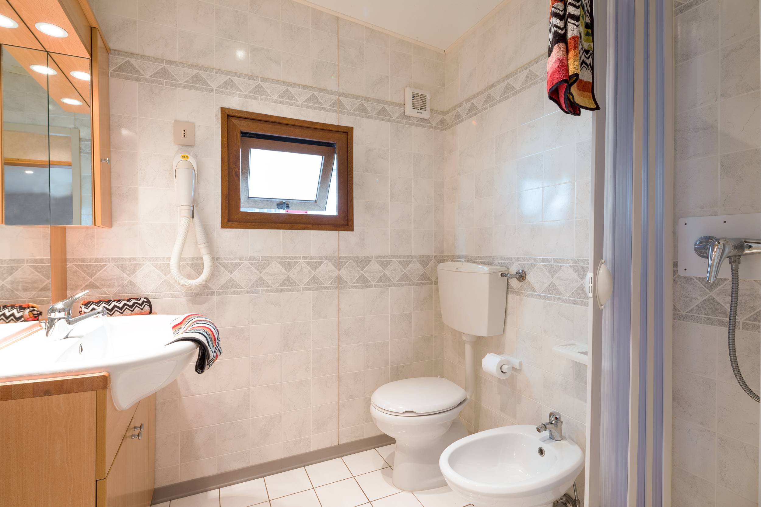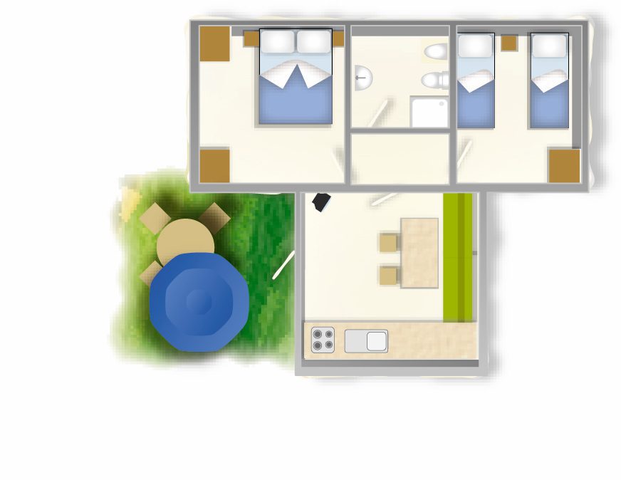 Es hat eine Fläche von ca. 31 m² und kann maximal vier Erwachsene beherbergen. Sie besteht aus einem Wohnzimmer mit einem Tisch, Stühlen und einem Sofa, einer Küchenzeile, die mit einem Kühlschrank mit Gefrierfach, einem 4-Flammen-Herd, einer Spüle, Töpfen, Pfannen und Geschirr ausgestattet ist. Der Schlafbereich besteht aus 2 Zimmern, eines mit einem Doppelbett und ein großzügiges Zimmer mit 2 Einzelbetten, die auf Wunsch zusammengefügt werden können. Die Unterkunft ist mit 1 geräumigen Badezimmer mit WC, Dusche, Bidet und Waschbecken ausgestattet. Draußen gibt es eine Holzveranda mit Tisch und Stühlen, auf der Sie entspannte Momente genießen können.