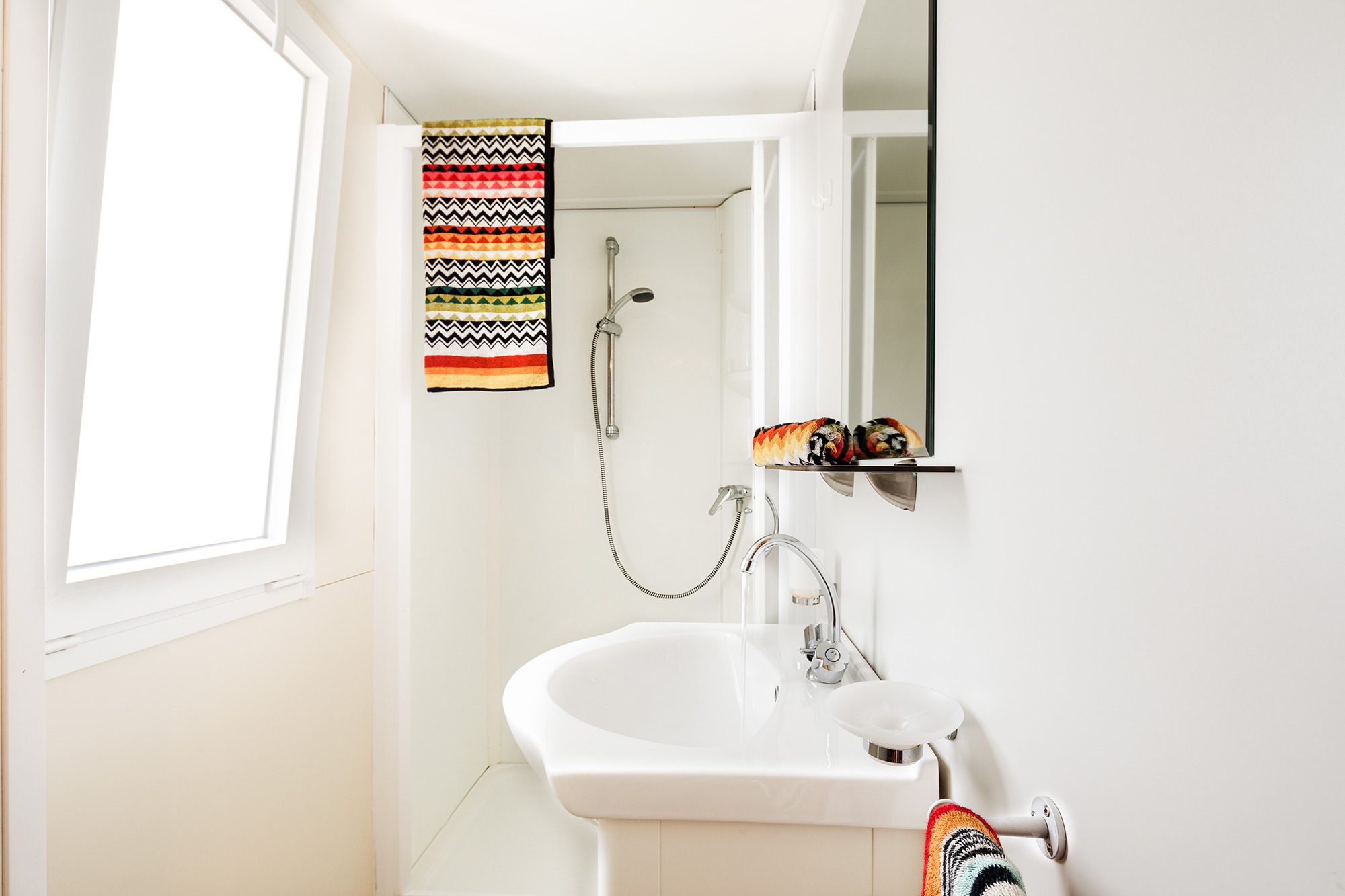 Es hat eine Fläche von ca. 24 m² und bietet Platz für maximal 4 Erwachsene und 2 Kinder. Sie besteht aus einem Wohnzimmer mit einem Tisch, Stühlen, einem Schlafsofa, einer Küchenzeile mit einem Kühlschrank mit Gefrierfach oder einem Kühlschrank mit Gefrierfach, einem 4-flammigen Kochfeld, einer Spüle, Töpfen und Pfannen sowie Geschirr. Der Schlafbereich besteht aus 2 Zimmern, eines mit einem Doppelbett und eines mit 2 Einzelbetten plus einem dritten erhöhten Bett. Die Unterkunft verfügt über 1 Badezimmer, das in 2 Räume aufgeteilt ist: 1 Dusche und Waschbecken und 1 Toilette und Waschbecken. Eine überdachte Holzterrasse oder ein weißer Pavillon mit einem Tisch und Stühlen vervollständigen die Unterkunft.