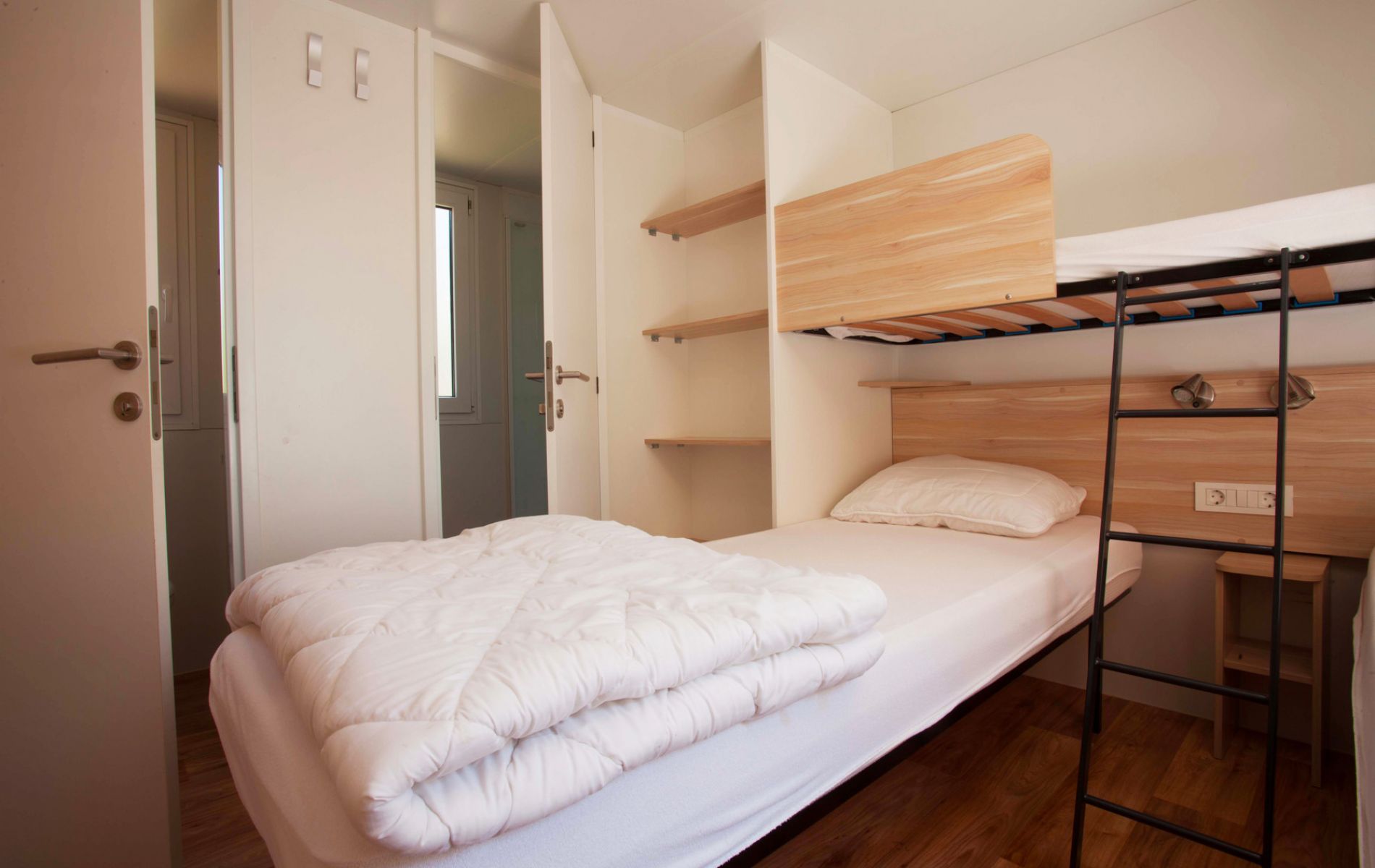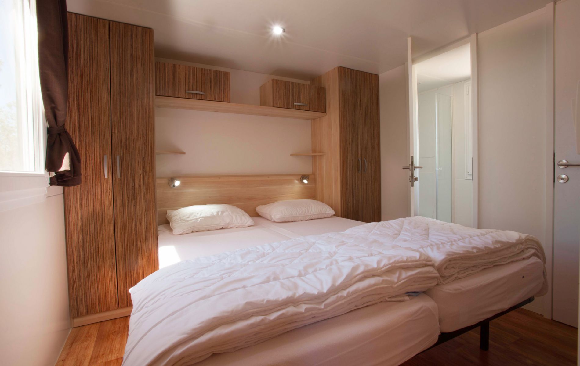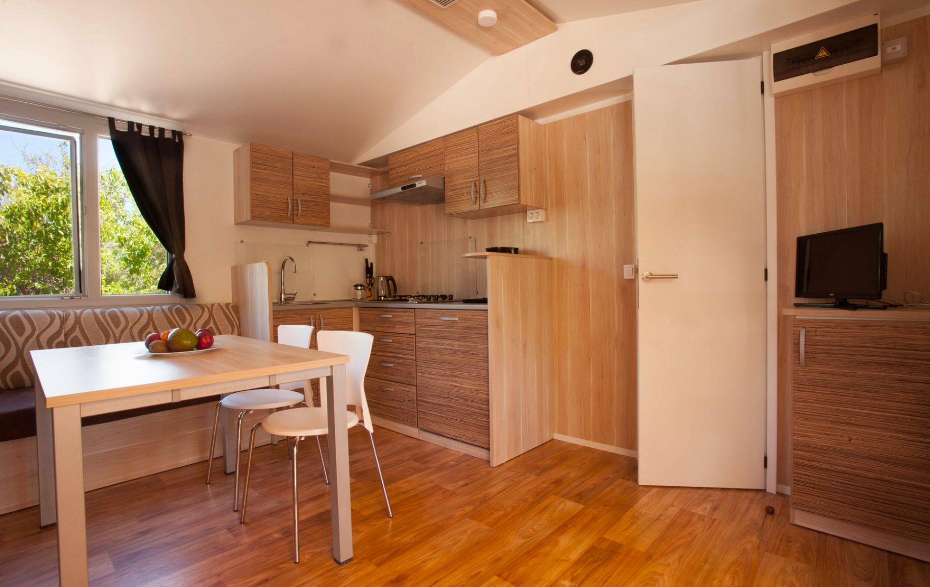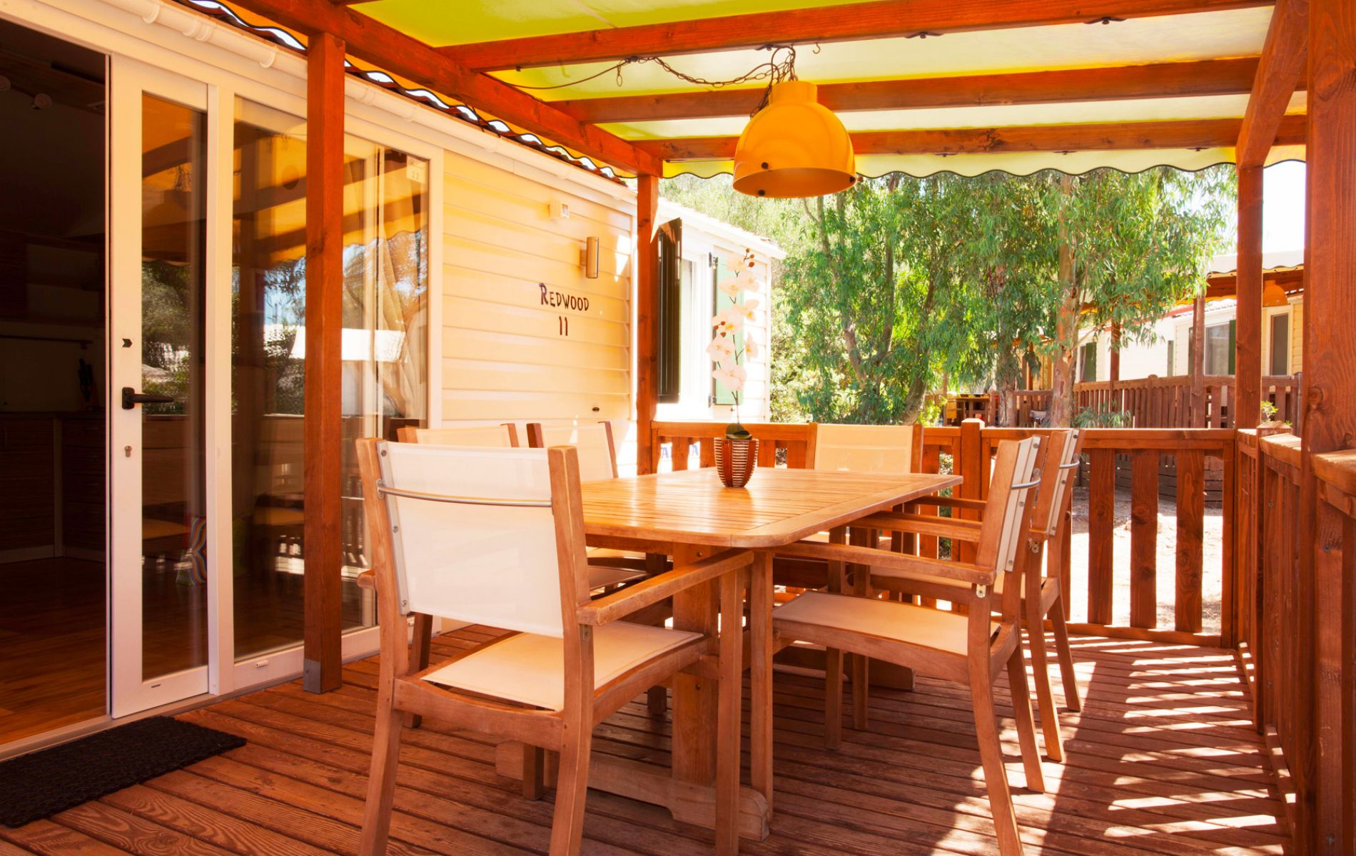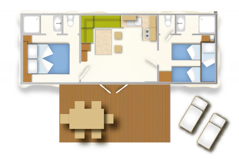 Es hat eine Fläche von ca. 34 m² und kann maximal 4 Erwachsene und 1 Kind beherbergen. Es besteht aus einem Wohnzimmer mit Tisch und Stühlen, einer Küchenzeile mit Kühlschrank, 4-Flammen-Herd, Spüle, Töpfen und Geschirr. Der Schlafbereich besteht aus 2 Zimmern, eines mit einem Doppelbett und eines mit 2 Einzelbetten plus einem dritten erhöhten Bett. Die Unterkunft verfügt über 2 komplette Bäder mit Dusche, Toilette und Waschbecken. Draußen befindet sich eine geräumige überdachte Holzveranda mit einem Tisch, Stühlen und zwei Sonnenliegen.