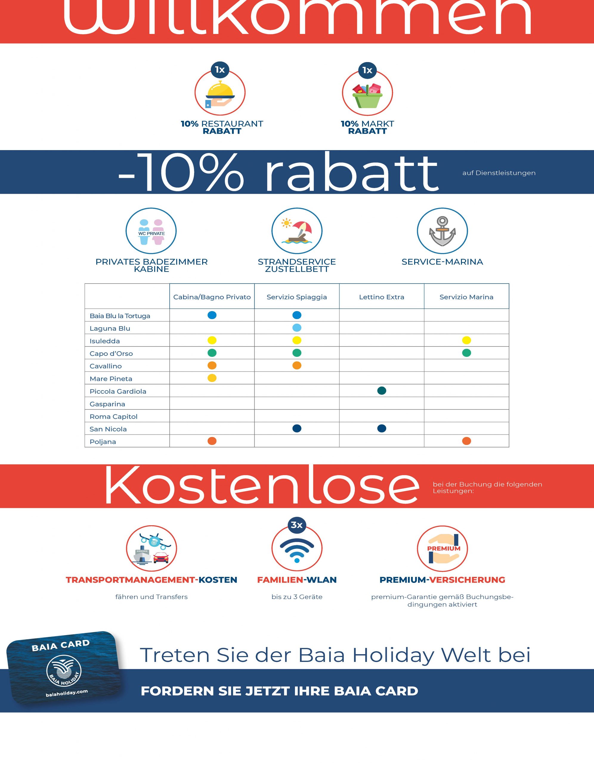 Baia Card ist die ” Vorteils-Karte “, die Ihnen Zugang zu exklusiven Vergünstigungen vor und während Ihres Aufenthaltes gibt!