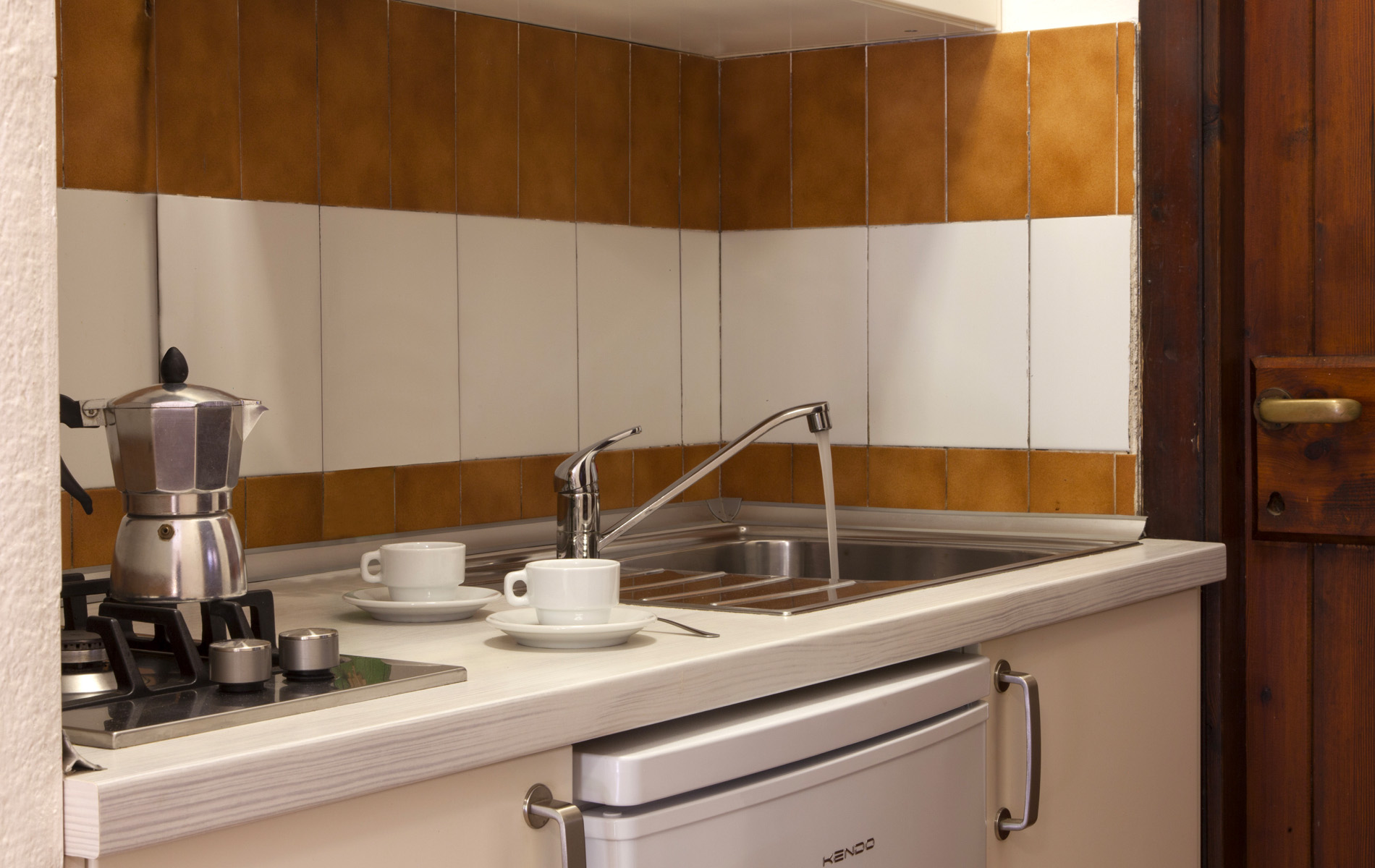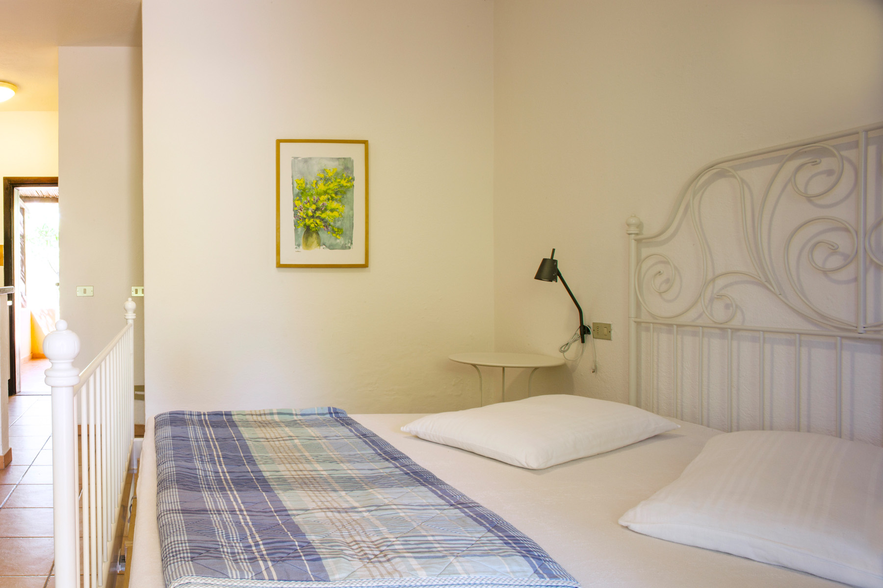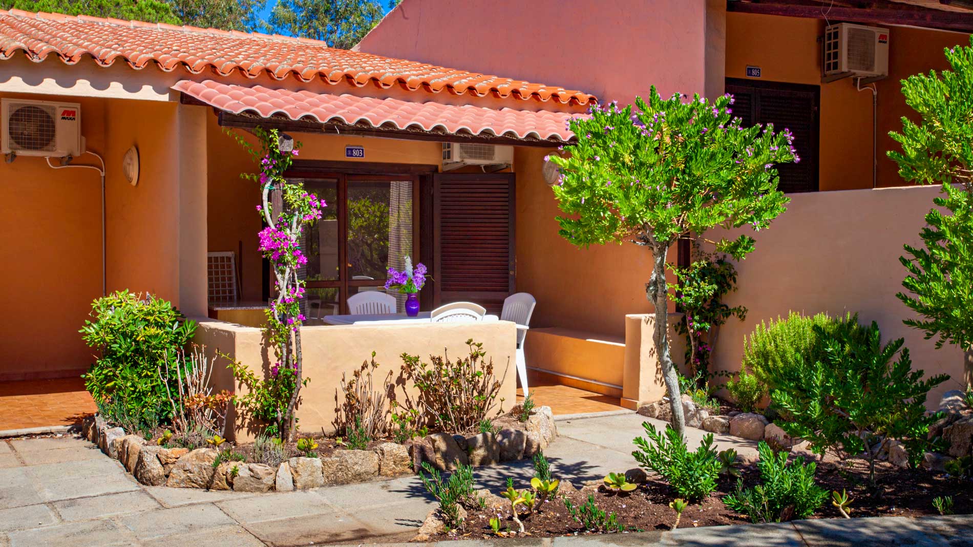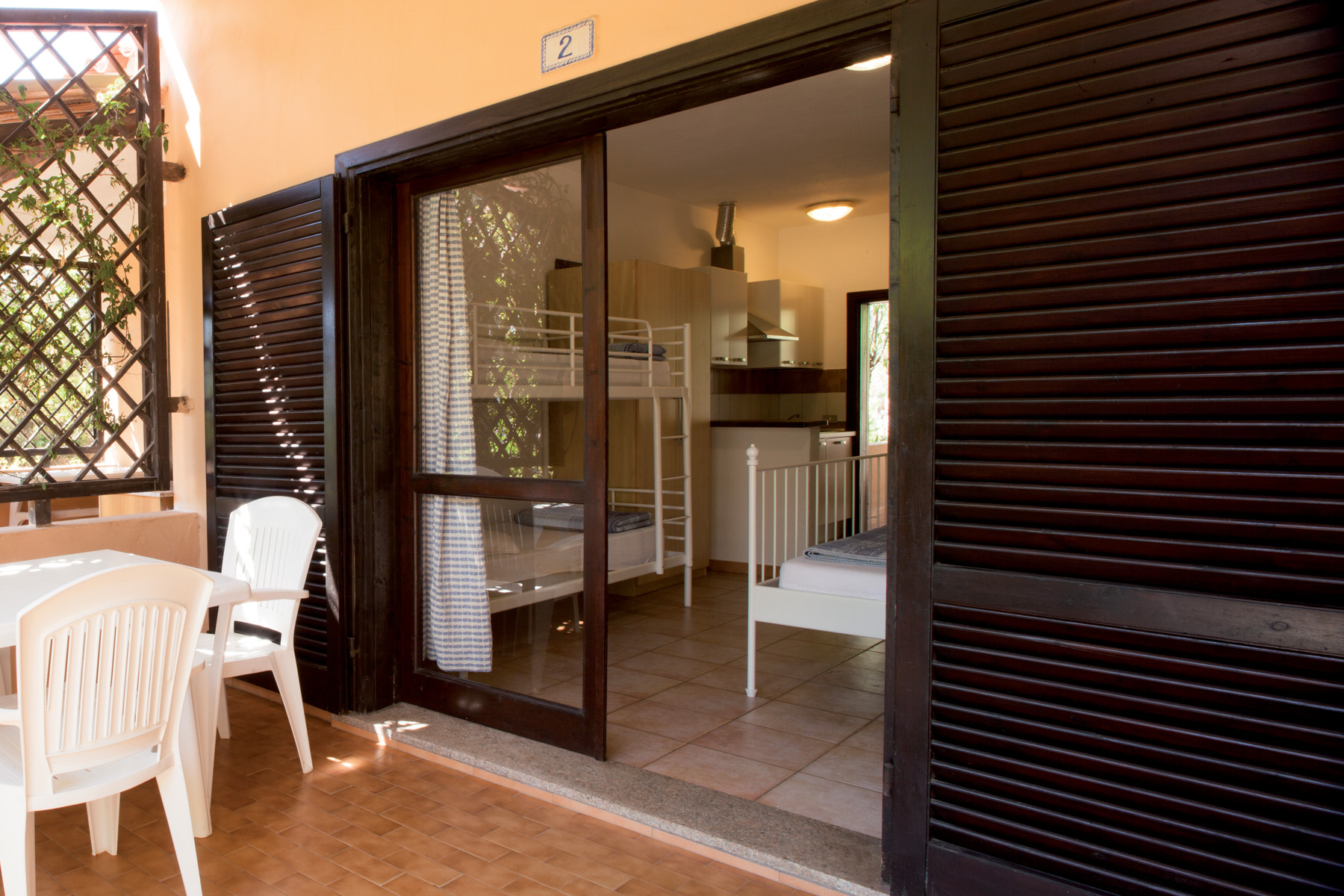 Gemauerte Struktur mit einer Fläche von ca. 21 m², die maximal 2 Erwachsene und 2 Kinder beherbergen kann (1 Doppelbett und 1 Etagenbett im Wohnbereich). Es besteht aus einem Einzelzimmer mit einer Küchenzeile mit Spüle und Kühlschrank, einem Badezimmer mit WC, Dusche, Bidet und Waschbecken und einer Veranda mit Tisch und Stühlen im Freien. Besteck, Geschirr, Decken und Kissen sind in den Bungalows vorhanden, und in einigen Einheiten gibt es einen Fernseher. Klimaanlage ist in einigen Einheiten gegen Aufpreis verfügbar.
