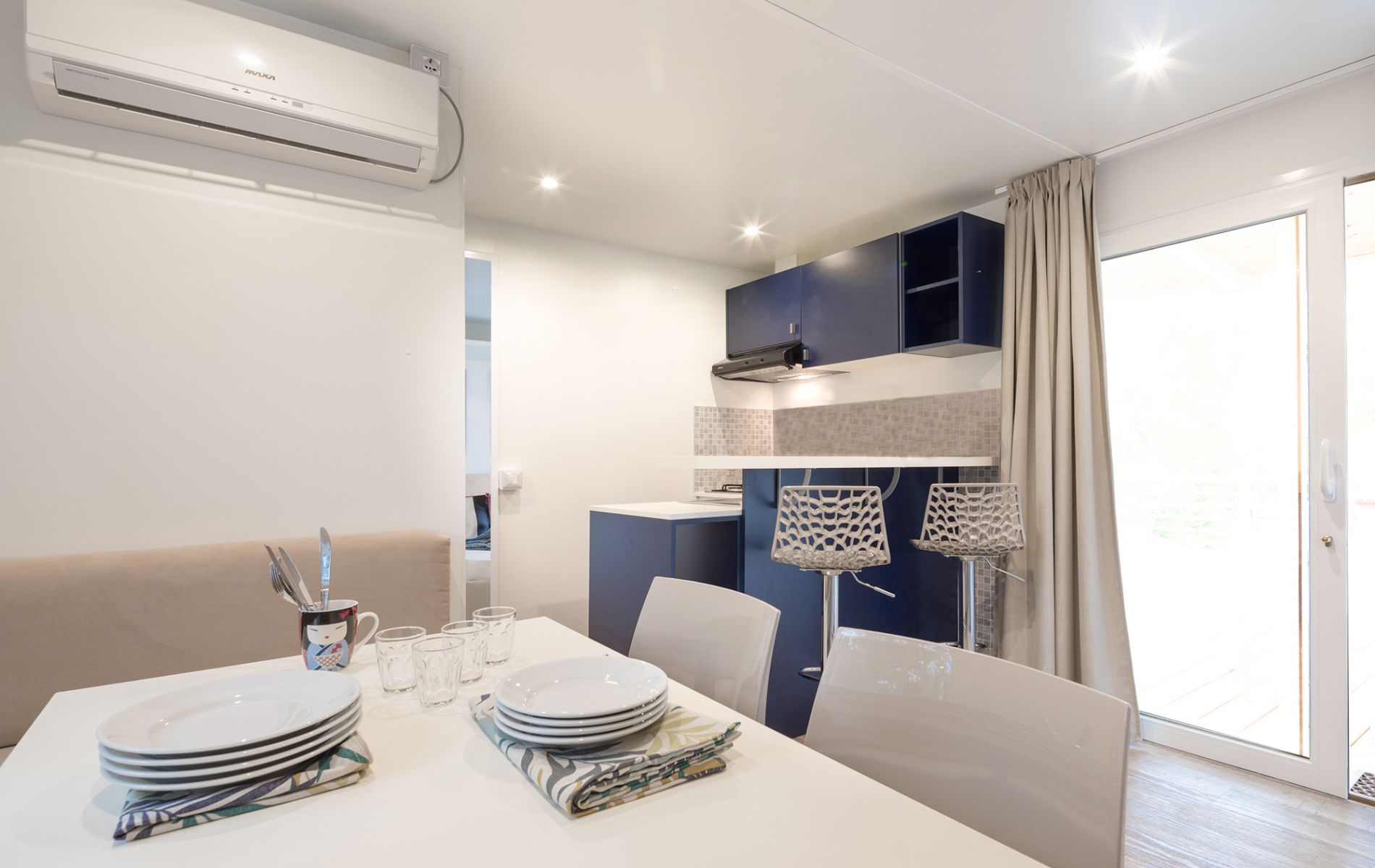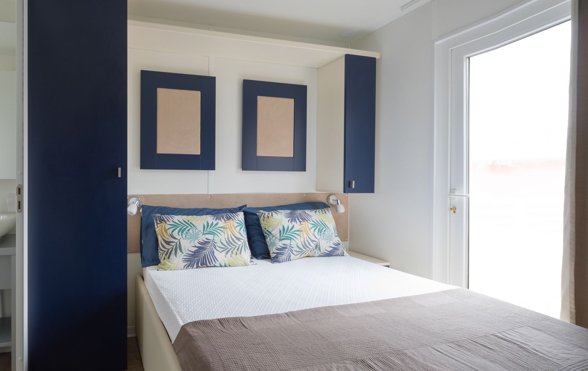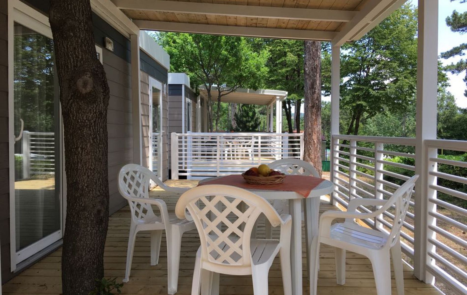 Das frische, junge und gemütliche Mobilheim Baia Elite mit einer Fläche von ca. 33 m² ist für Familien oder Gruppen von Freunden mit bis zu 6 Personen gedacht. Die Inneneinrichtung ist modern und komfortabel: eine Küchenecke mit Halbinsel (Halbinsel nur in einigen Unterkünften vorhanden), komplett mit 4-Flammen-Herd, Spüle, Töpfen und Geschirr sowie einem großen Kühlschrank mit Gefrierfach. Die große Fenstertür, die auf die geräumige Holzveranda führt, verleiht dem geräumigen Wohnzimmer, das mit einem Sofa, einem Tisch und Stühlen ausgestattet ist, Helligkeit. Die Unterkunft wird vervollständigt durch einen Schlafbereich mit 3 Schlafzimmern, eines mit einem Doppelbett und 2 mit 2 Einzelbetten, ein komplettes Badezimmer mit WC, Dusche, Waschbecken und 1 Badezimmer mit WC und Waschbecken.
