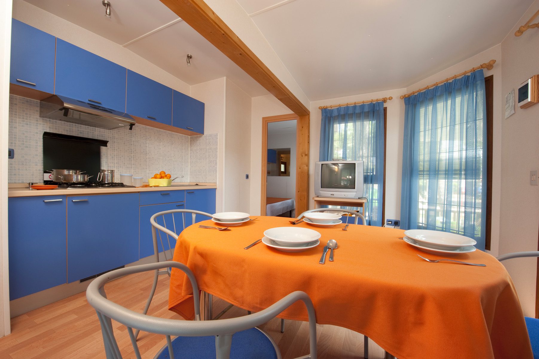 Das helle und gemütliche Mobilheim Baia Panoramic ist ca. 30 m² groß und kann bis zu 4 Personen beherbergen. Sie besteht aus einem großen Wohnzimmer mit Tisch und Stühlen, einer Küchenzeile mit Kühlschrank mit Gefrierfach, einem 4-Flammen-Herd, einer Spüle, Töpfen und Pfannen sowie Geschirr. Mit seinen 2 Doppelschlafzimmern ist es die perfekte Lösung für 2 zusammen reisende Paare. Jedes der 2 Zimmer verfügt über ein eigenes Badezimmer mit Dusche, Waschbecken, Bidet und Toilette. Draußen gibt es einen Pavillon mit Tisch und Stühlen, in dem Sie Momente der Entspannung genießen können.