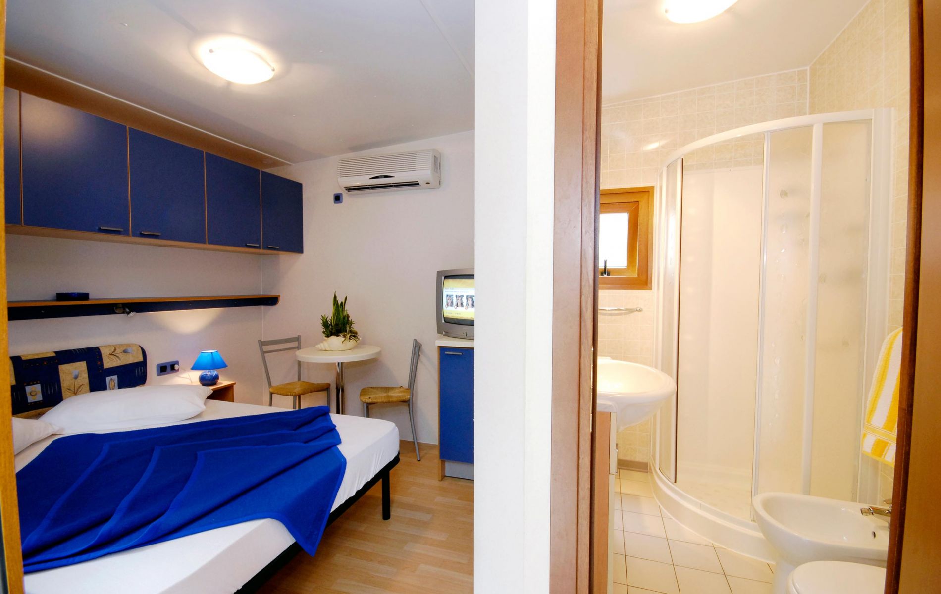 Die Blu Resort Lösungen sind 15 m² große Zimmer, die aus einem Doppelbett und einem Einzelbett bestehen und all jenen Komfort und Bequemlichkeit bieten, die einen Urlaub im Grünen verbringen möchten. Sie sind mit einem kompletten Badezimmer mit Toilette, Dusche, Bidet und Waschbecken ausgestattet. Es gibt eine Minibar für kühle Getränke und draußen befindet sich eine angenehme Veranda mit Sonnenschirm, Tisch und Stühlen, wo Sie sich entspannen können. Da die Zimmer nicht über eine Küche verfügen, können sie auch in Kombination mit Halb- oder Vollpension gebucht werden.