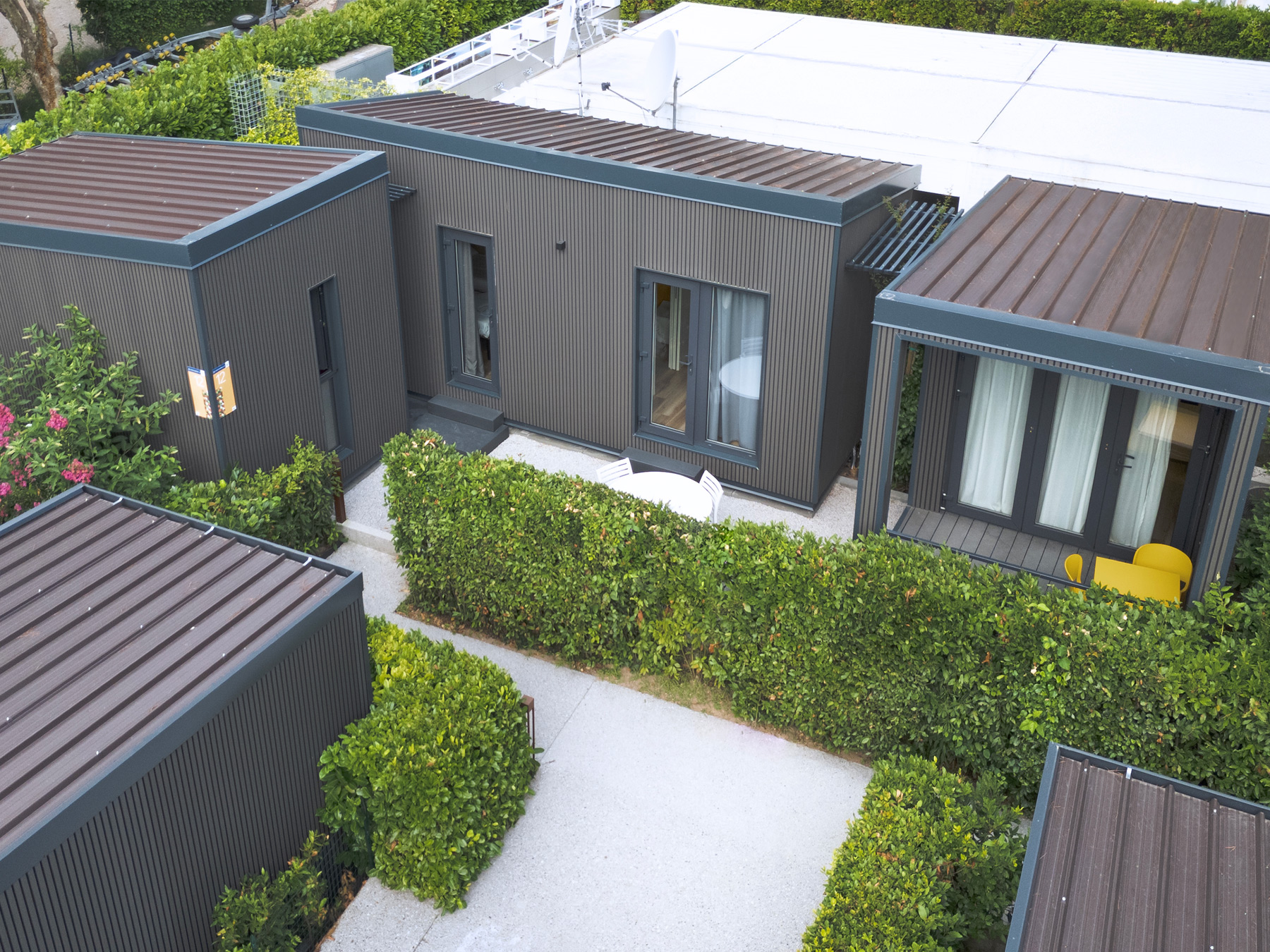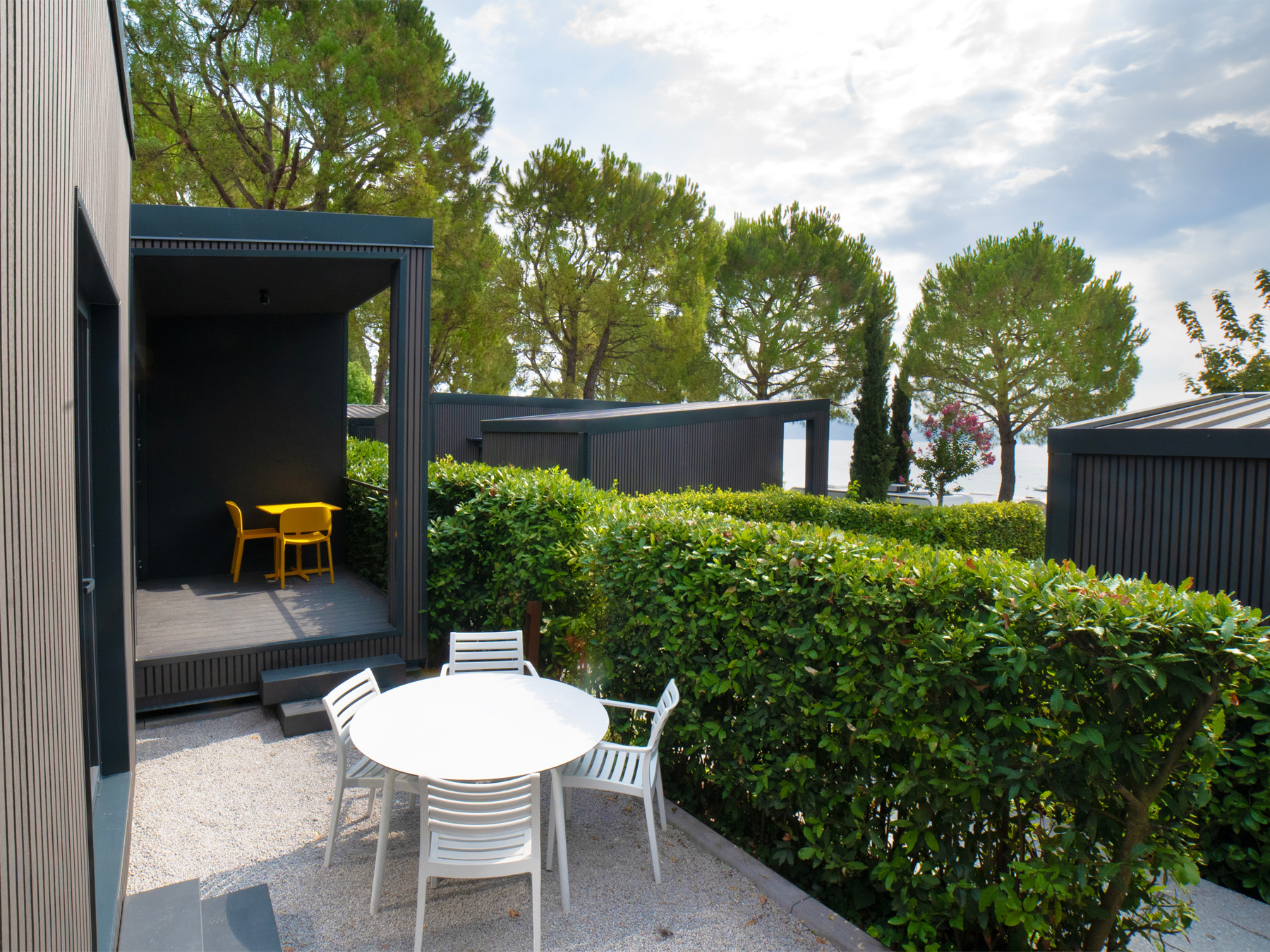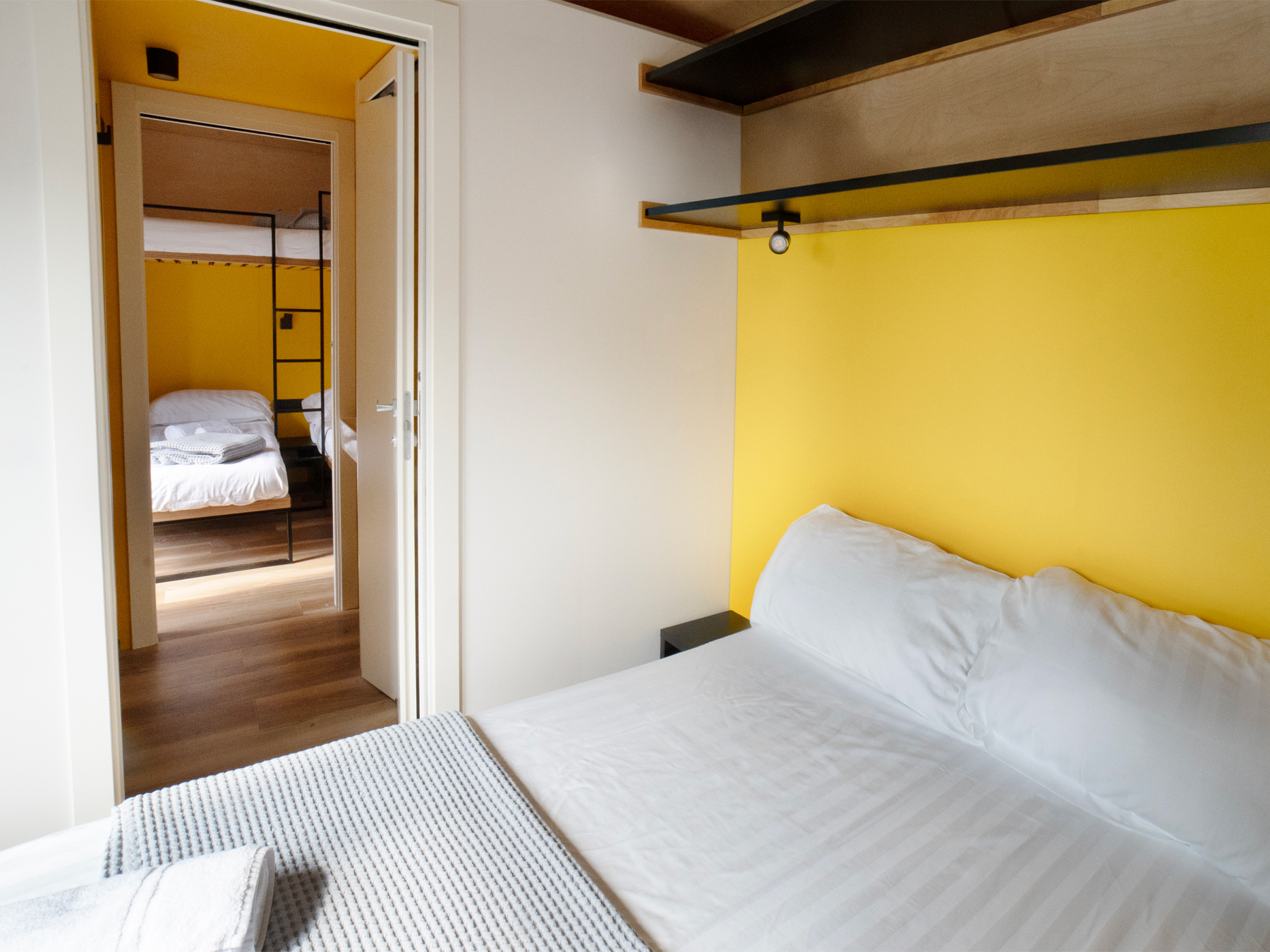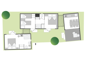 Die neue Lodge ist frisch, jung und gemütlich und bietet Platz für bis zu sieben Personen. Eine neue Konzeptidee, die aus 3 Wohnmodulen besteht: 2 Schlafbereiche und 1 Küchenbereich. Die Inneneinrichtung ist modern und komfortabel: eine Küche mit Tisch, Stühlen, 4-Flammen-Herd, Spüle, Töpfen und Geschirr und ein großer Kühlschrank mit Gefrierfach. Die große Fenstertür, die auf die geräumige Holzveranda führt, verleiht dem geräumigen Wohnzimmer Helligkeit. Das erste Modul besteht aus einem Doppelzimmer mit eigenem Bad, das zweite Modul hat ein Doppelzimmer, ein Zimmer mit zwei Einzelbetten und einem Flaggenbett und ein eigenes Bad; schließlich gibt es eine separate Küche.