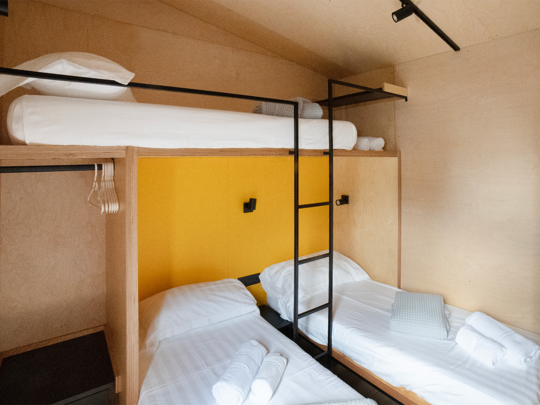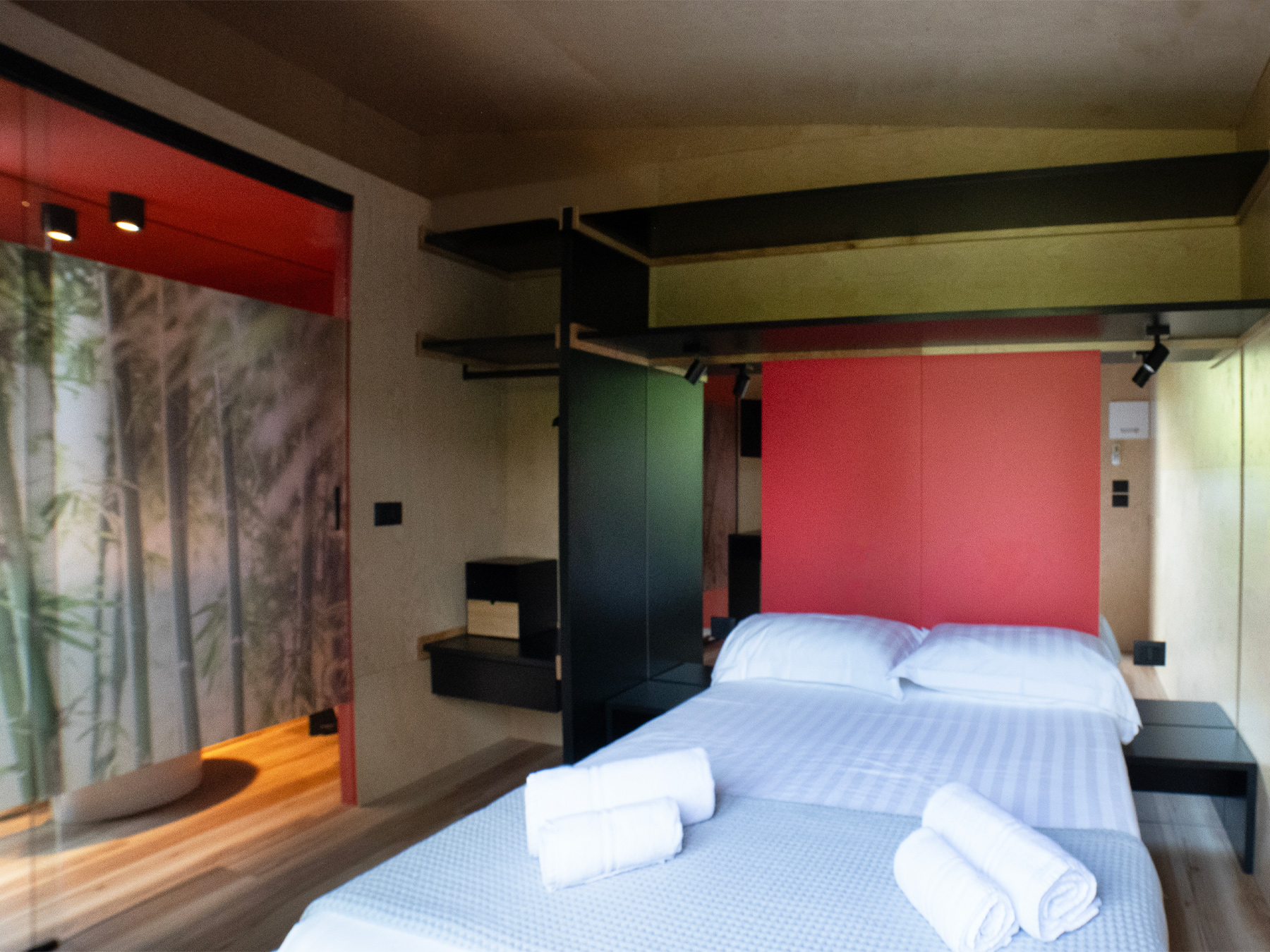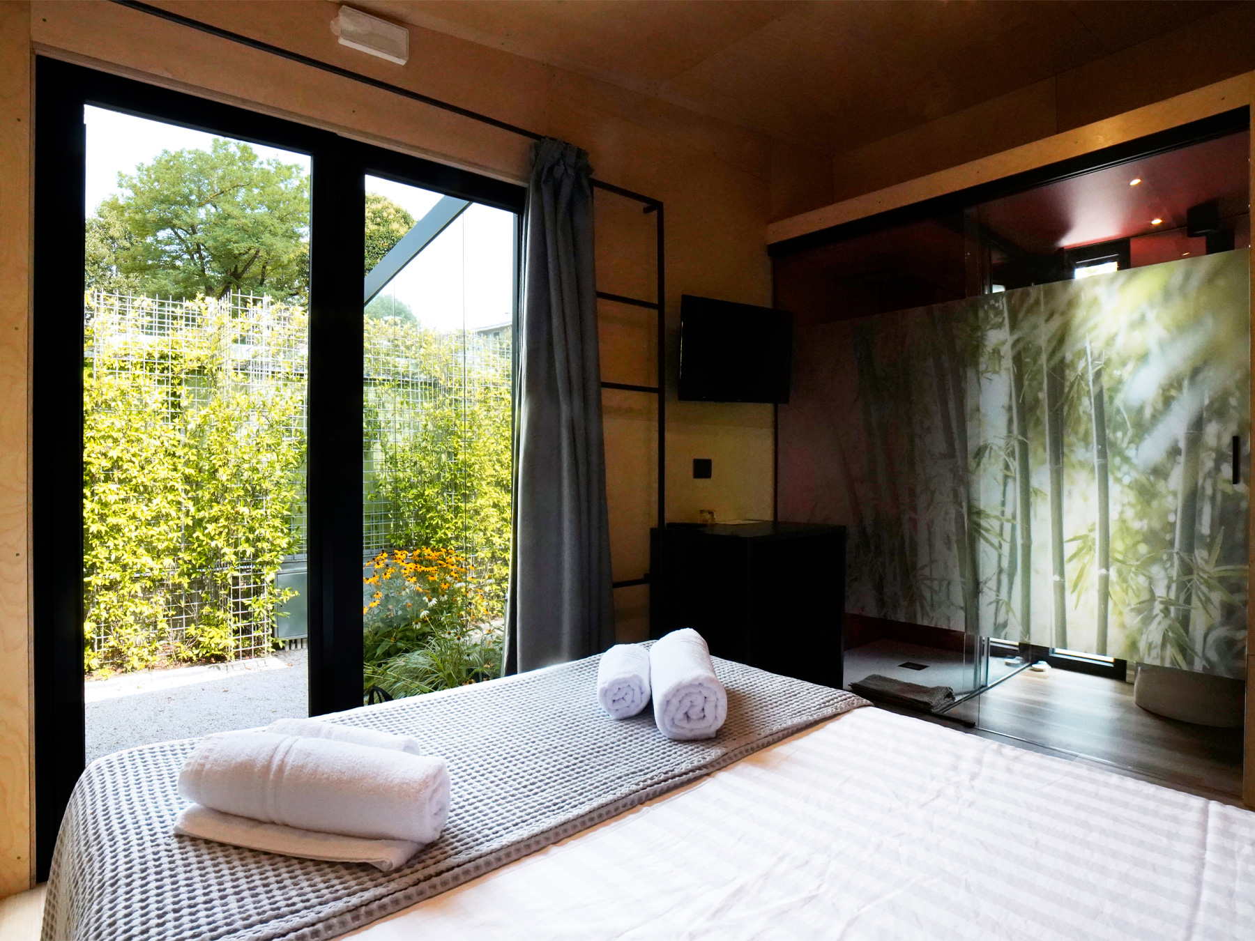 Die neue Lodge ist frisch, jung und gemütlich und bietet Platz für bis zu sieben Personen. Eine neue Konzeptidee, die aus 3 Wohnmodulen besteht: 2 Schlafbereiche und 1 Küchenbereich. Die Inneneinrichtung ist modern und komfortabel: eine Küche mit Tisch, Stühlen, 4-Flammen-Herd, Spüle, Töpfen und Geschirr und ein großer Kühlschrank mit Gefrierfach. Die große Fenstertür, die auf die geräumige Holzveranda führt, verleiht dem geräumigen Wohnzimmer Helligkeit. Das erste Modul besteht aus einem Doppelzimmer mit eigenem Bad, das zweite Modul hat ein Doppelzimmer, ein Zimmer mit zwei Einzelbetten und einem Flaggenbett und ein eigenes Bad; schließlich gibt es eine separate Küche.