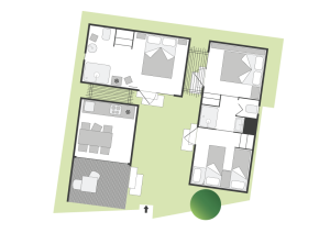 Das erste Modul besteht aus einem Doppelzimmer mit eigenem Bad, das zweite Modul hat ein Doppelzimmer, ein Zimmer mit zwei Einzelbetten und einem Flaggenbett und ein eigenes Bad; schließlich gibt es eine separate Küche.