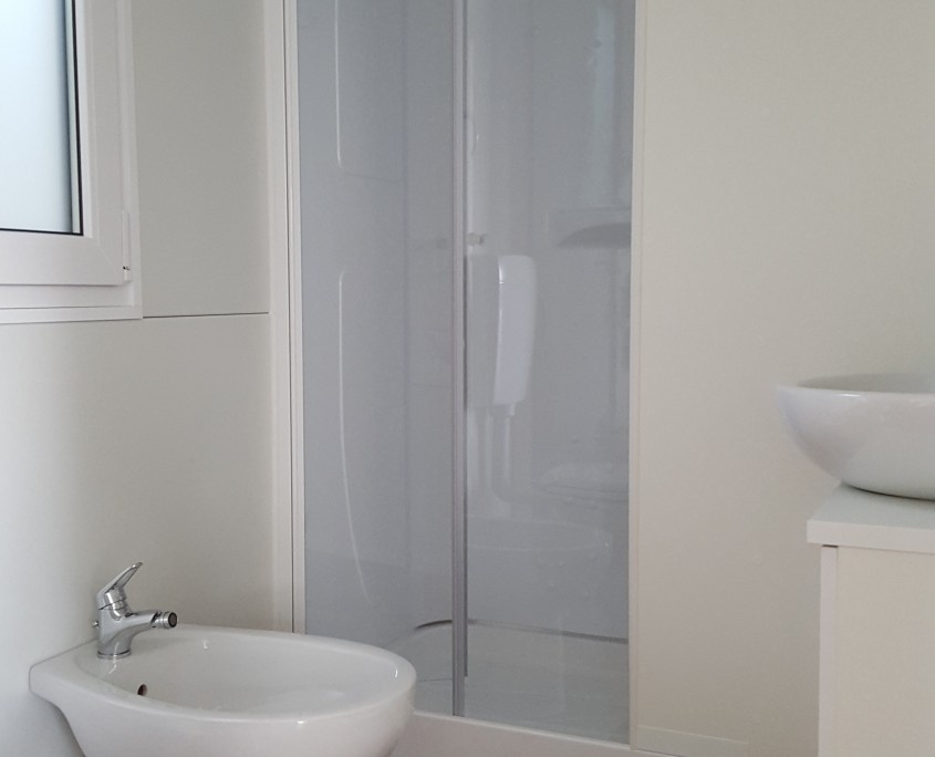 Es gibt ein Badezimmer mit Toilette, Dusche, Waschbecken und Bidet.