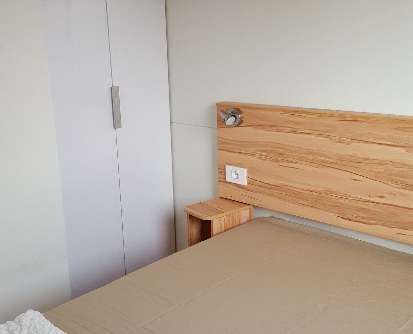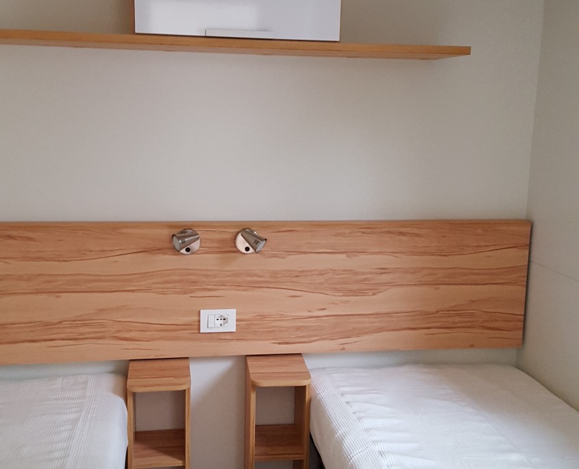Der Schlafbereich verfügt über ein Schlafzimmer mit Doppelbett und ein Schlafzimmer mit zwei Einzelbetten.