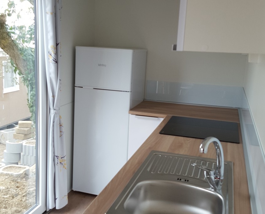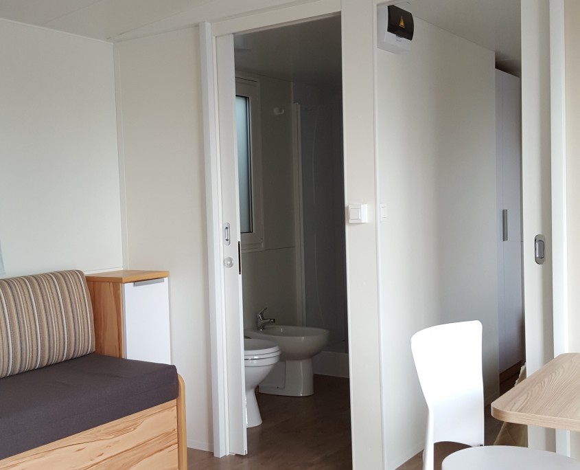 Der Wohnbereich besteht aus einem Wohnzimmer, das mit einem Tisch, Stühlen und einem Doppelschlafsofa ausgestattet ist, sowie einer Küchenzeile mit Kochfeld, Spüle, Kühlschrank mit Gefrierfach, Mikrowelle, elektrischer Kaffeemaschine und Wasserkocher.