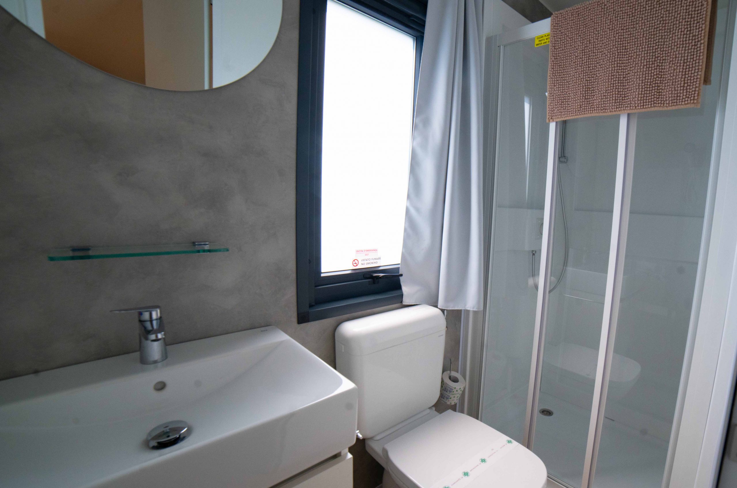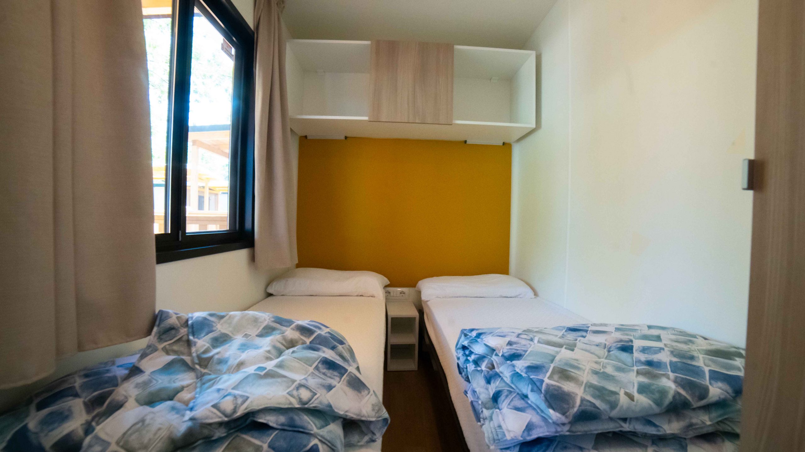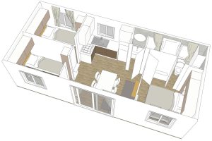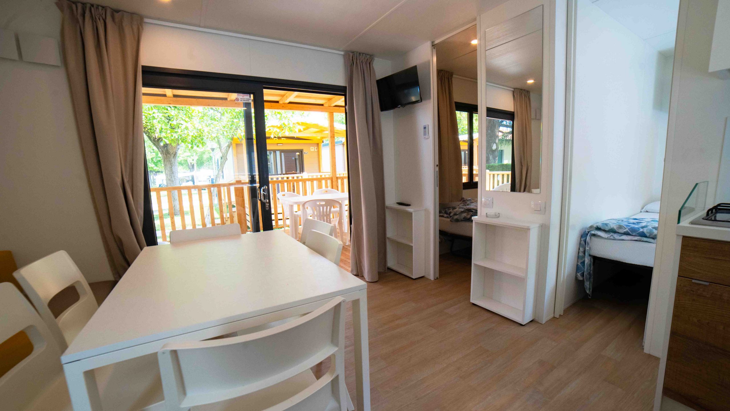 Das frische, junge und gemütliche Mobilhome Baia Elite Plus mit einer Fläche von ca. 33 Quadratmetern ist für Familien oder Gruppen von Freunden mit bis zu 6 Personen konzipiert. Die Inneneinrichtung ist modern und komfortabel: eine Küchenecke mit Halbinsel (Halbinsel nur in einigen Unterkünften vorhanden), komplett mit 4-Flammen-Herd, Spüle, Töpfen und Geschirr sowie einem großen Kühlschrank mit Gefrierfach. Die große Fenstertür, die auf die geräumige Holzveranda führt, verleiht dem geräumigen Wohnzimmer, das mit einem Sofa, einem Tisch und Stühlen ausgestattet ist, Helligkeit. Die Unterkunft wird vervollständigt durch einen Schlafbereich mit 3 Schlafzimmern, eines mit einem Doppelbett und 2 mit 2 Einzelbetten, ein komplettes Badezimmer mit WC, Dusche, Waschbecken und 1 Badezimmer mit WC und Waschbecken.