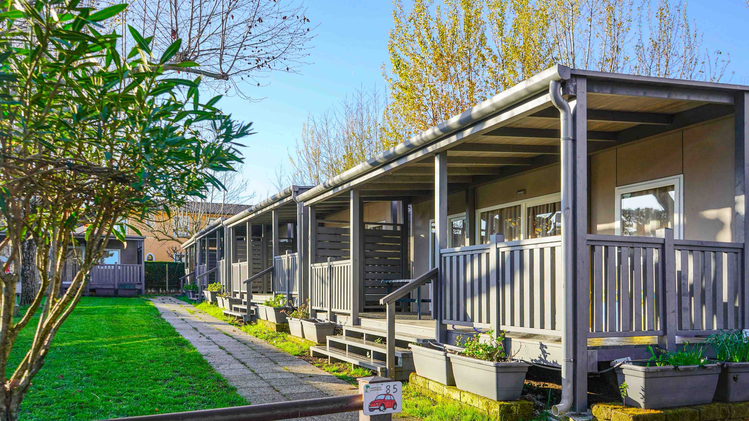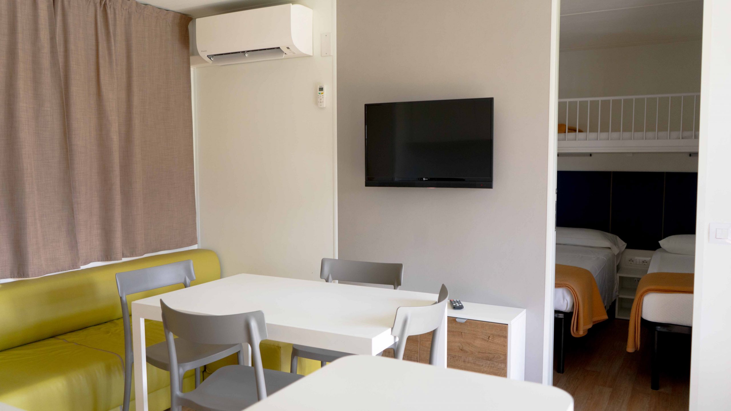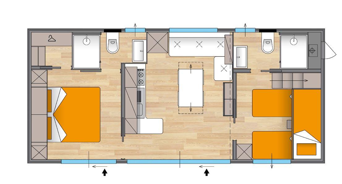 Die Inneneinrichtung ist komplett und komfortabel: Küchenzeile mit Herd, Kühlschrank mit Gefrierfach, Wohnzimmer mit Sofa und TV, Schlafzimmer mit Doppelbett, Schlafzimmer mit 3 Einzelbetten, von denen eines erhöht ist, 2 Bäder mit Dusche, Waschbecken und Toilette sowie Kleiderschränke für Kleidung. Draußen gibt es einen kleinen Garten mit Tisch und Stühlen und eine erhöhte Holzterrasse. Ausstattung: Strom-, Wasser- und Gasversorgung, Geschirr, Decken, TV, Parkplatz.