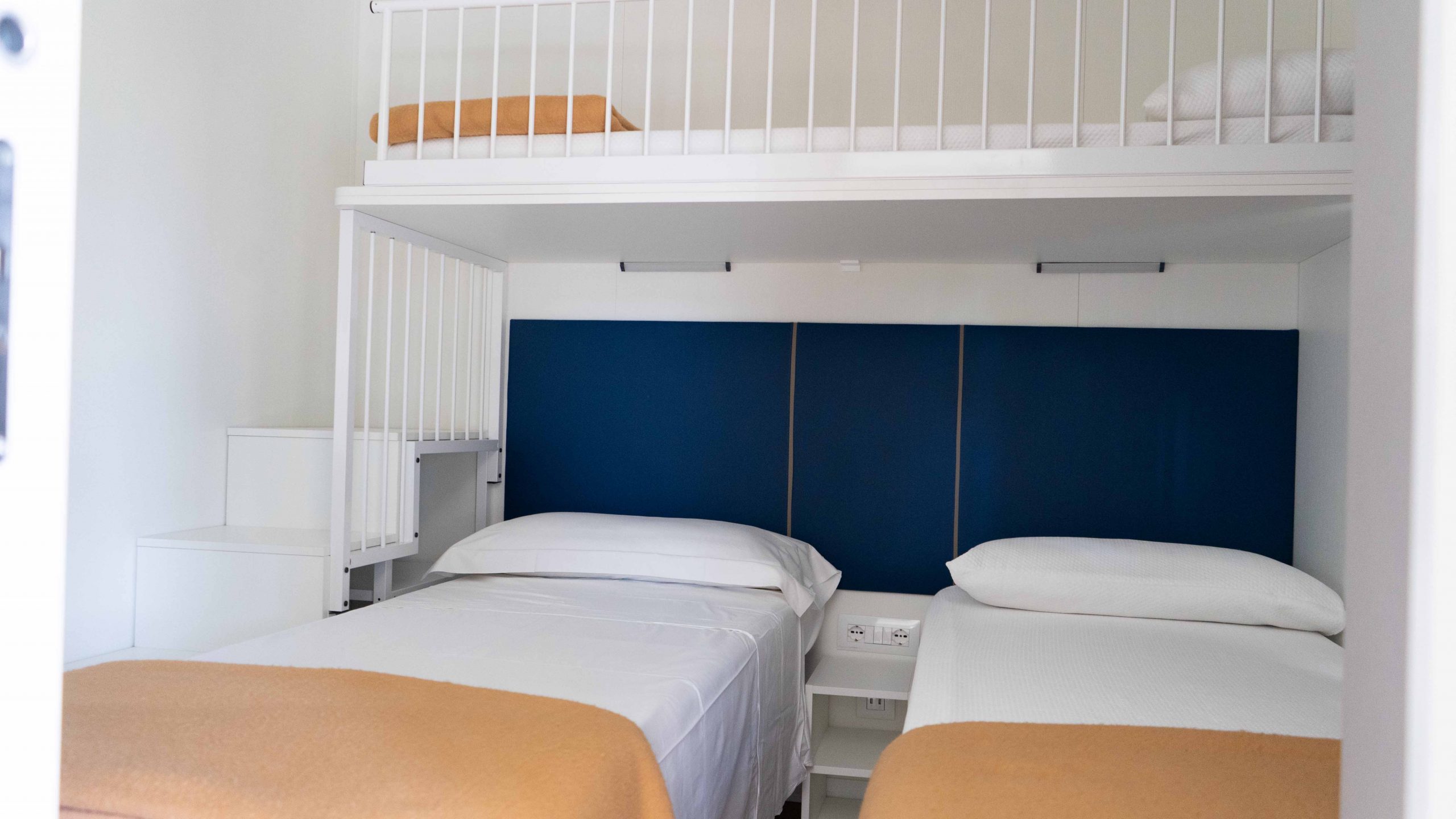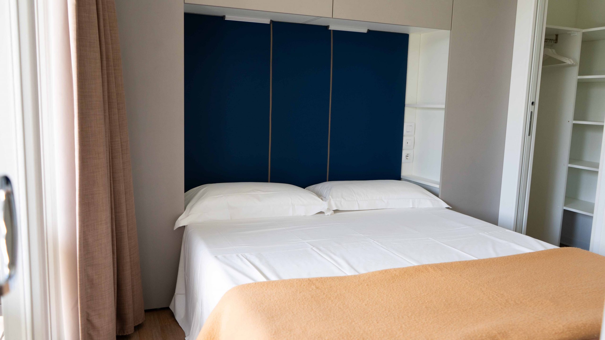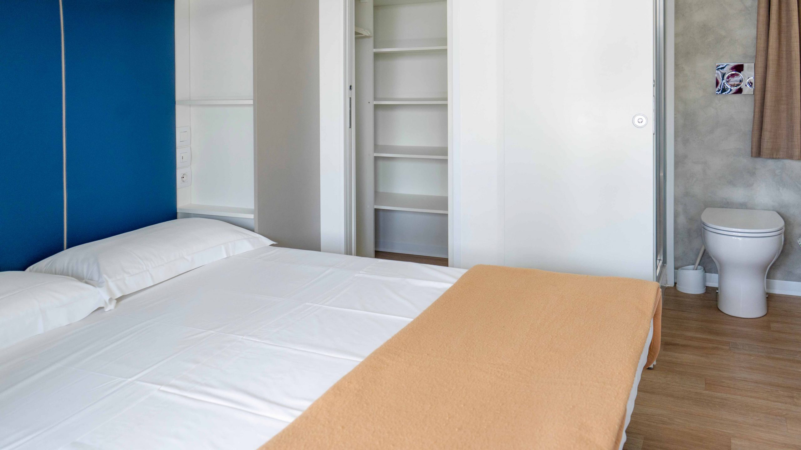 Die Inneneinrichtung ist komplett und komfortabel: Küchenzeile mit Herd, Kühlschrank mit Gefrierfach, Wohnzimmer mit Sofa und TV, Schlafzimmer mit Doppelbett, Schlafzimmer mit 3 Einzelbetten, von denen eines erhöht ist, 2 Bäder mit Dusche, Waschbecken und Toilette sowie Kleiderschränke für Kleidung. Draußen gibt es einen kleinen Garten mit Tisch und Stühlen und eine erhöhte Holzterrasse. Ausstattung: Strom-, Wasser- und Gasversorgung, Geschirr, Decken, TV, Parkplatz.
