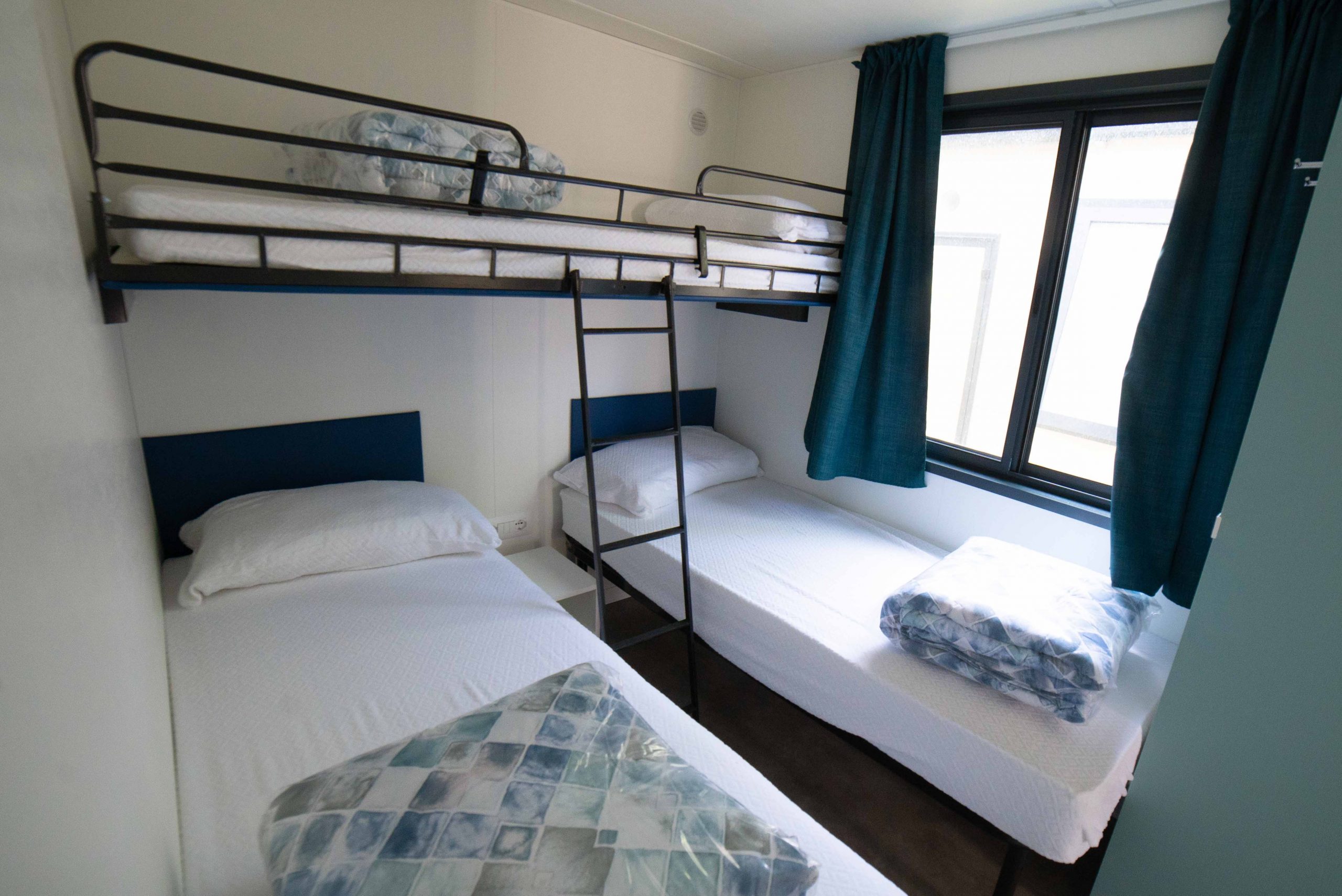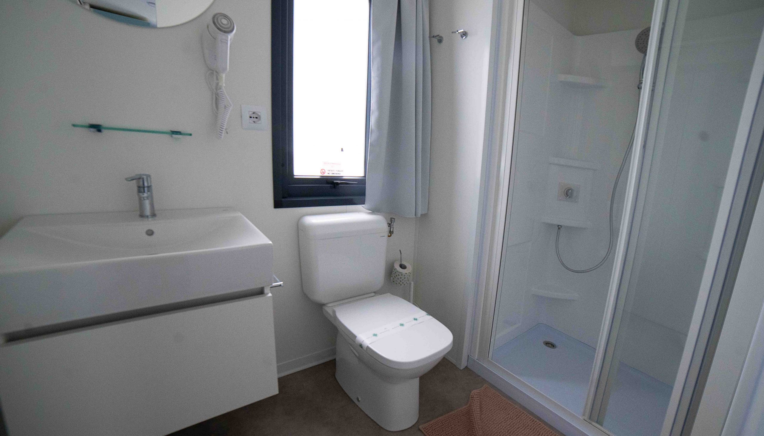 Es hat eine Fläche von ca. 25,5 m² und kann maximal 4 Personen und 1 Kind beherbergen. Sie besteht aus einem Wohnzimmer mit Tisch und Stühlen, einer Küchenzeile mit einem Kühlschrank mit Gefrierfach, einem 4-Flammen-Kochfeld, einer Spüle, Töpfen und Pfannen sowie Geschirr. Der Schlafbereich besteht aus 2 Zimmern, eines mit einem Doppelbett und eines mit 2 Einzelbetten und 1 Flagge. Die Unterkunft ist mit 1 kompletten Badezimmer mit WC, Dusche und Waschbecken ausgestattet. Auf der überdachten Holzveranda, die mit einem Tisch und Stühlen ausgestattet ist, können Sie das Leben im Freien genießen, wie es für einen Urlaub in der Natur typisch ist.