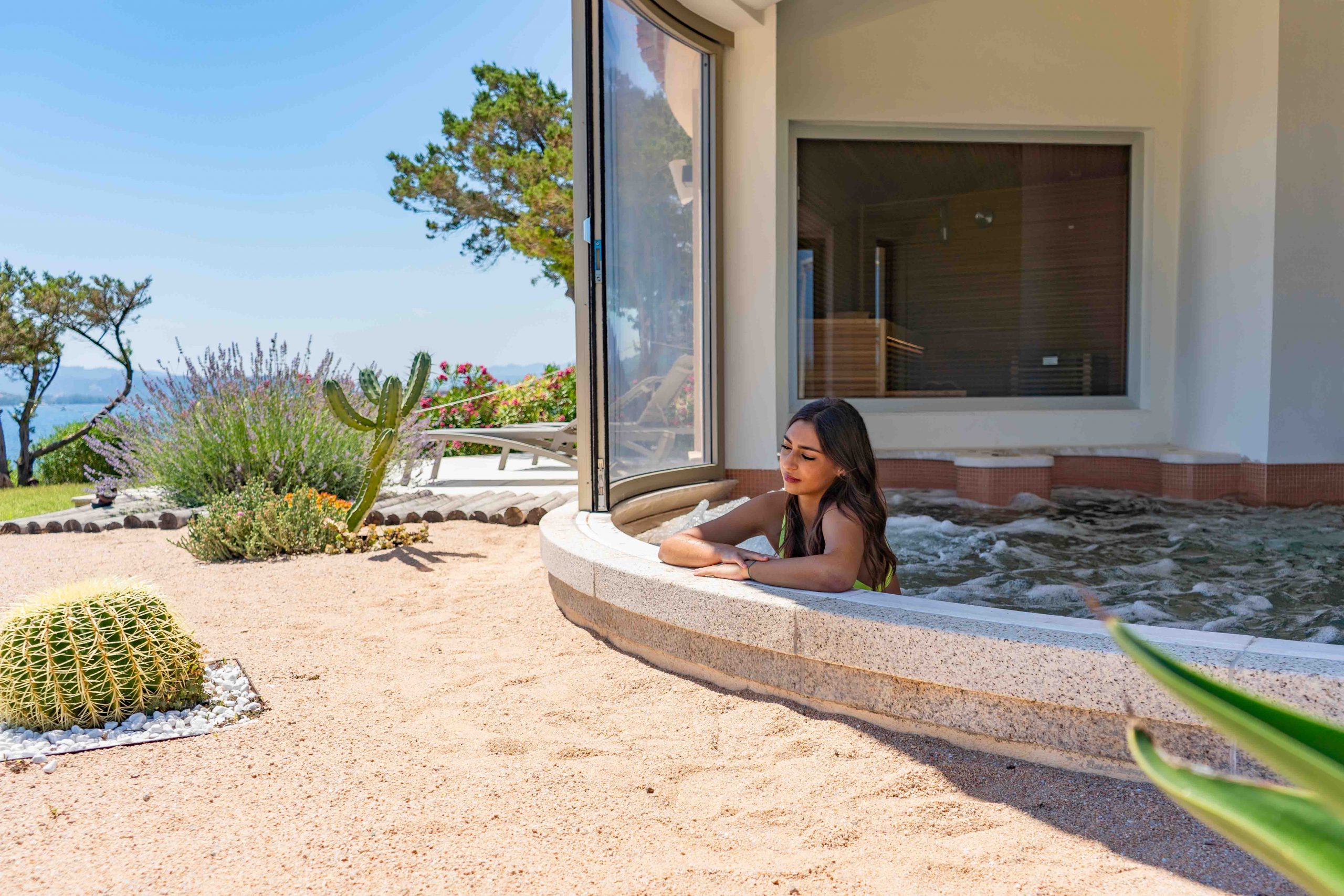 Es erwartet Sie eine umhüllende Atmosphäre, ein Wellnesspfad mit Whirlpool, Erlebnisduschen, Sauna und türkischem Bad, Tepidarium und Solariumpark direkt am sardischen Meer.
