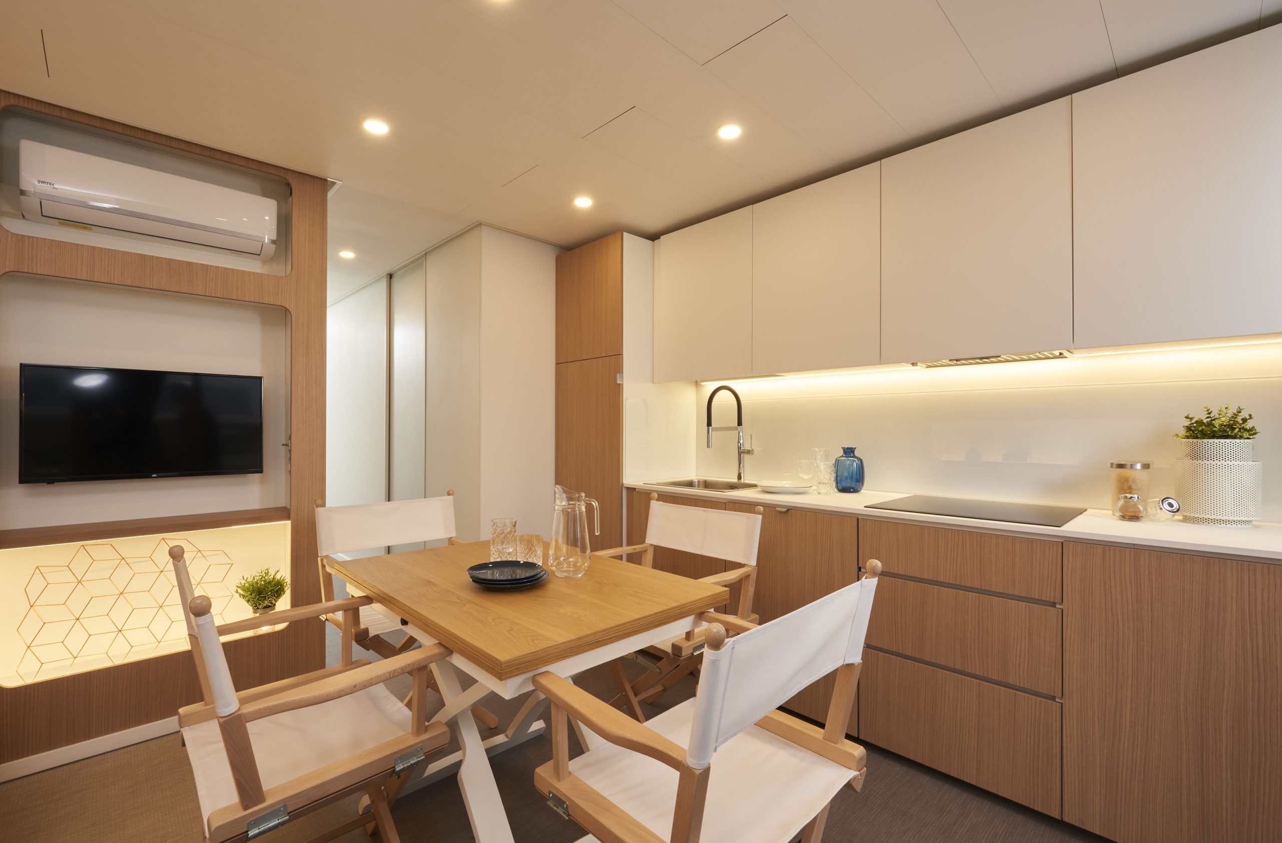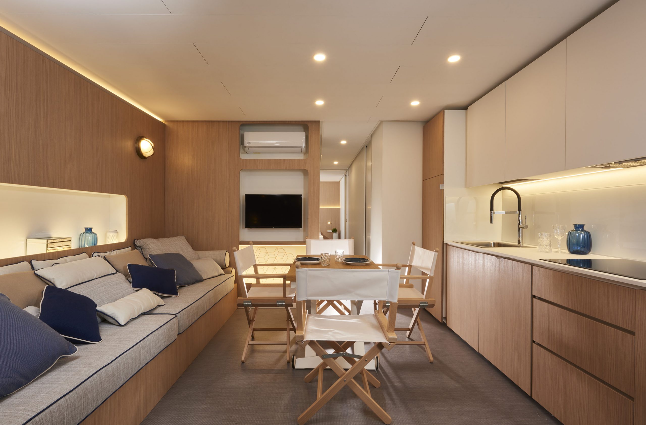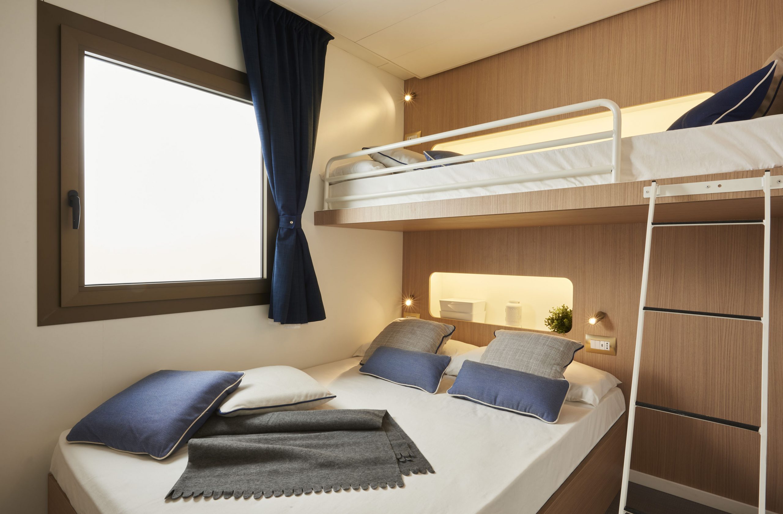 Das Gefühl von Luxus, das in ein Haus in einer natürlichen Umgebung transportiert wird: Wohn- und Gemeinschaftsräume, die sich auf das Wesentliche konzentrieren und durch geometrische Linien und Formen von minimalem Luxus gekennzeichnet sind. Das neue Mobilheim Baia Divina ist das Ergebnis einer Vereinigung, die das Made in Italy technologisch und handwerklich aufwertet. Es hat eine Fläche von etwa 40 m² und bietet Platz für maximal fünf Erwachsene. Sie besteht aus einem Wohnzimmer mit Tisch und Stühlen, einem bequemen Sofa und einer Küchenzeile, die mit einem Säulenkühlschrank mit Gefrierfach, einem Kochfeld, einer Spüle, Töpfen und Pfannen sowie Geschirr ausgestattet ist. Der Schlafbereich besteht aus 2 Zimmern, eines mit einem Doppelbett und eines mit einem französischen Bett und einem erhöhten Einzelbett. Die Unterkunft ist mit 2 kompletten Badezimmern mit WC, Dusche, Bidet und Waschbecken ausgestattet. Draußen gibt es eine teilweise überdachte Holzveranda mit Tisch und Stühlen, auf der Sie sich entspannen können. Der Strandservice umfasst 2 Sonnenliegen und 1 Sonnenschirm am Strand von Anfiteatro.