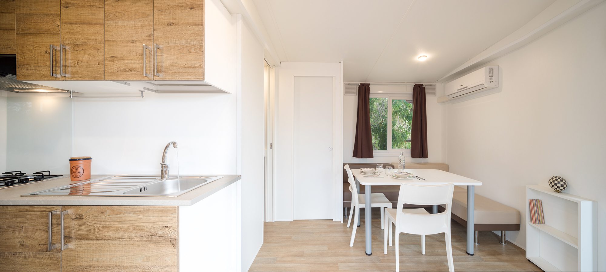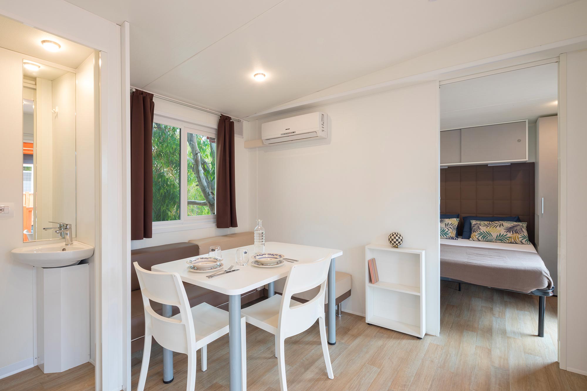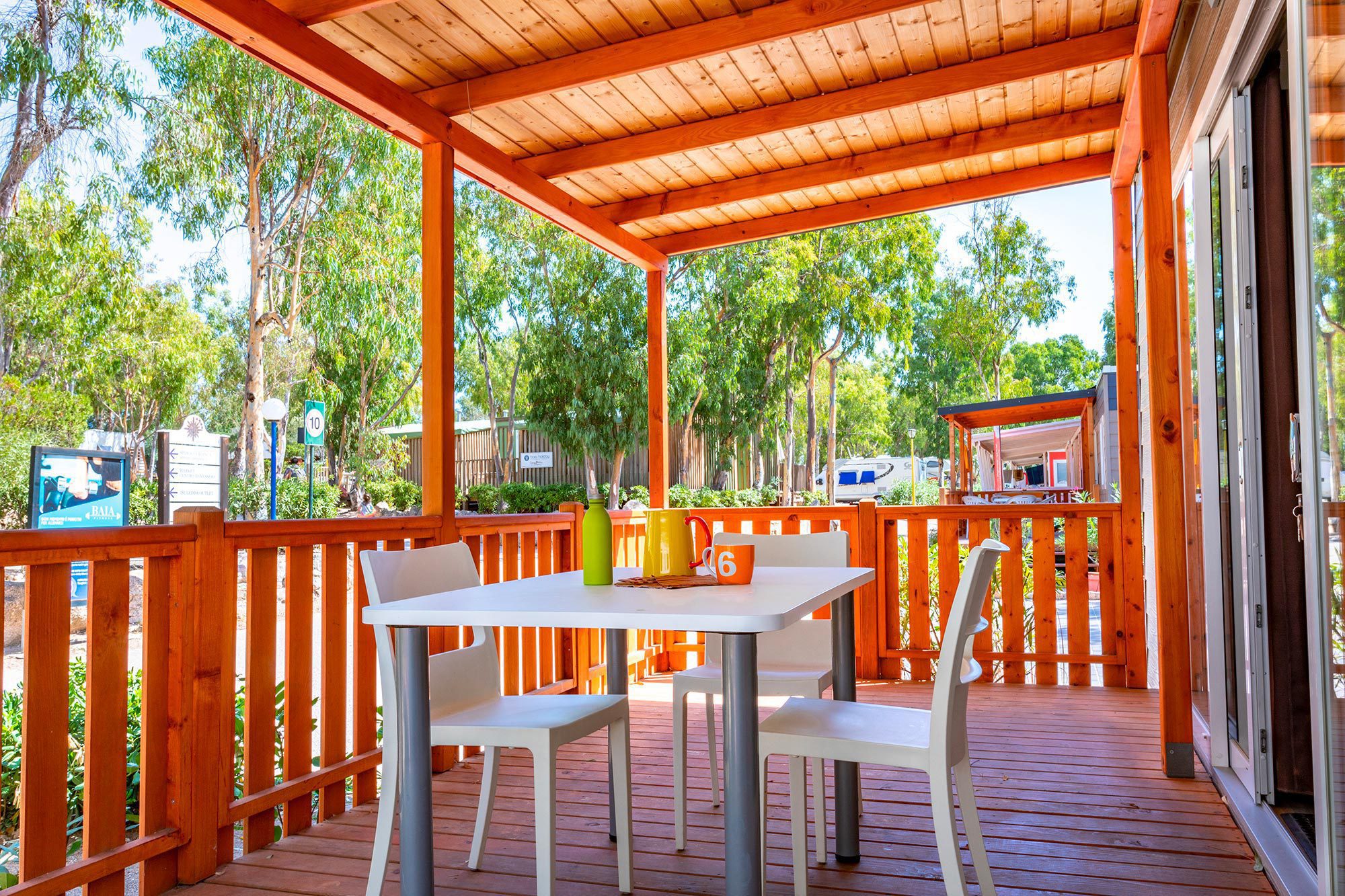 Es hat eine Fläche von ca. 26 m² und kann maximal 4 Erwachsene und 1 Kind beherbergen. Sie besteht aus einem Wohnzimmer mit Tisch und Stühlen, einem bequemen Sofa und einer Küchenzeile, die mit einem Säulenkühlschrank mit Gefrierfach, einem 4-flammigen Kochfeld, einer Spüle, Töpfen und Geschirr ausgestattet ist. Der Schlafbereich besteht aus 2 Zimmern, eines mit einem Doppelbett und eines mit 2 Einzelbetten plus einem dritten erhöhten Bett. Die Unterkunft ist mit 1 kompletten Badezimmer mit WC, Dusche und Waschbecken und 1 Badezimmer mit WC und Waschbecken ausgestattet. Draußen gibt es eine teilweise überdachte Holzveranda mit Tisch und Stühlen, auf der Sie sich entspannen können.