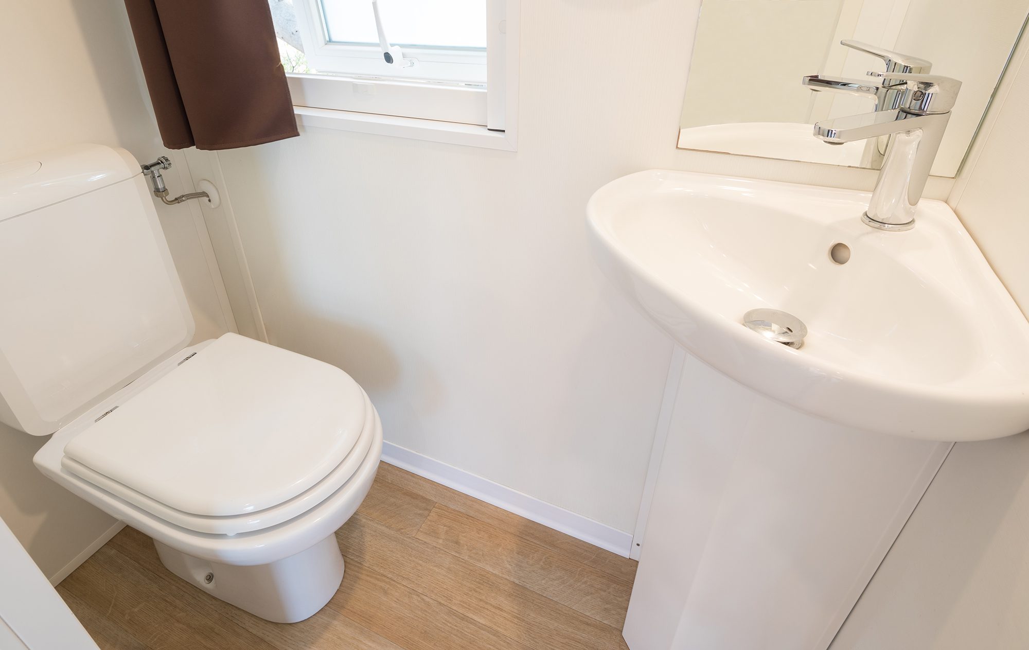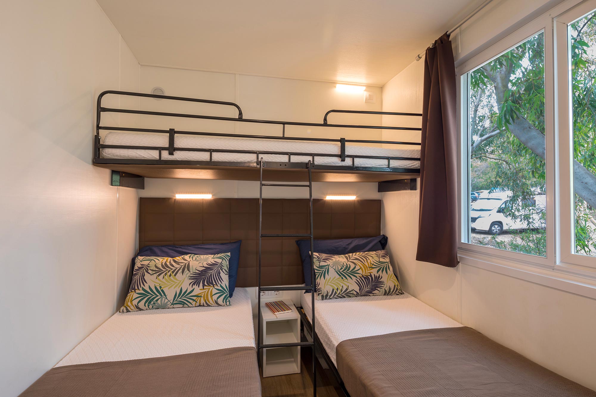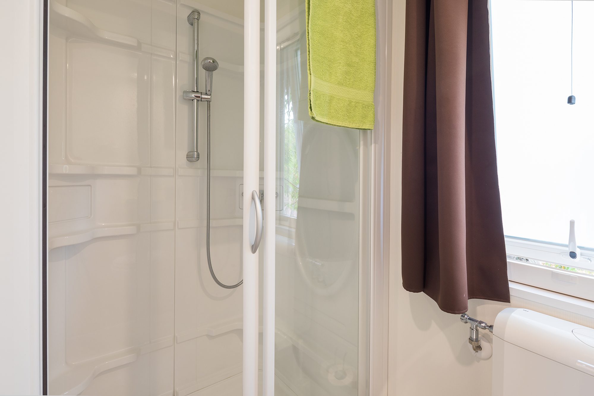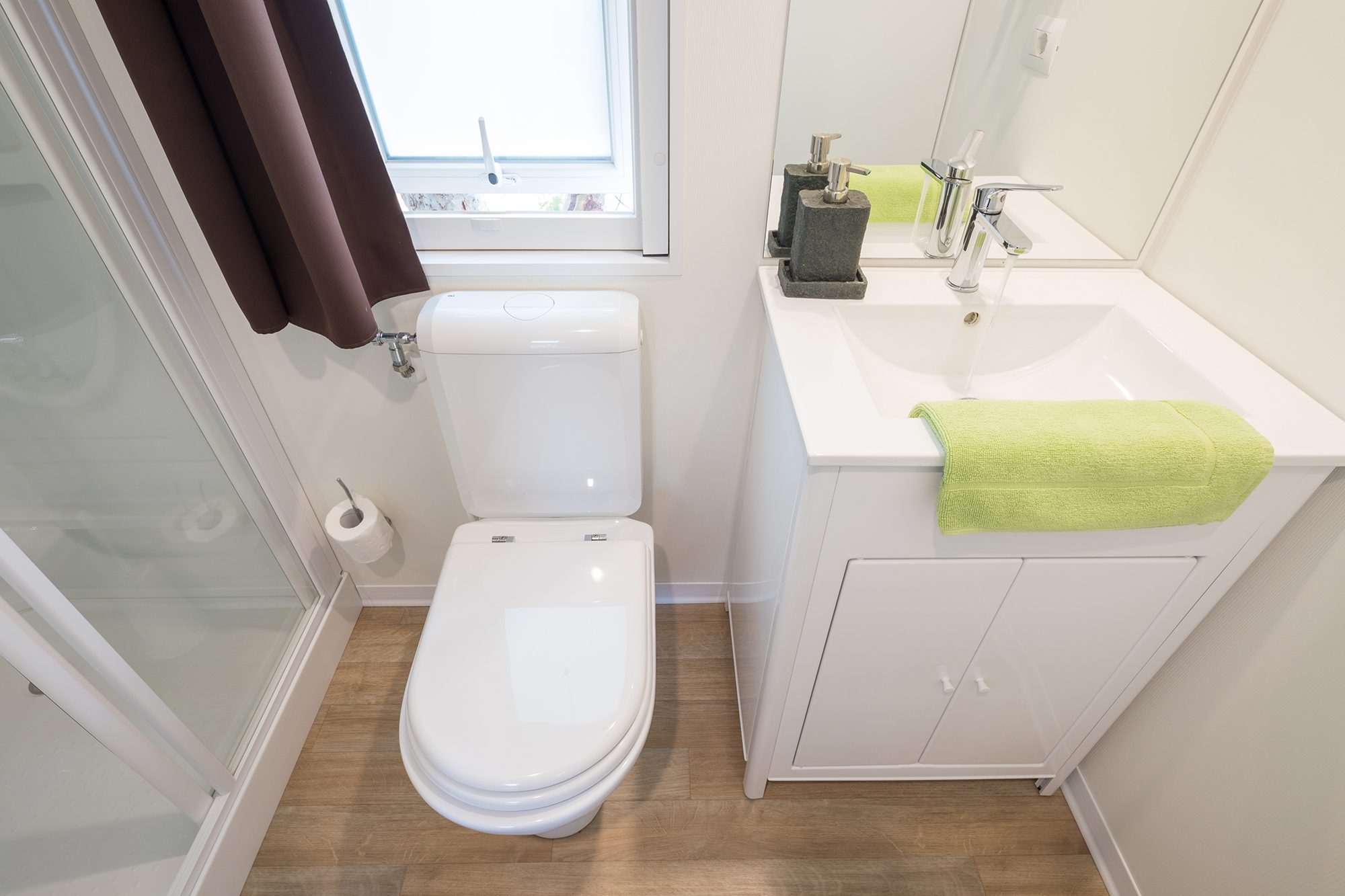 Es hat eine Fläche von ca. 26 m² und kann maximal 4 Erwachsene und 1 Kind beherbergen. Sie besteht aus einem Wohnzimmer mit Tisch und Stühlen, einem bequemen Sofa und einer Küchenzeile, die mit einem Säulenkühlschrank mit Gefrierfach, einem 4-flammigen Kochfeld, einer Spüle, Töpfen und Geschirr ausgestattet ist. Der Schlafbereich besteht aus 2 Zimmern, eines mit einem Doppelbett und eines mit 2 Einzelbetten plus einem dritten erhöhten Bett. Die Unterkunft ist mit 1 kompletten Badezimmer mit WC, Dusche und Waschbecken und 1 Badezimmer mit WC und Waschbecken ausgestattet. Draußen gibt es eine teilweise überdachte Holzveranda mit Tisch und Stühlen, auf der Sie sich entspannen können.