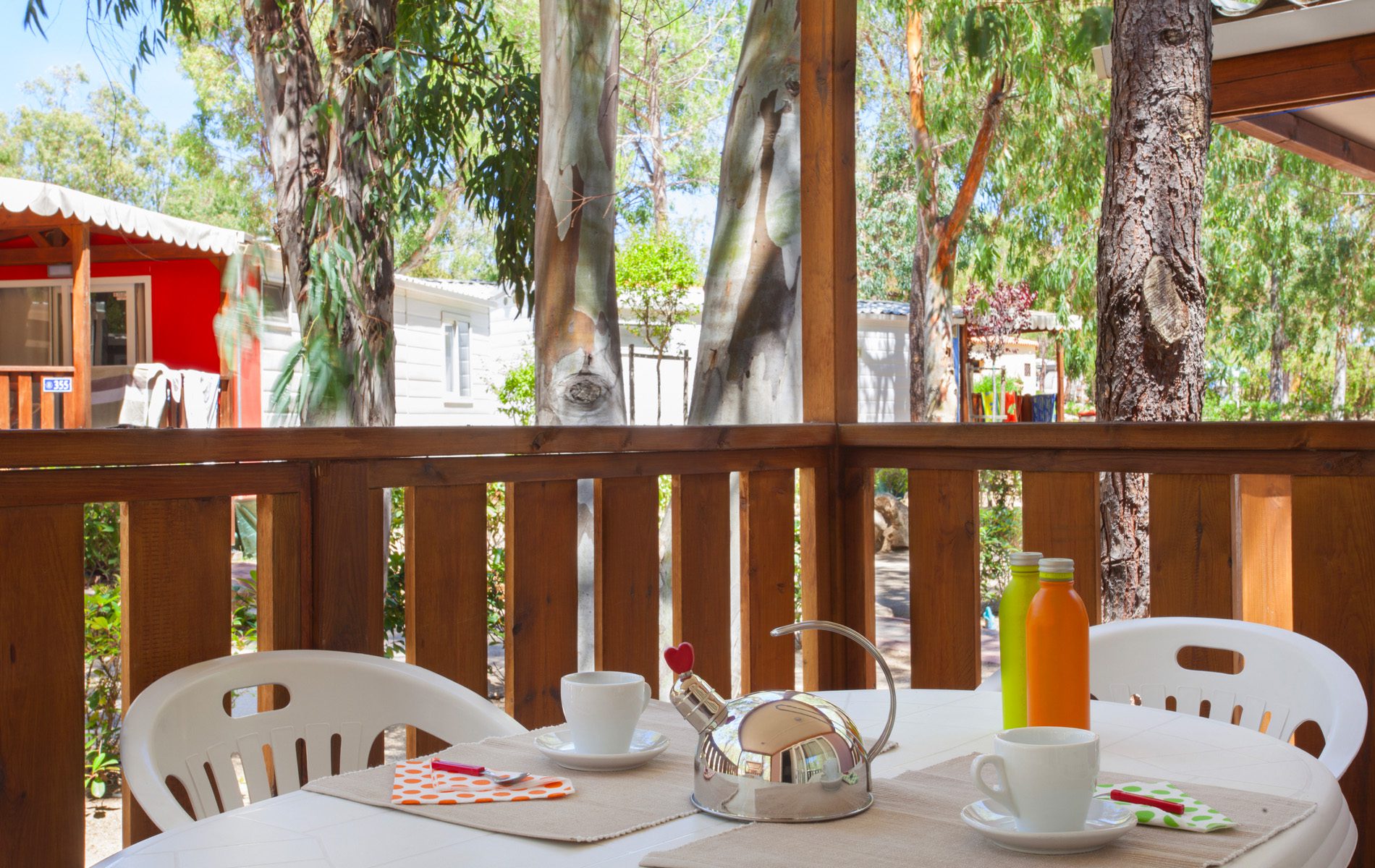 Es hat eine Fläche von ca. 25,5 m² und kann maximal 4 Personen beherbergen. Sie besteht aus einem Wohnzimmer mit Tisch und Stühlen, einer Küchenzeile mit einem Kühlschrank mit Gefrierfach, einem 4-Flammen-Kochfeld, einer Spüle, Töpfen und Pfannen sowie Geschirr. Der Schlafbereich besteht aus 2 Zimmern, eines mit einem Doppelbett und eines mit 2 Einzelbetten. Einige Einheiten haben 5 Betten. Die Unterkunft ist mit 1 kompletten Badezimmer mit WC, Dusche und Waschbecken und 1 Badezimmer mit WC und Waschbecken ausgestattet. Auf der überdachten Holzveranda, die mit einem Tisch und Stühlen ausgestattet ist, können Sie das Leben im Freien genießen, wie es für einen Urlaub in der Natur typisch ist.