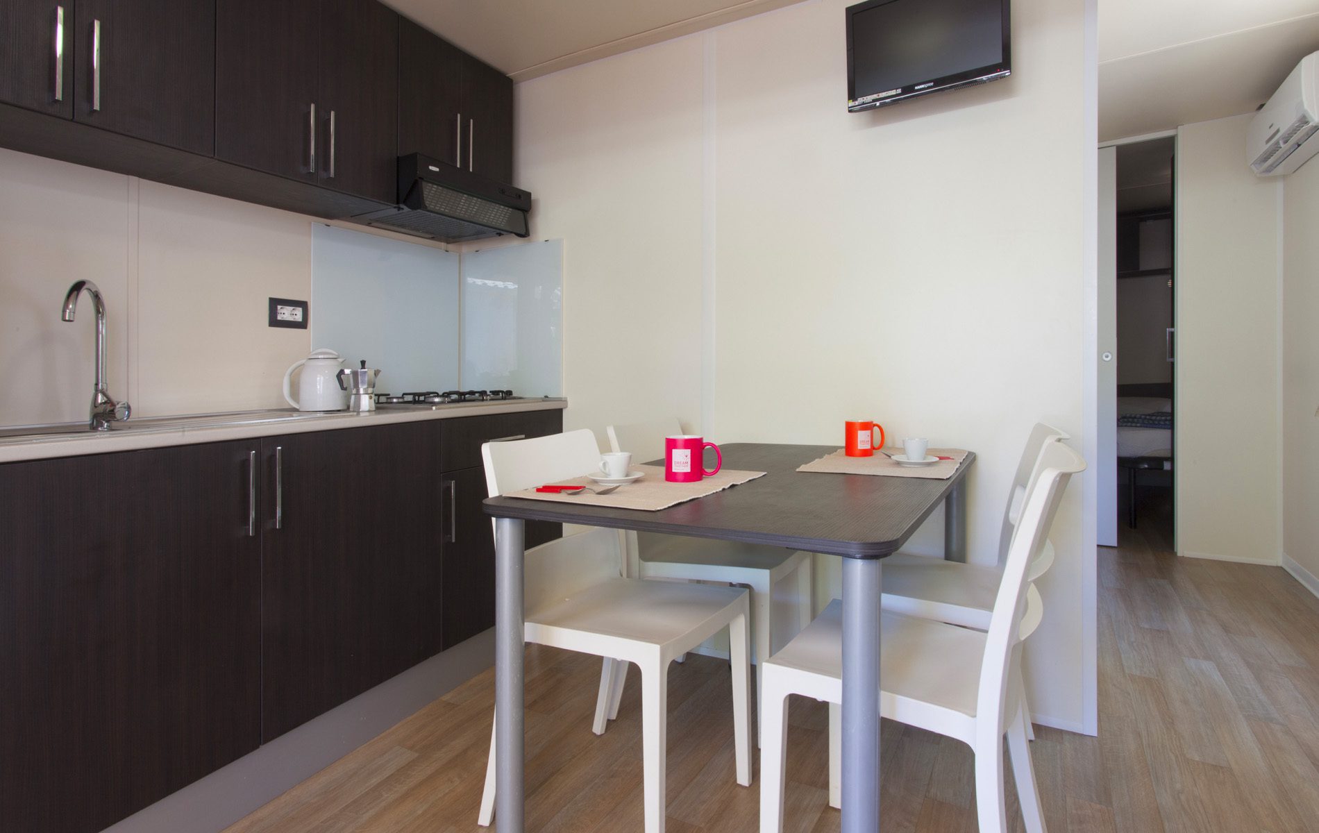 Der Wohnbereich besteht aus einem Wohnzimmer, das mit einem Tisch und Stühlen ausgestattet ist, sowie einer Küchenzeile mit einem Kochfeld, einem Spülbecken und einem Kühlschrank mit Gefrierfach.