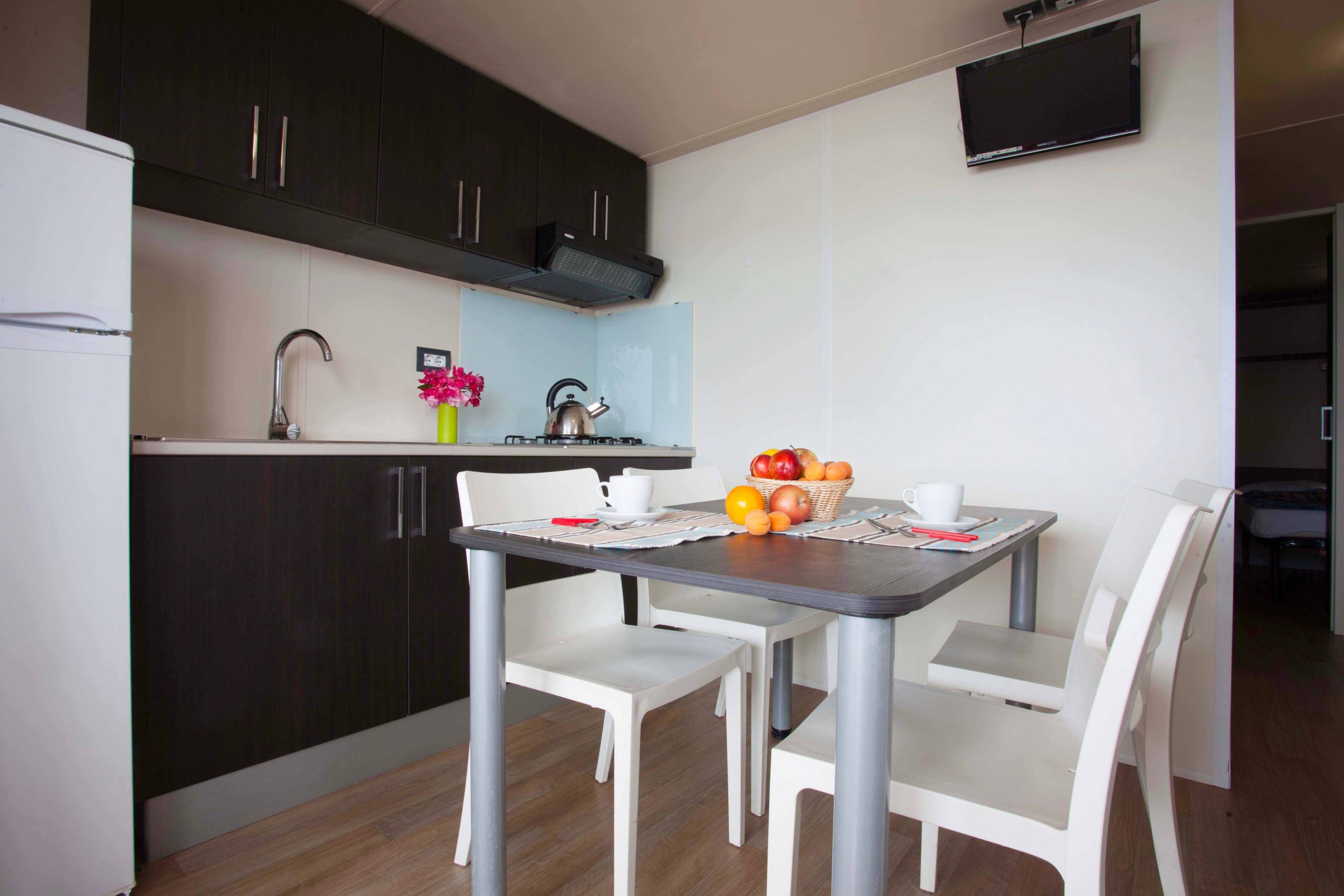 Es hat eine Fläche von etwa 25,5 Quadratmetern und kann maximal fünf Personen beherbergen. Sie besteht aus einem Wohnzimmer mit Tisch und Stühlen, einer Küchenzeile mit einem Kühlschrank mit Gefrierfach, einem 4-Flammen-Kochfeld, einer Spüle, Töpfen und Pfannen sowie Geschirr. Der Schlafbereich besteht aus 2 Zimmern, eines mit einem Doppelbett und eines mit 2 Einzelbetten und 1 Hochbett.