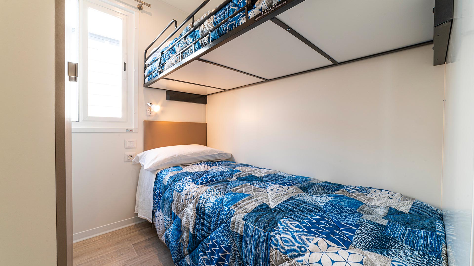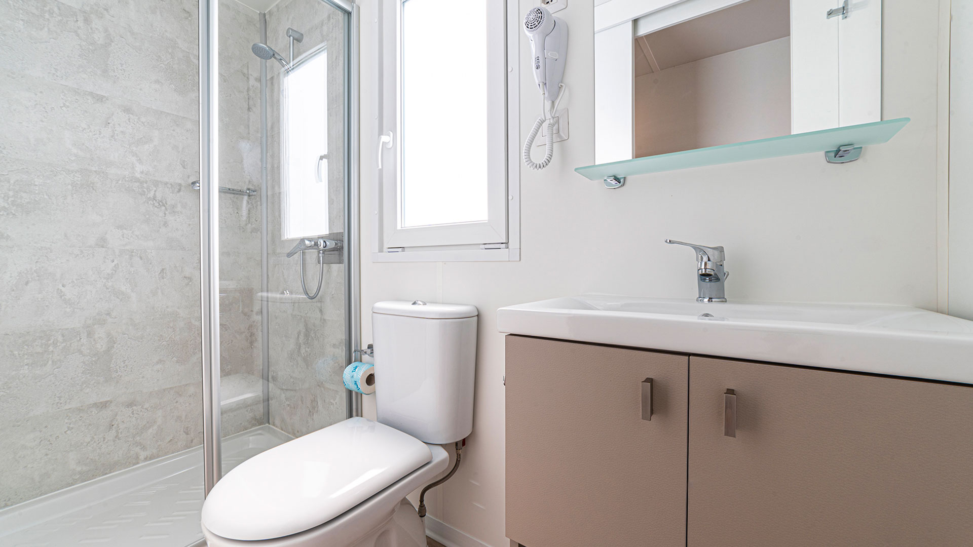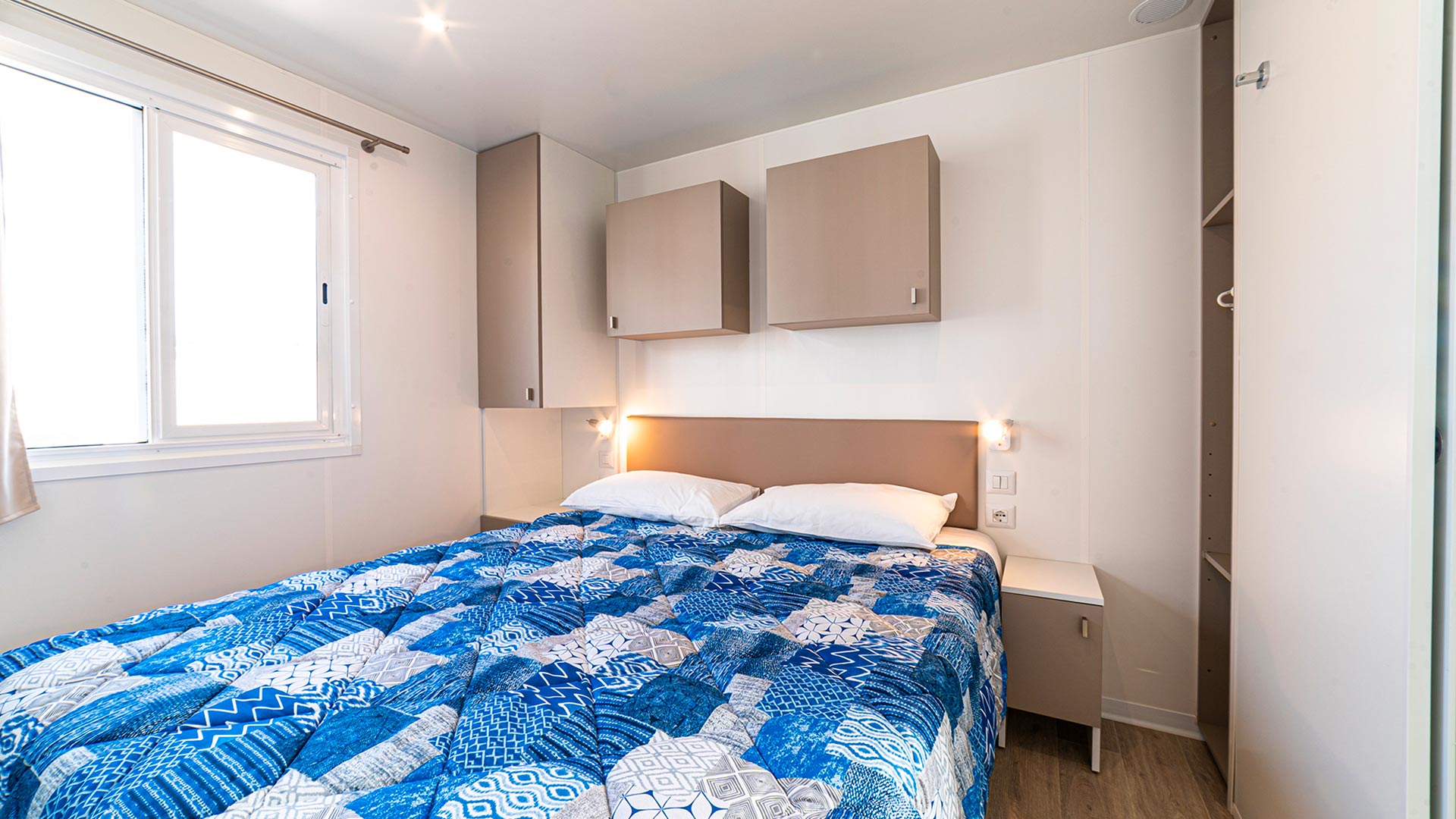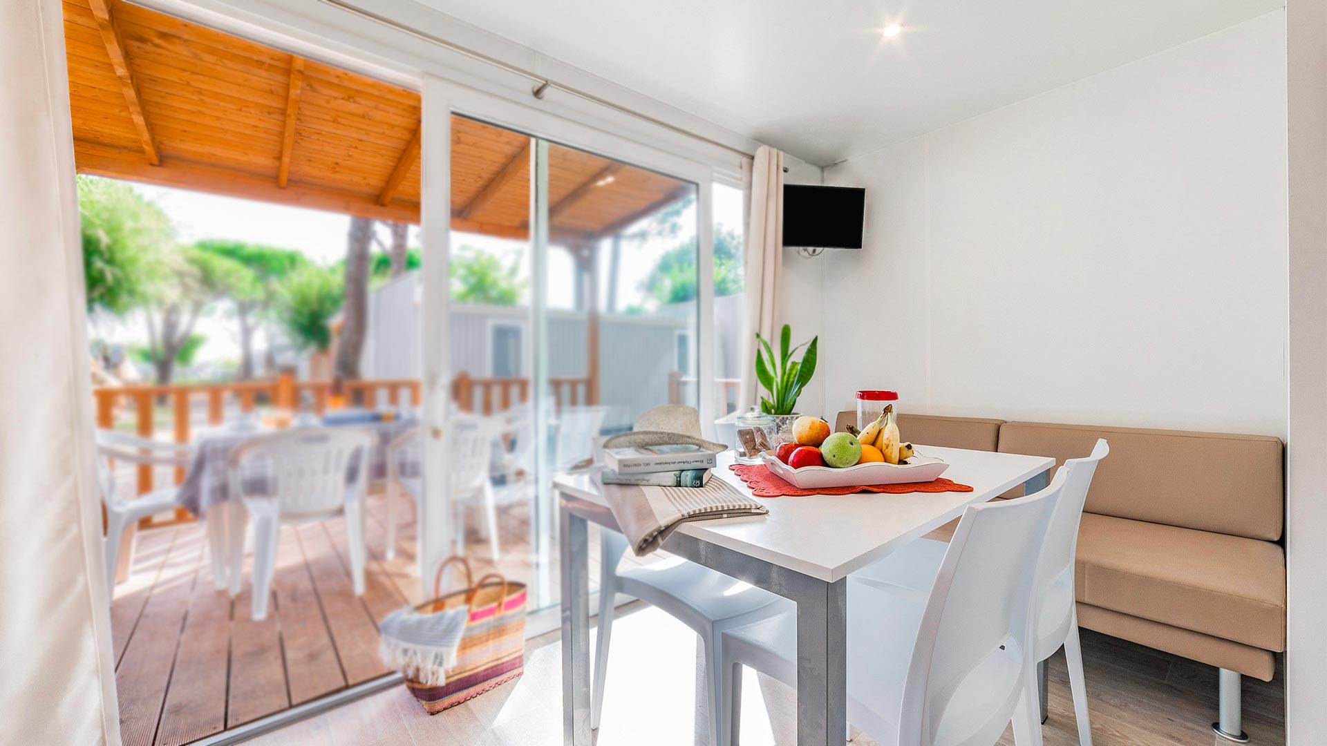 Das neue Baia Revolution ist mit seinen 34 Quadratmetern die ideale Lösung für große Familien mit bis zu sechs Personen. Es ist modern und komfortabel eingerichtet: Das Wohnzimmer ist mit einem Tisch und Stühlen, einem bequemen Sofa und einer Küchenzeile ausgestattet, die über einen Kühlschrank mit Gefrierfach, einen 4-Flammen-Herd, eine Spüle, Töpfe und Geschirr verfügt. Der Schlafbereich besteht aus drei Zimmern, einem Doppelzimmer, einem Schlafzimmer mit zwei Einzelbetten und einem Schlafzimmer mit einem Etagenbett. Die Unterkunft verfügt über 2 Bäder mit Dusche, Waschbecken und Toilette. Auf der überdachten Holzveranda, die mit einem Tisch und Stühlen ausgestattet ist, können Sie das Leben im Freien genießen, wie es für einen Urlaub in der Natur typisch ist.