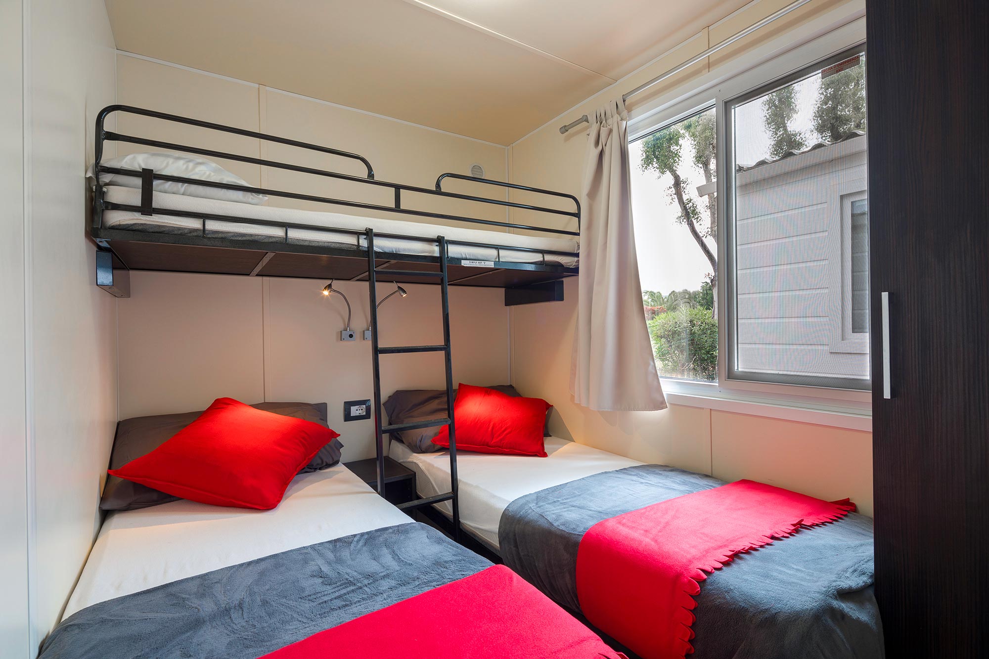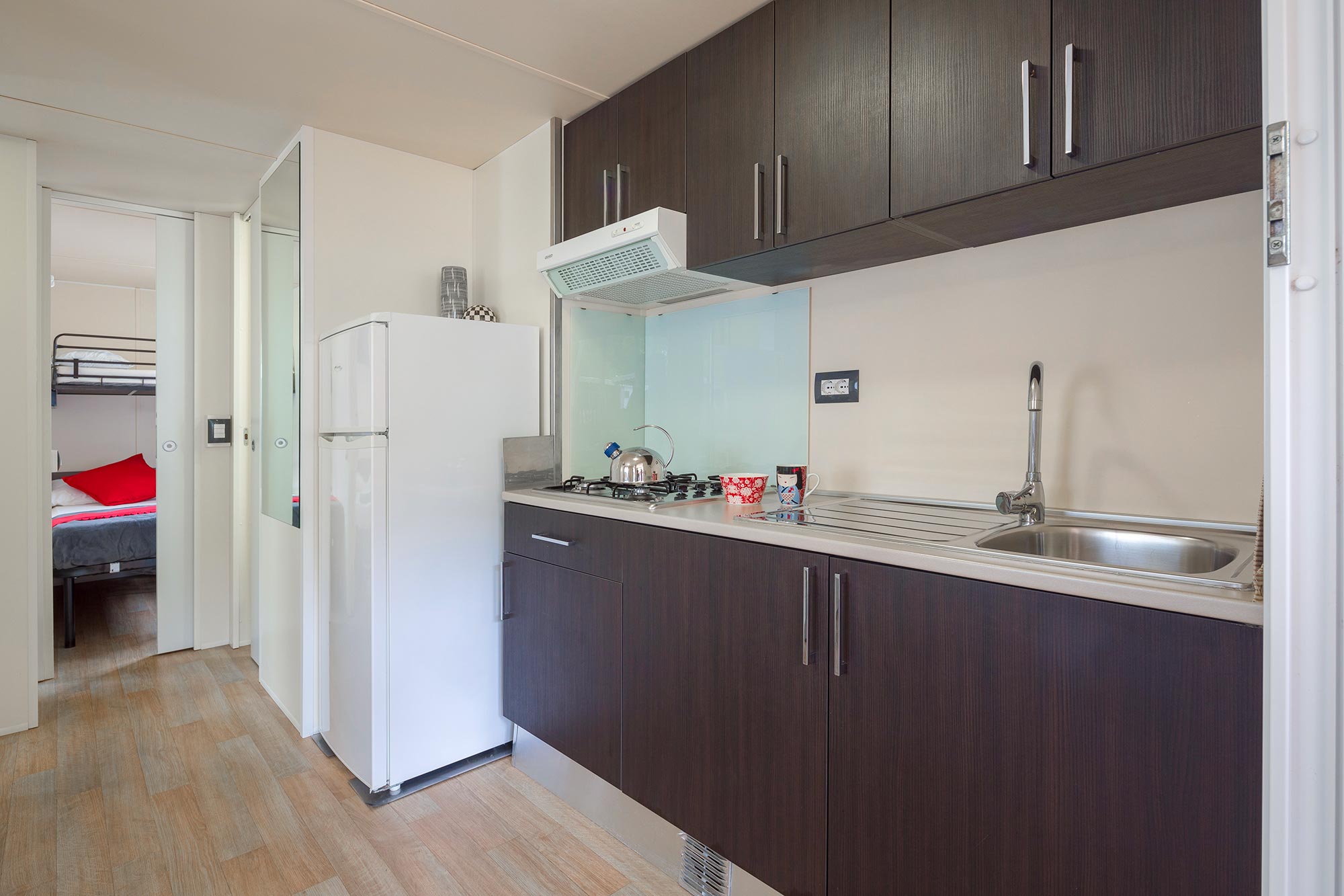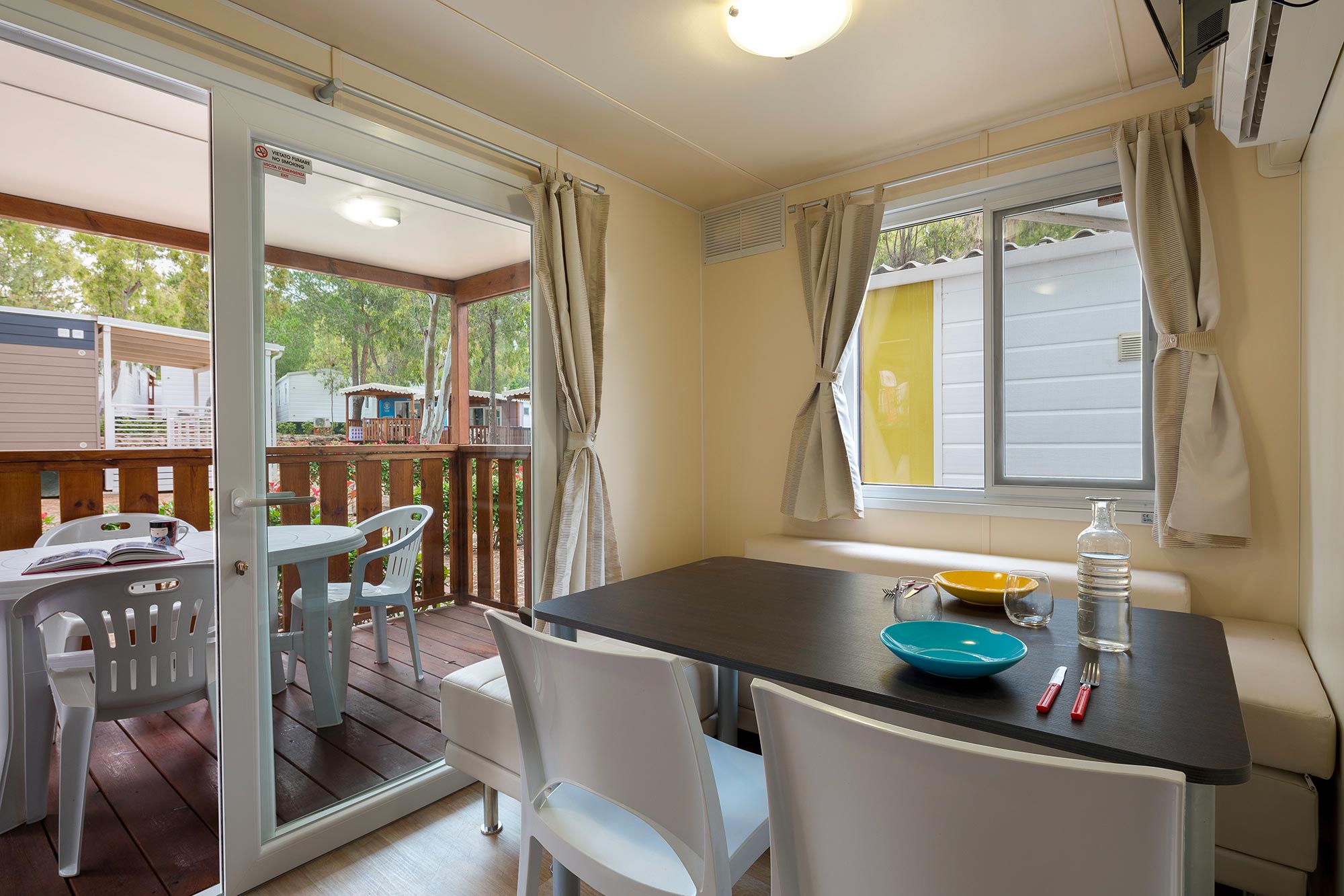 Es hat eine Fläche von ca. 25 m² und kann maximal 5 Personen (4 Erwachsene und 1 Kind) beherbergen. Es besteht aus einem Wohnzimmer mit Tisch und Stühlen, einem bequemen Ecksofa und einer Küchenzeile, die mit einem Säulenkühlschrank mit Gefrierfach, einem 4-flammigen Kochfeld, einer Spüle, Töpfen und Geschirr ausgestattet ist. Der Schlafbereich besteht aus 2 Zimmern, eines mit einem Doppelbett und eines mit 2 Einzelbetten und einem erhöhten Bett (für ein Kind). Die Unterkunft ist mit 1 kompletten Badezimmer mit WC, Dusche und Waschbecken und 1 Badezimmer mit WC und Waschbecken ausgestattet. Auf der überdachten Holzveranda, die mit einem Tisch und Stühlen ausgestattet ist, können Sie das Leben im Freien genießen, wie es für einen Urlaub in der Natur typisch ist.