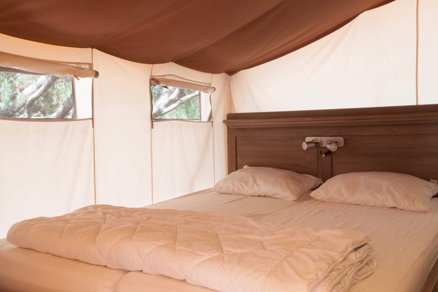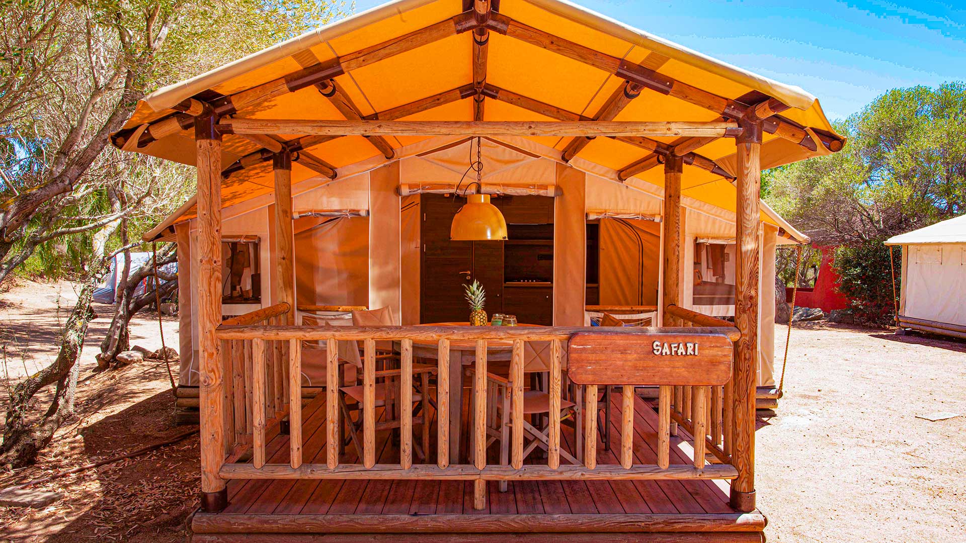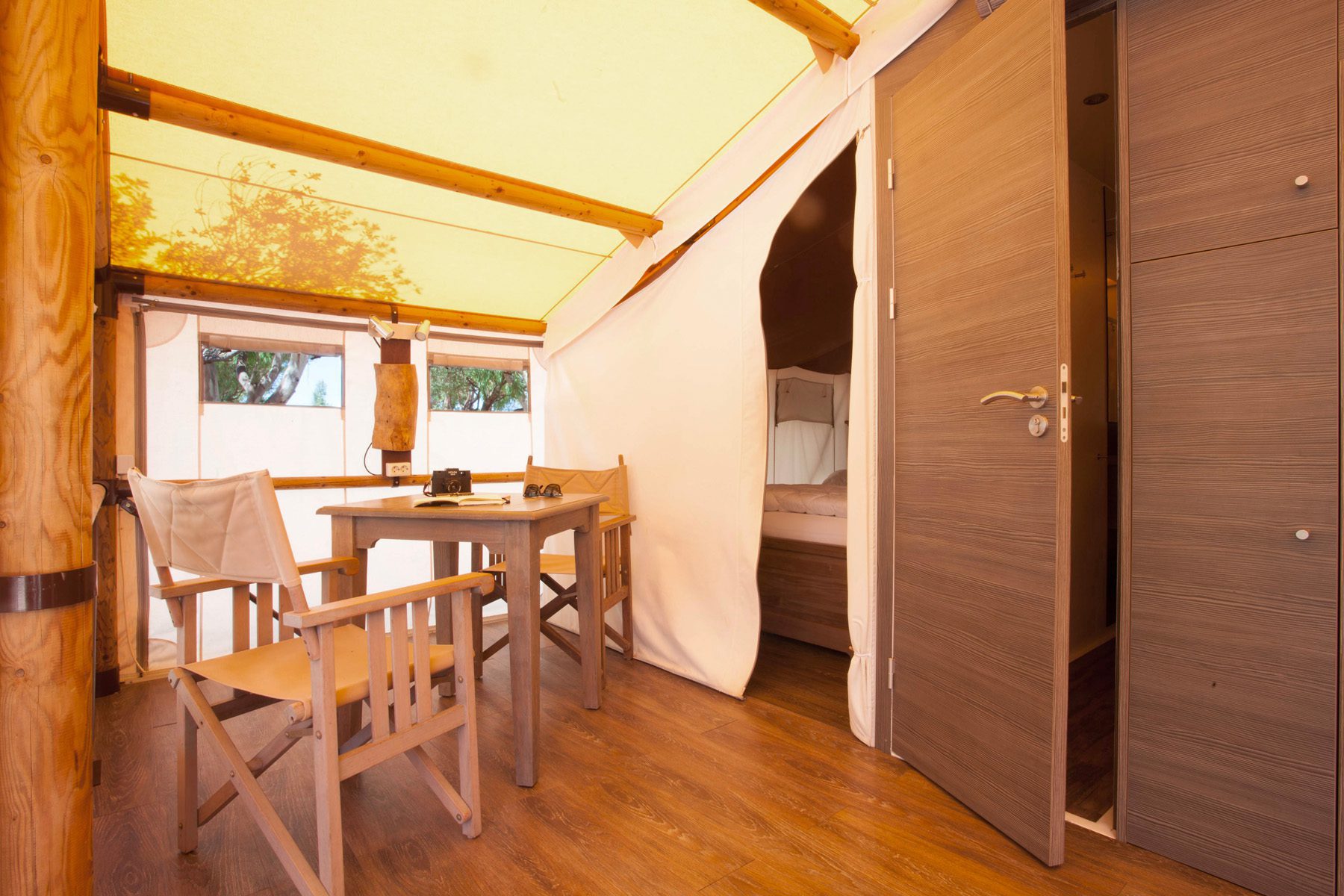 Das Safari Lodge Tent ist etwa 40 m² groß und bietet Platz für maximal vier Erwachsene und ein Kind. Es besteht aus einem Wohnzimmer mit Tisch und Stühlen, einer Küchenzeile mit Kühlschrank, 4-Flammen-Herd, Spüle, Töpfen und Geschirr. Der Schlafbereich besteht aus 2 Zimmern, einem Zimmer mit einem Doppelbett und einem Zimmer mit einem Etagenbett und einem Einzelbett. Die Unterkunft verfügt über 1 Badezimmer mit Dusche, Toilette und Waschbecken. Draußen befindet sich eine geräumige überdachte Holzveranda mit einem Tisch, Stühlen und zwei Sonnenliegen.