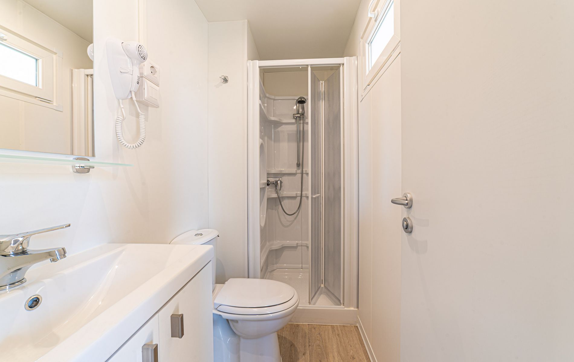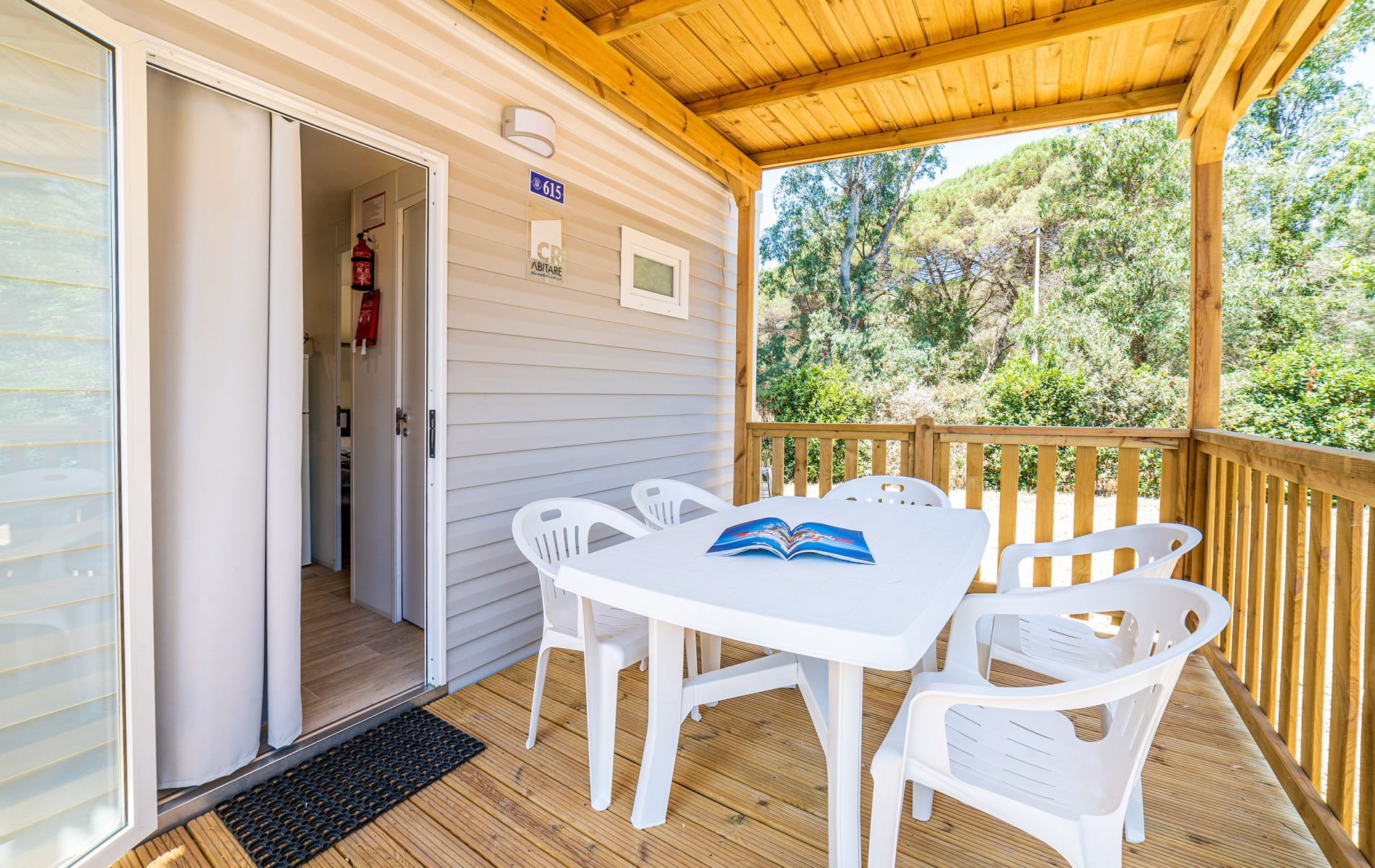 Es hat eine Fläche von ca. 32 m² und bietet Platz für maximal 6 Personen. Es besteht aus einem Wohnzimmer mit Tisch und Stühlen, einer Küchenzeile mit Kühlschrank, 4-Flammen-Herd, Spüle, Töpfen und Geschirr. Der Schlafbereich besteht aus 3 Zimmern, eines mit einem Doppelbett und 2 mit 2 Einzelbetten. Die Unterkunft verfügt über 1 komplettes Badezimmer mit WC, Waschbecken, Dusche und Haartrockner und 1 Badezimmer mit WC und Waschbecken. Eine geräumige, überdachte Holzveranda mit Tisch und Stühlen ermöglicht es Ihnen, die für einen Urlaub in der Natur typische Atmosphäre im Freien zu genießen.