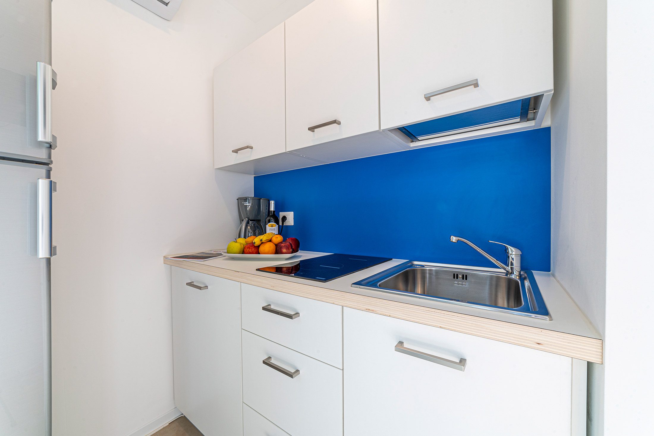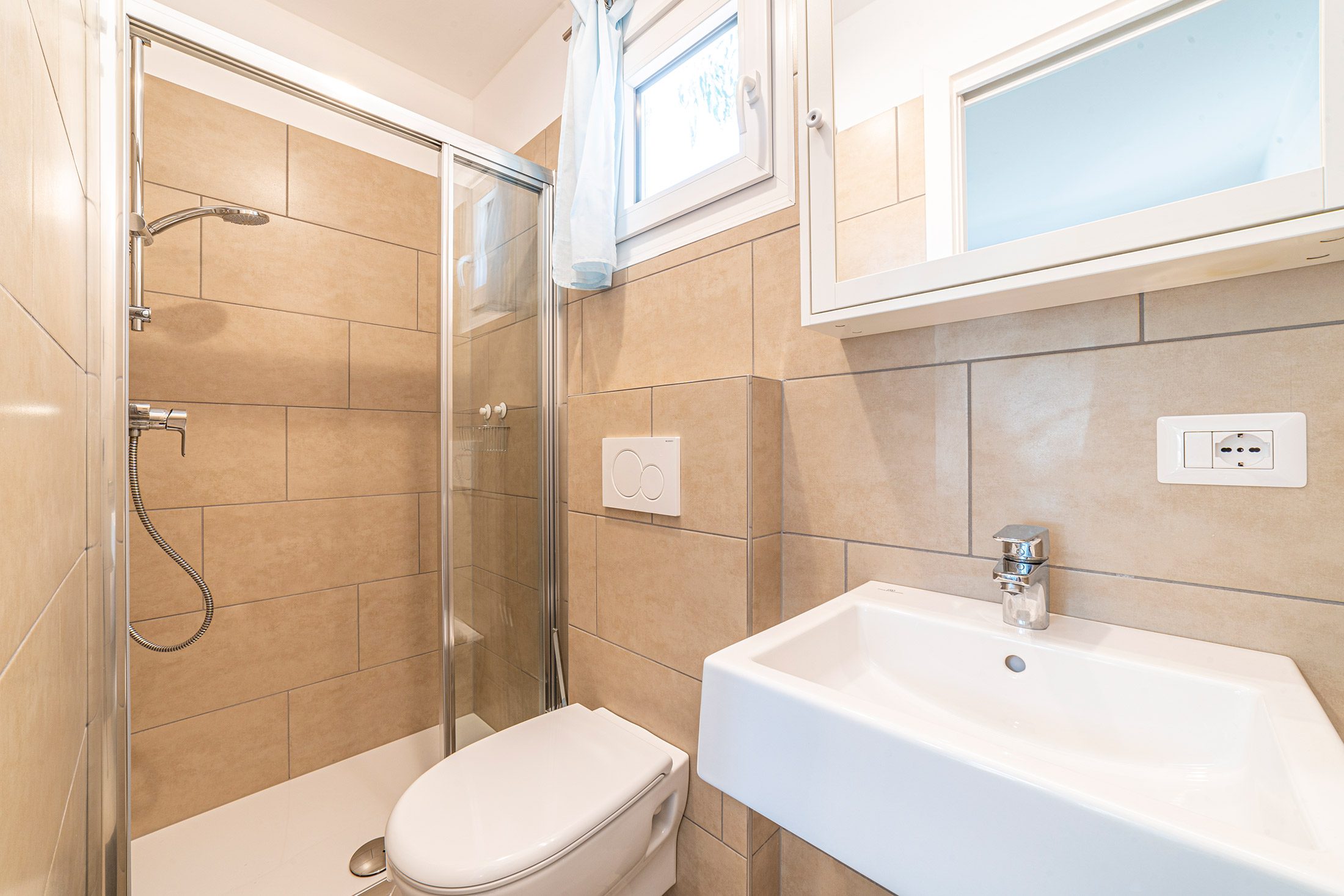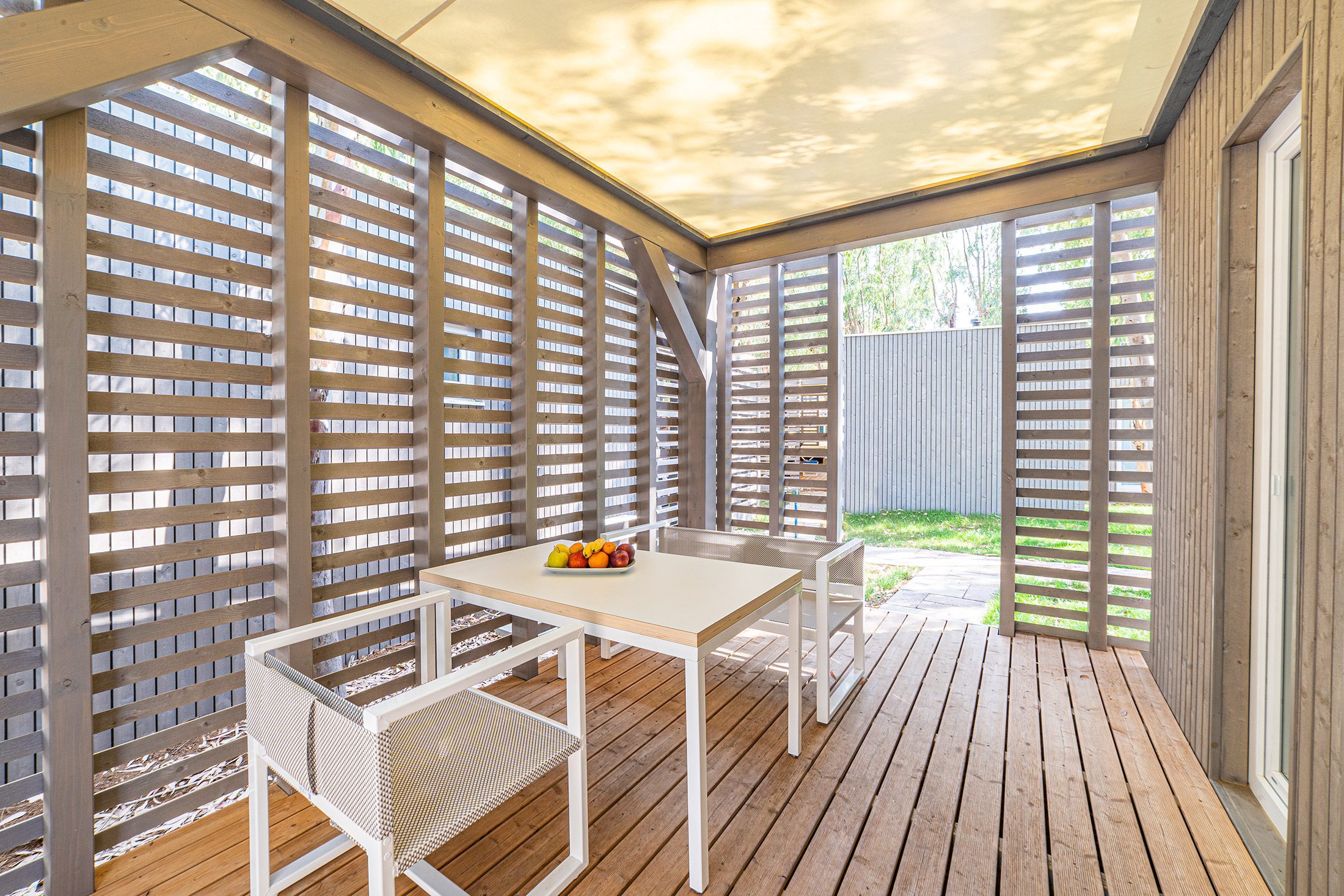 Diese gemauerte Unterkunft ist ca. 22 m² groß und kann maximal 3 Erwachsene beherbergen. Sie besteht aus einem Schlafbereich mit 2 Zimmern, eines mit einem Doppelbett und eines mit 1 Einzelbett, einerKüchenzeile , die mit Kühlschrank, Induktionskochfeld, Spüle, Töpfen und Geschirr ausgestattet ist, und einem Badezimmer mit WC, Dusche und Waschbecken. Der Wohnbereich befindet sich draußen auf der überdachten Veranda , die mit Tisch, Stühlen und Sofa ausgestattet ist. Der Wohnbereich befindet sich in dem Teil der überdachten Veranda, der mit Tisch, Stühlen und Sofa ausgestattet ist.
