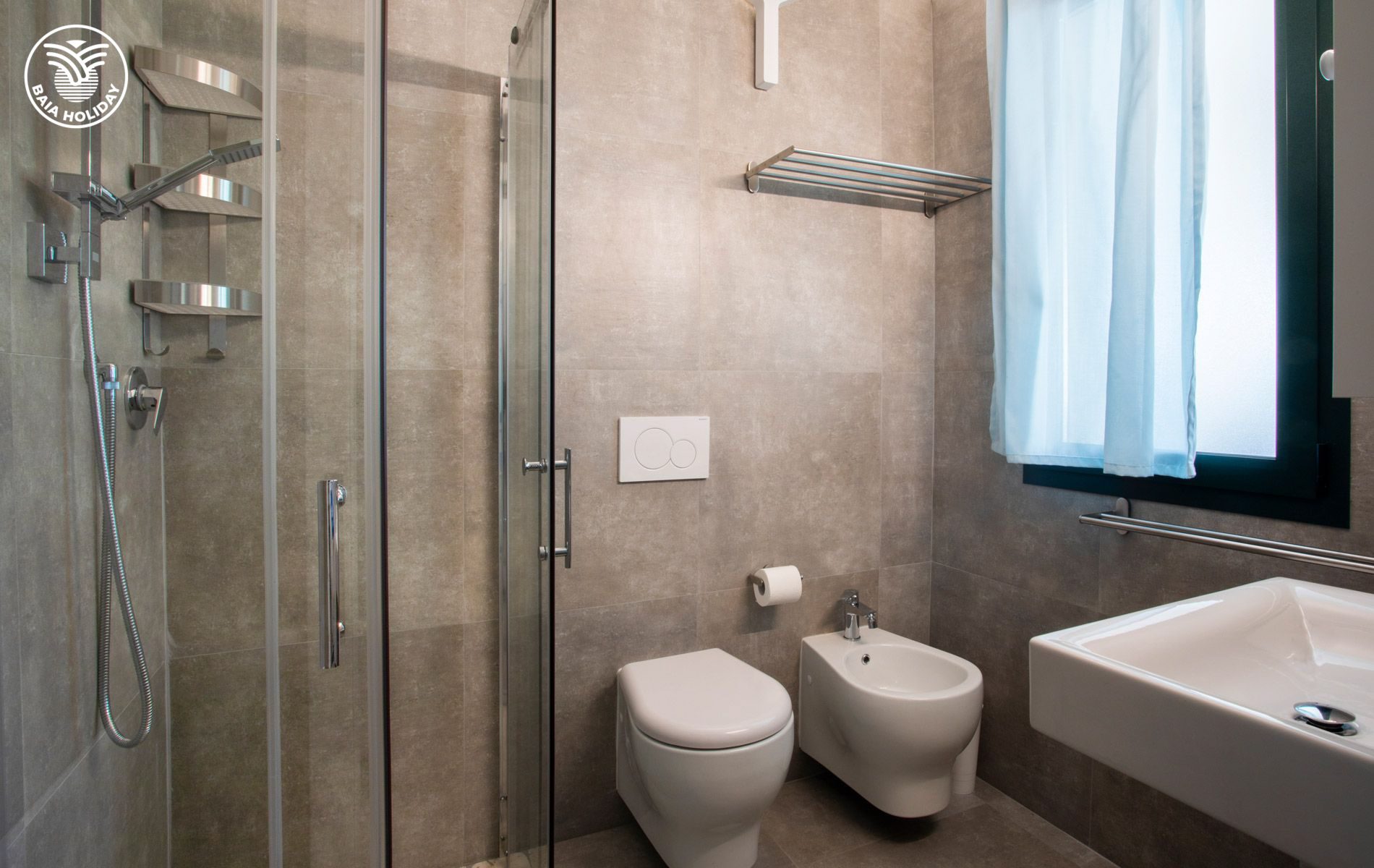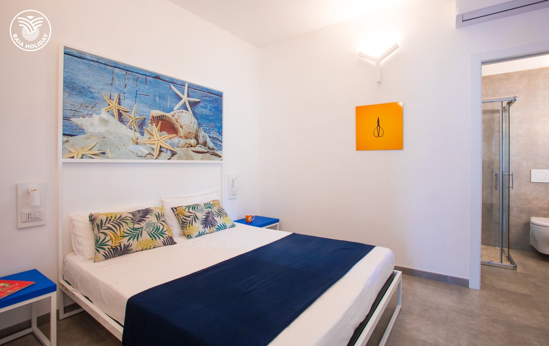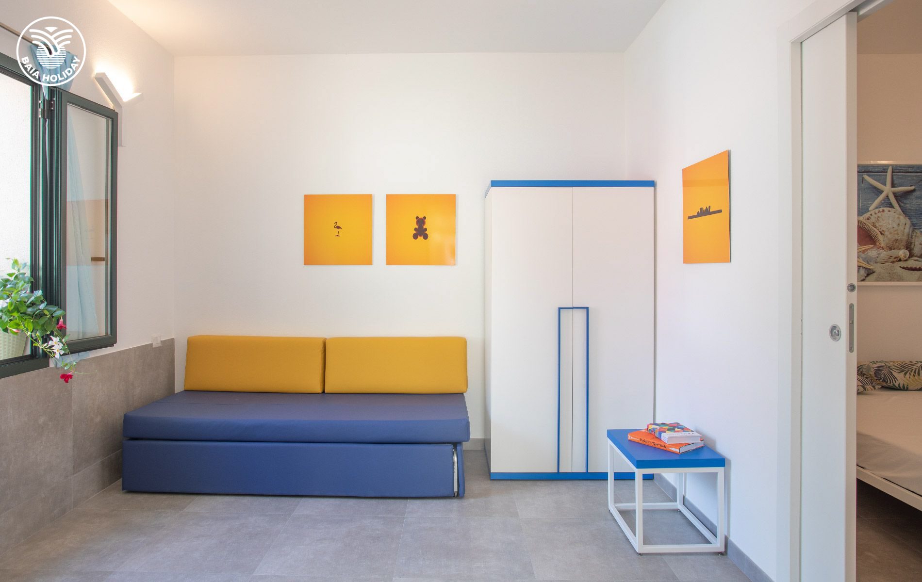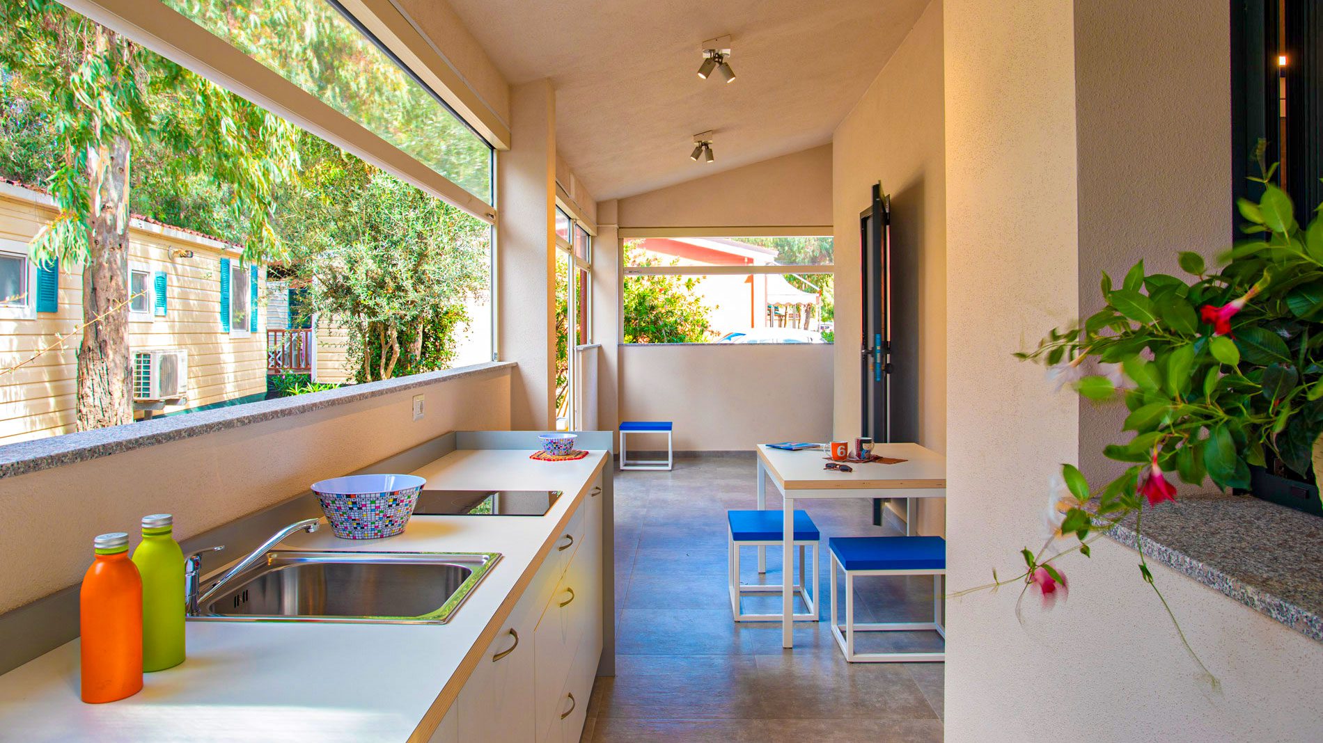 Diese gemauerte Struktur von ca. 31 m² (ohne Terrasse) kann maximal 4 Erwachsene beherbergen. Der Wohnbereich besteht aus einem Schlafsofa. Eine überdachte Veranda im Freien mit Tisch, Stühlen, Küchenzeile mit Kühlschrank mit Gefrierfach, Induktionskochfeld, Spüle, Töpfen und Pfannen und Geschirr. Der Schlafbereich besteht aus 1 Zimmer mit einem Doppelbett. Abgerundet wird die Unterkunft durch ein Badezimmer mit WC, Dusche, Bidet und Waschbecken, das direkt vom Schlafzimmer mit Doppelbett aus zugänglich ist.