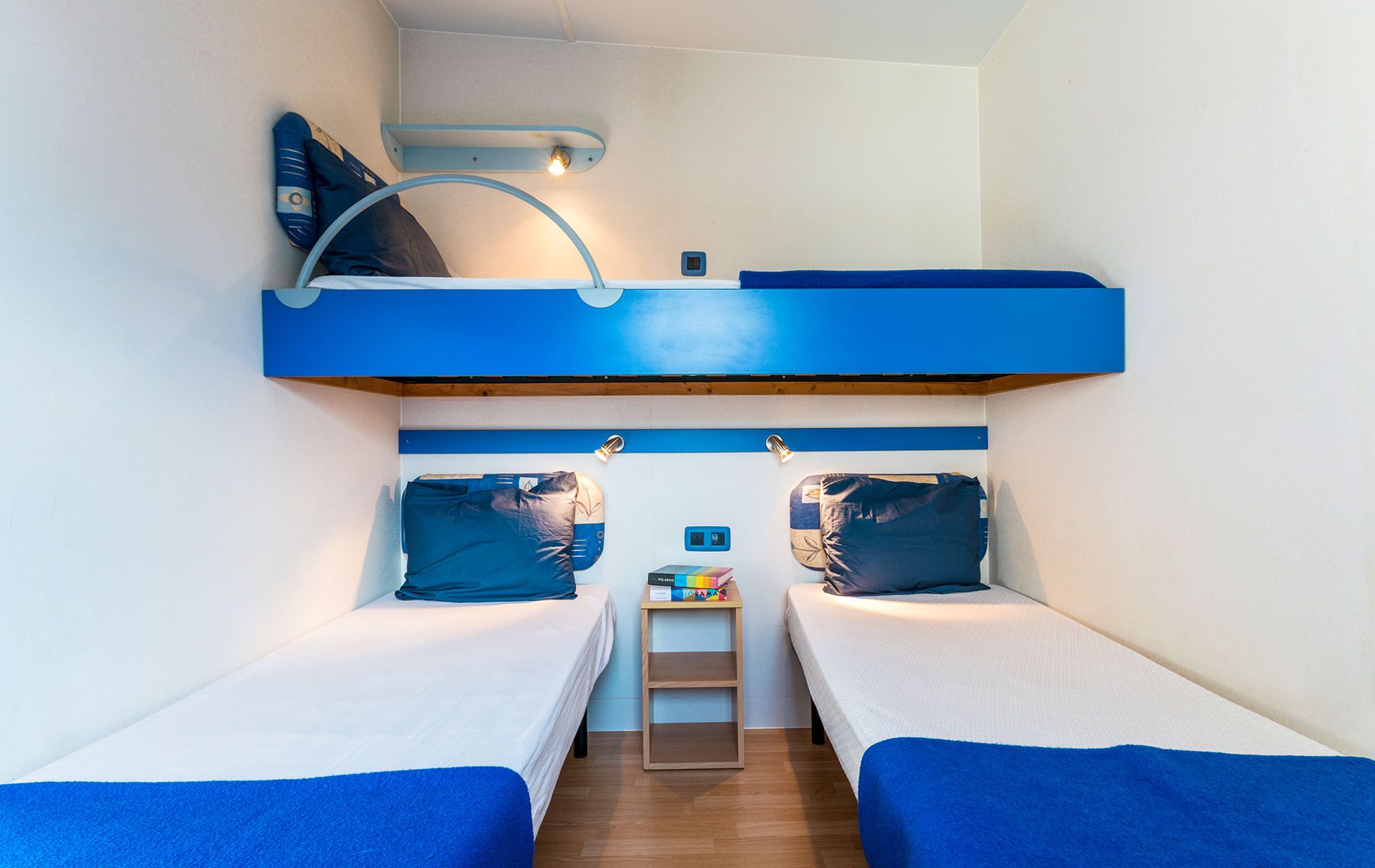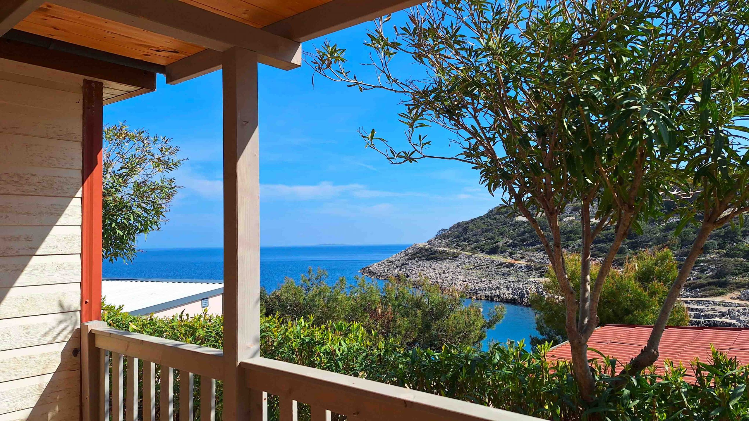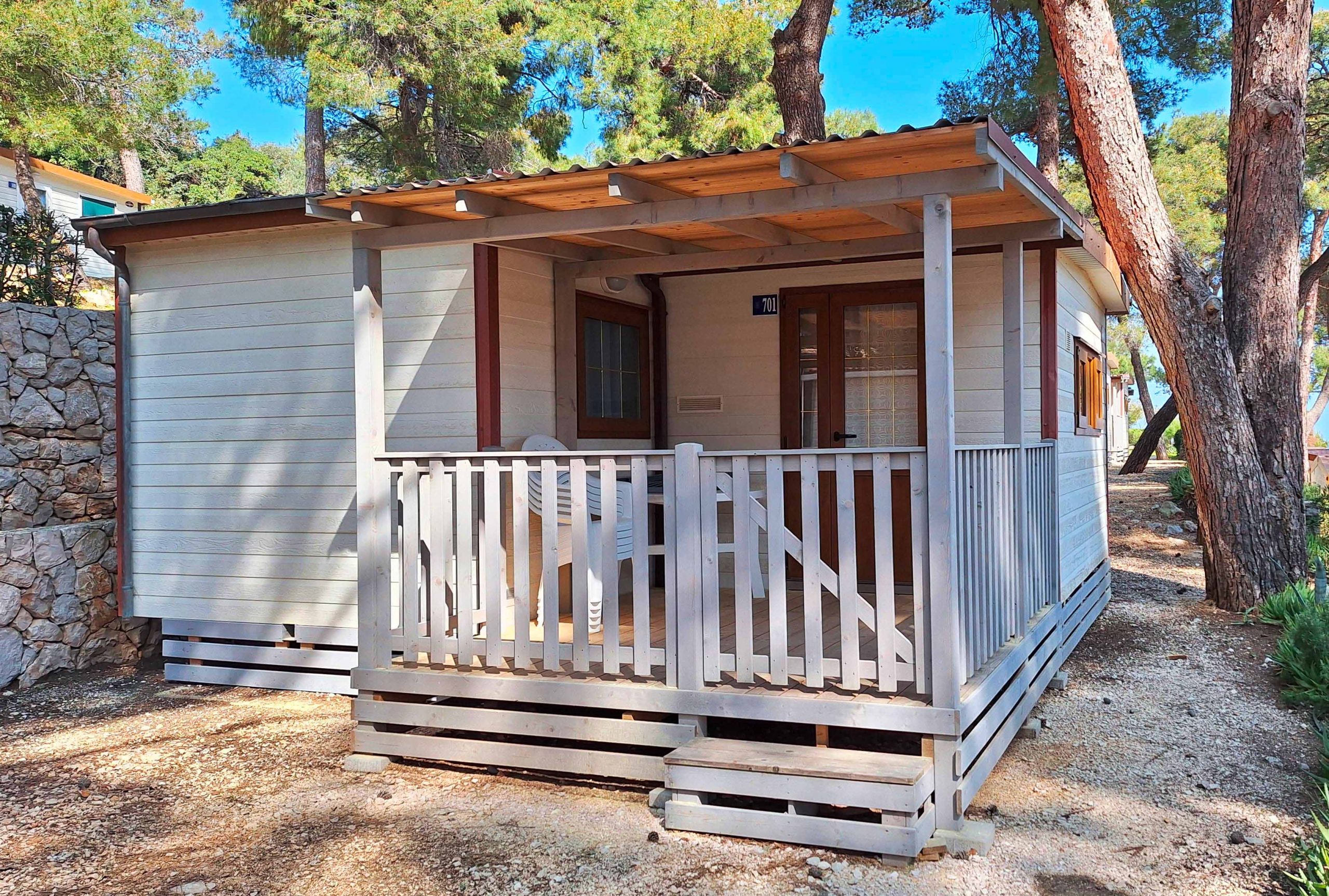 Es hat eine Fläche von ca. 31 m² und kann maximal 4 Personen beherbergen. Sie besteht aus einem Wohnzimmer mit einem Tisch, Stühlen und einem Schlafsofa, einer Küchenzeile mit einem Kühlschrank mit Gefrierfach, einem Kochfeld mit 4 Flammen, einer Spüle, Töpfen, Pfannen und Geschirr. Eine Holzterrasse Der Schlafbereich besteht aus 2 Zimmern, eines mit einem Doppelbett und eines mit 2 Einzelbetten (können verbunden werden). Die Unterkunft ist mit 1 geräumigen Badezimmer mit WC, Dusche, Bidet und Waschbecken ausgestattet. Draußen gibt es eine überdachte Holzterrasse mit einem Tisch und Stühlen, auf der Sie sich entspannen und Ihren Urlaub im Freien genießen können.