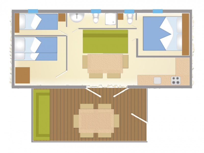Die neue SunLodge BigLeaf im Safari-Stil ist etwa 36 m² groß und bietet Platz für maximal sechs Personen. Sie besteht aus einem großen Wohnzimmer mit Tisch, Bank und Stühlen sowie einer Küchenzeile, die mit einem Säulenkühlschrank mit Gefrierfach, einem 4-flammigen Kochfeld, einer Spüle, Töpfen und Geschirr ausgestattet ist. Der Schlafbereich besteht aus drei Zimmern, eines mit einem Doppelbett, eines mit zwei Einzelbetten und eines mit einem Etagenbett. Die Unterkunft verfügt über 1 komplettes Badezimmer mit Regendusche und WC und 1 Badezimmer mit WC und Waschbecken. Eine große überdachte Holzterrasse von etwa 16 Quadratmetern, die mit Gartenmöbeln aus Holz und 2 Liegestühlen ausgestattet ist, vervollständigt die Unterkunft. Klimaanlage vorhanden, auf Anfrage.