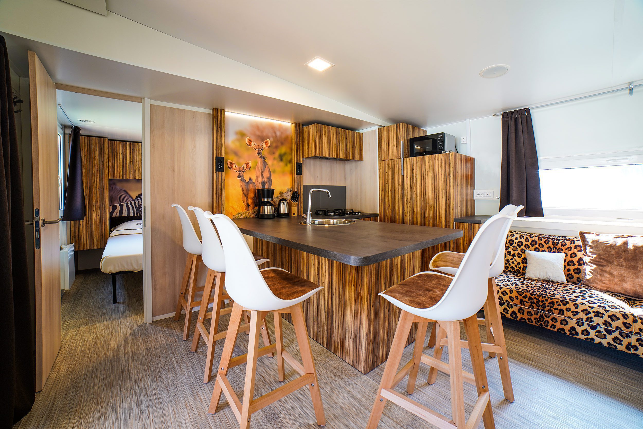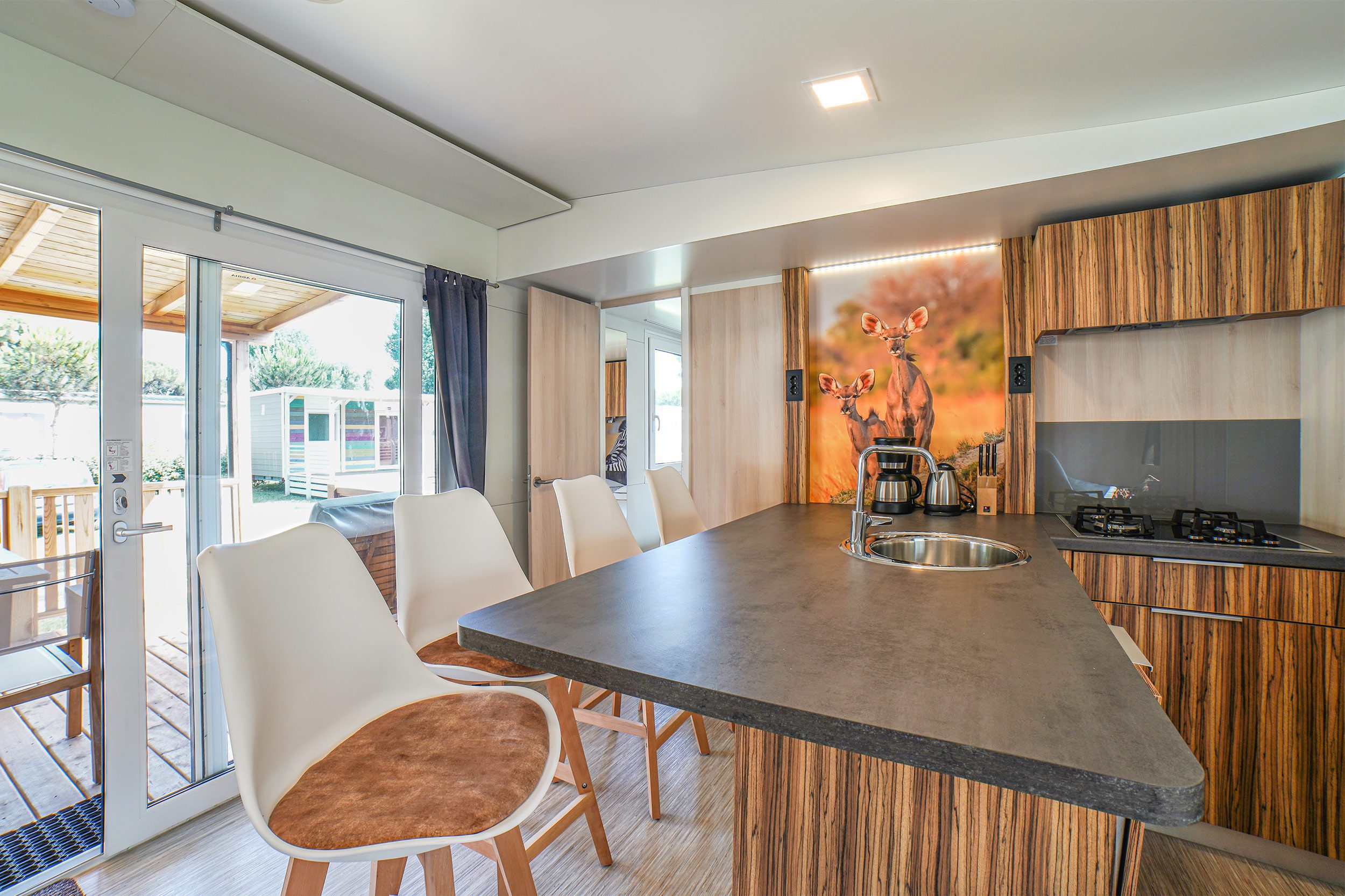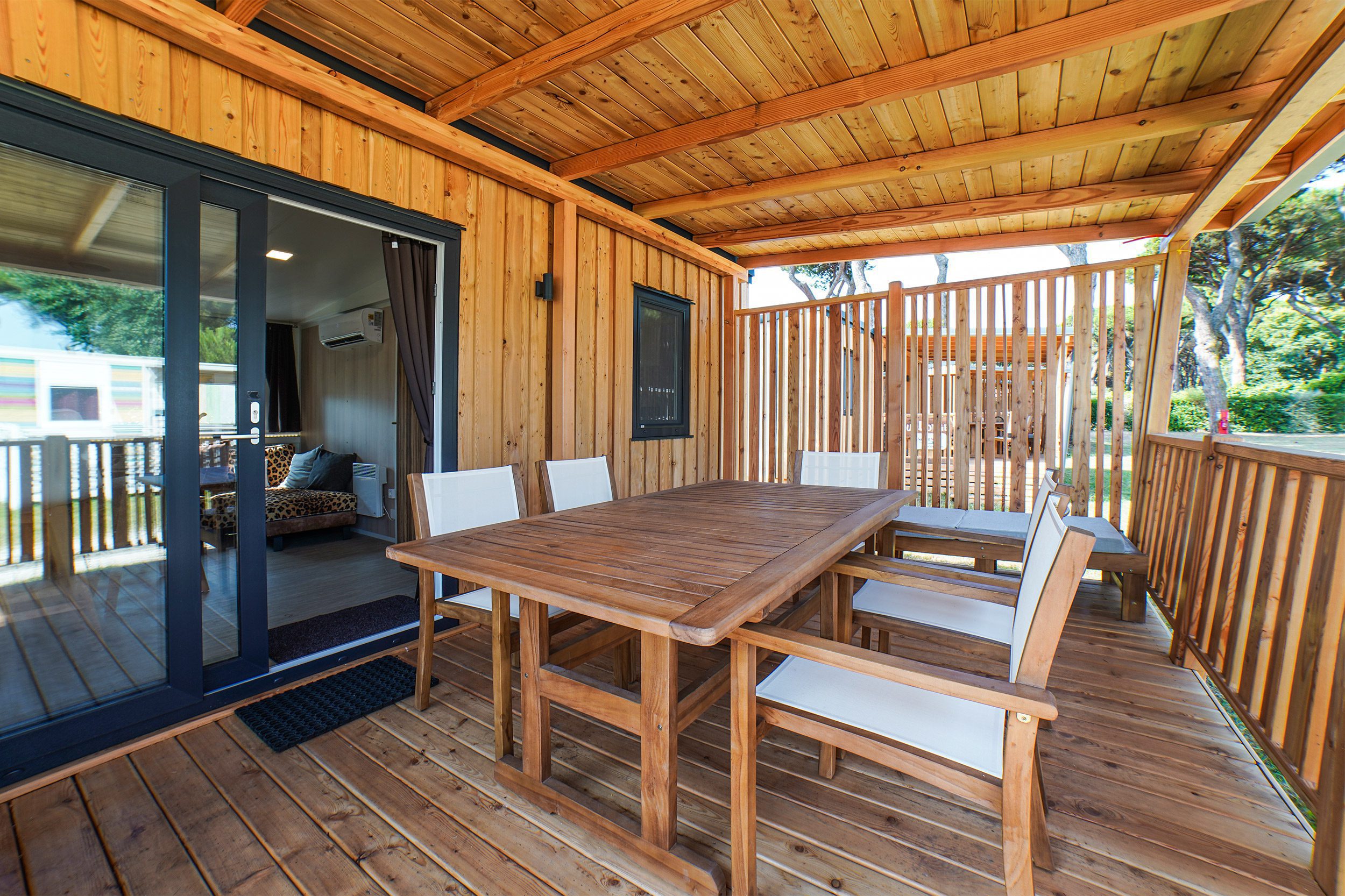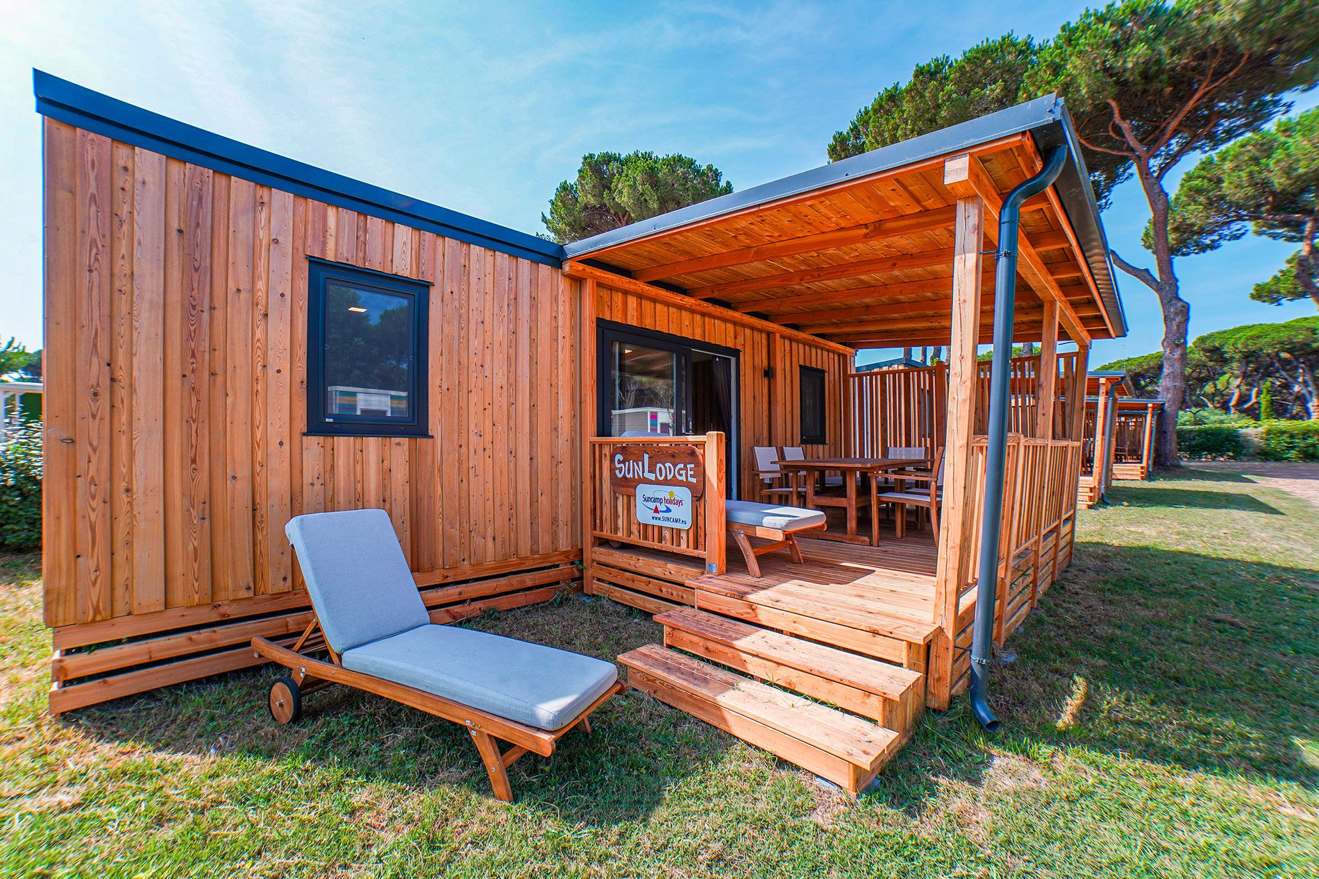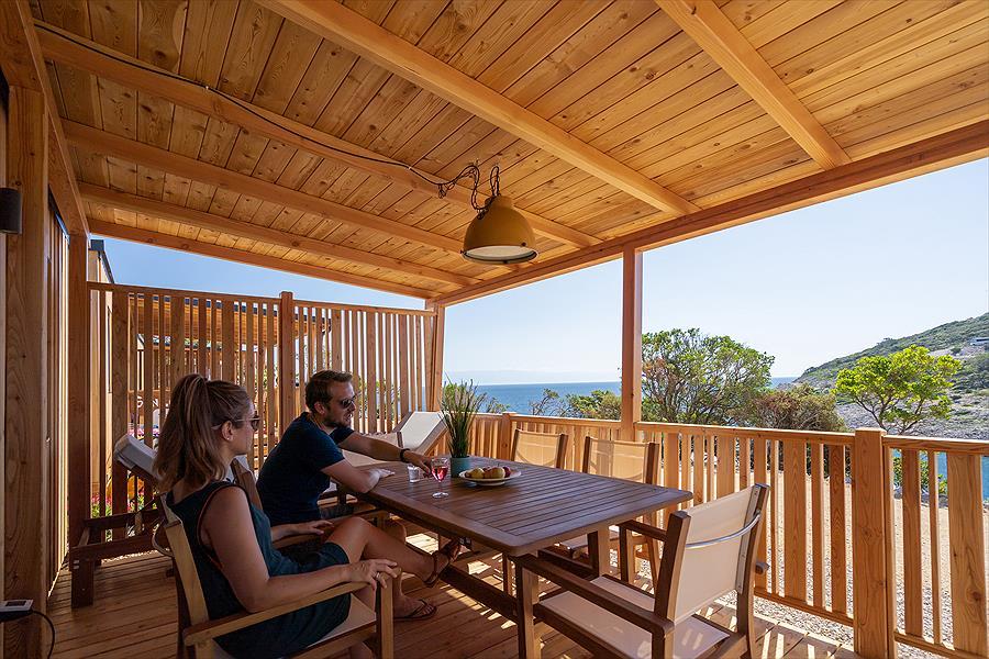 Die neue Sunlodge Catalpa Panorama Sea View ist etwa 36 m² groß und bietet Platz für maximal fünf Personen. Es besteht aus einem Wohnzimmer mit einer großen Insel, einem Tisch, Stühlen, einem Sofa mit Hocker und einer Küchenzeile, die mit einem Säulenkühlschrank mit Gefrierfach, einem 4-flammigen Kochfeld, einer Spüle, Töpfen und Geschirr ausgestattet ist. Der Schlafbereich besteht aus 2 Zimmern, eines mit einem Doppelbett, eines mit 2 Einzelbetten und einem Hochbett. Die Unterkunft verfügt über 2 Bäder mit Regendusche und Waschbecken und 2 separate Toiletten. Eine große überdachte Holzterrasse von ca. 16 Quadratmetern, die mit Gartenmöbeln aus Holz und 2 Liegestühlen ausgestattet ist, vervollständigt die Unterkunft. Klimaanlage vorhanden, auf Anfrage.