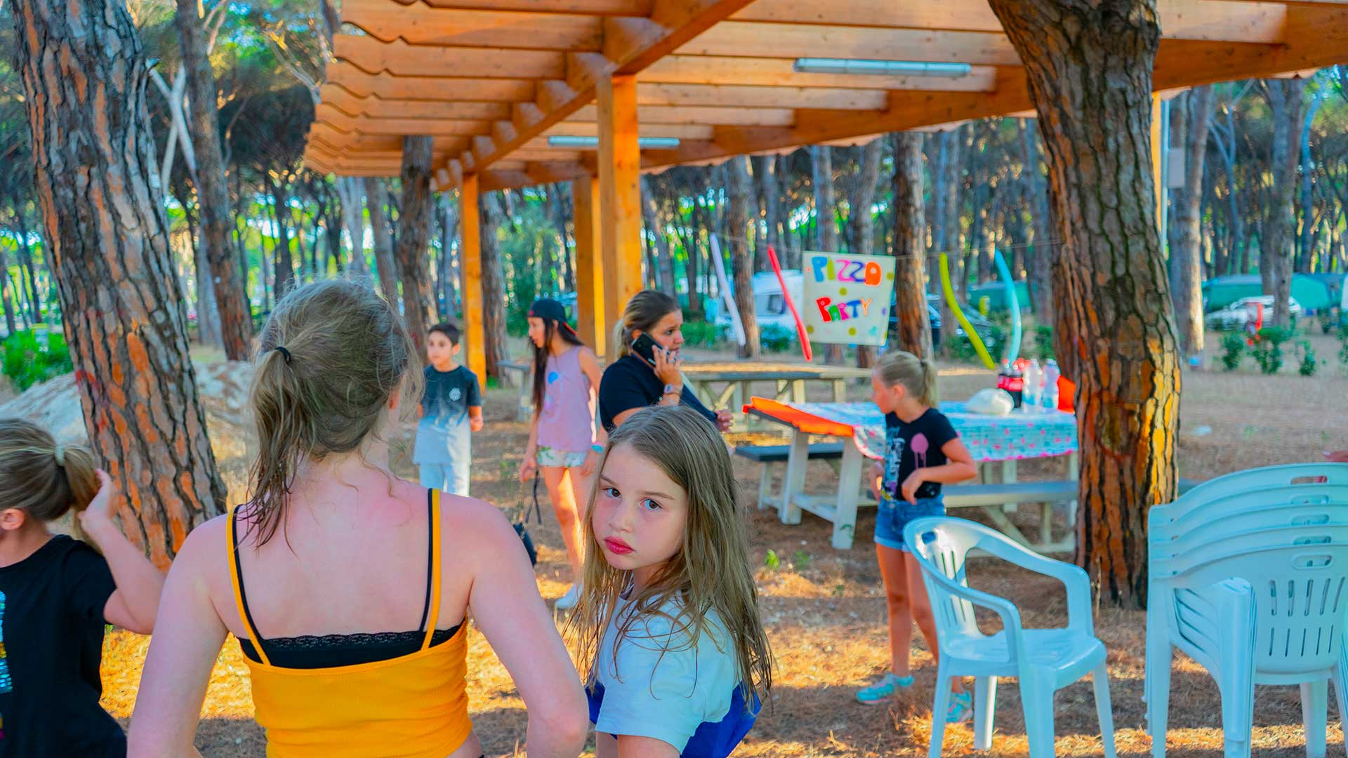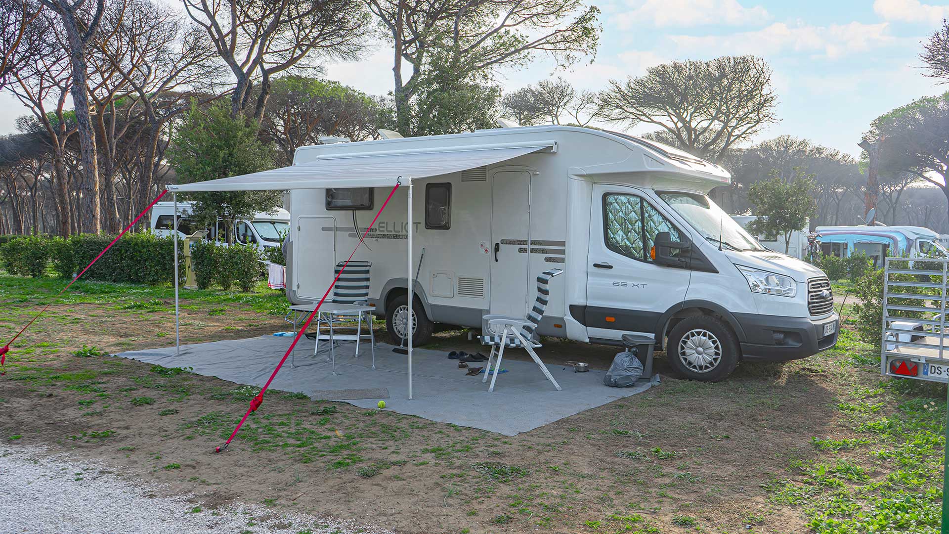 Ebenfalls verfügbar sind einige Wohnwagen mit einer Kapazität für bis zu 5 Personen. Die Wohnwagen sind mit einem Doppelbett, einem Etagenbett, einem Sofa, einem Badezimmer, einer Kochnische und einem Außenzelt mit Tisch und Stühlen ausgestattet, um die frische Luft zu genießen.