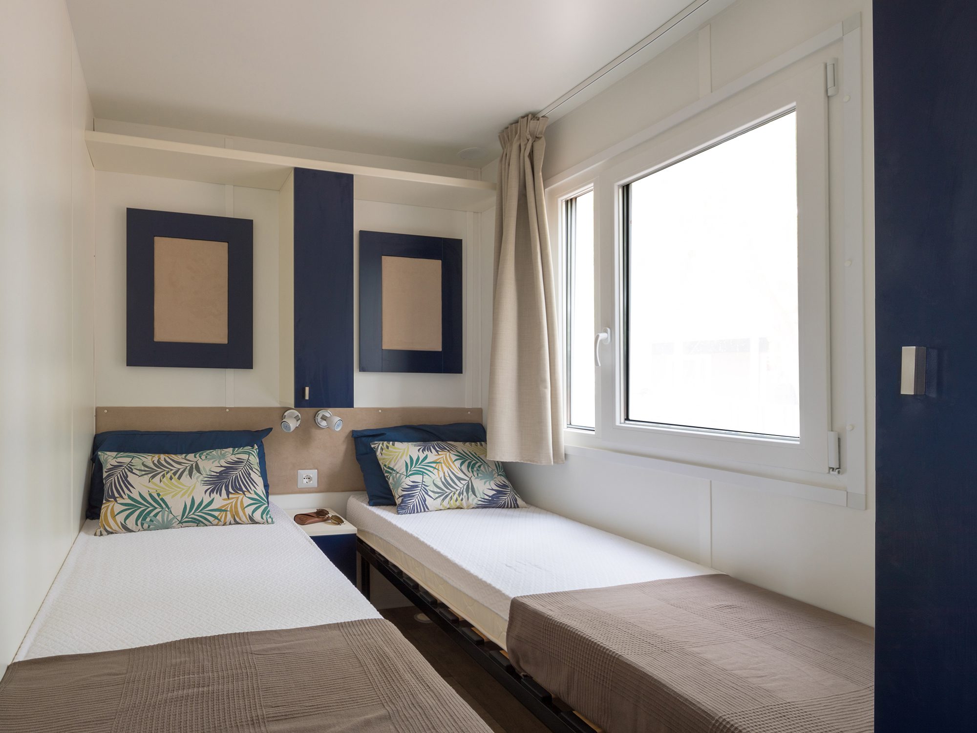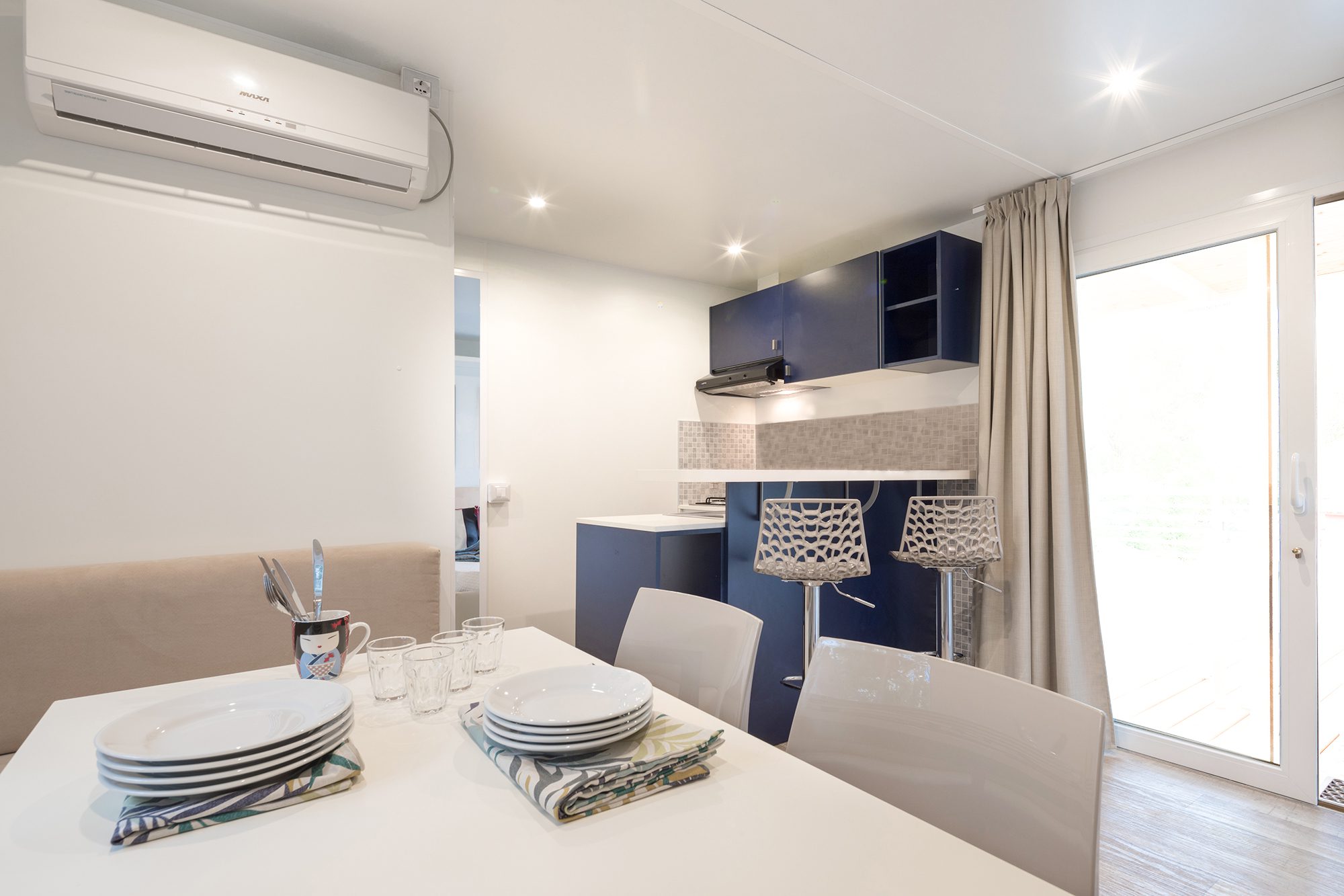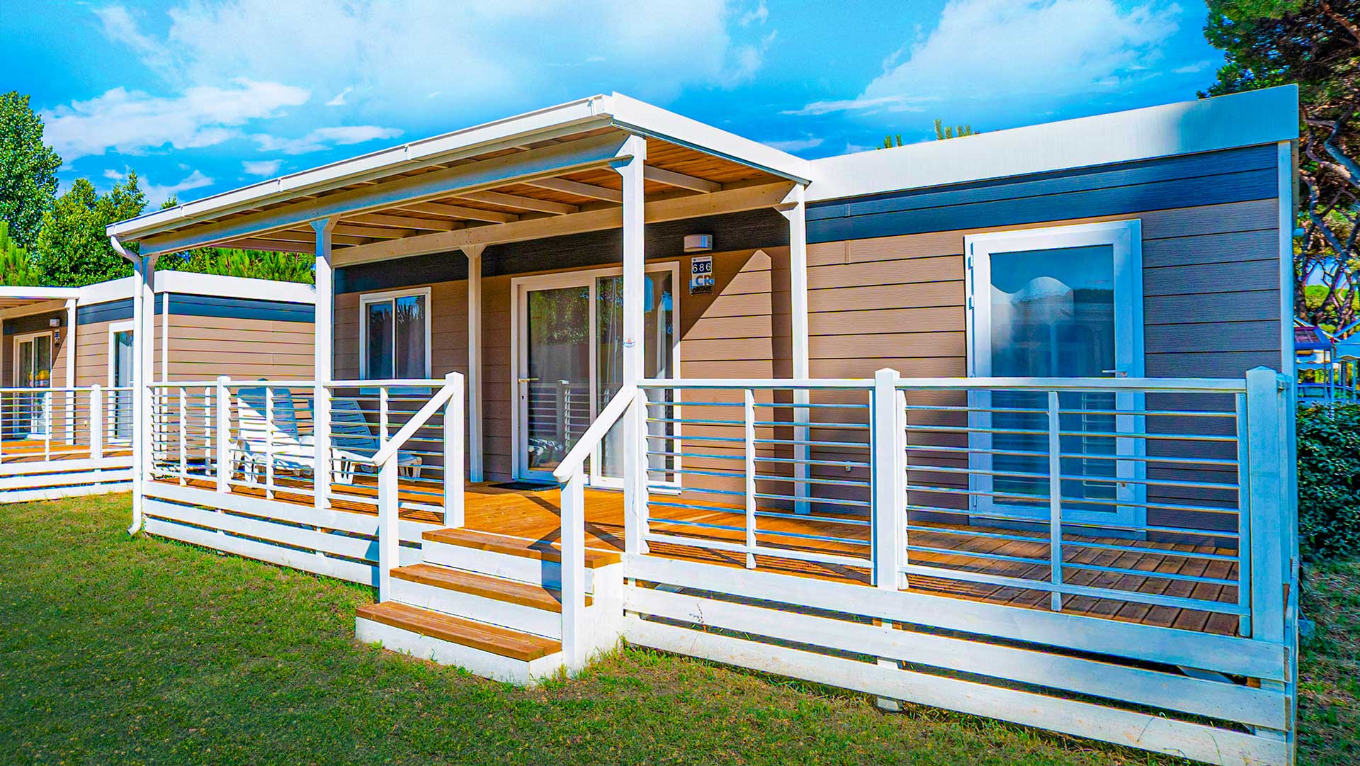 Das frische, junge und gemütliche Mobilhome Baia Elite mit einer Fläche von ca. 33 Quadratmetern ist für Familien oder Gruppen von Freunden mit bis zu 6 Personen konzipiert. Die Inneneinrichtung ist modern und komfortabel: eine Küchenecke mit Halbinsel (Halbinsel nur in einigen Unterkünften vorhanden), komplett mit 4-Flammen-Herd, Spüle, Töpfen und Geschirr sowie einem großen Kühlschrank mit Gefrierfach. Die große Fenstertür, die auf die geräumige Holzveranda führt, verleiht dem geräumigen Wohnzimmer, das mit einem Sofa, einem Tisch und Stühlen ausgestattet ist, Helligkeit. Die Unterkunft wird vervollständigt durch einen Schlafbereich mit 3 Schlafzimmern, eines mit einem Doppelbett und 2 mit 2 Einzelbetten, ein komplettes Badezimmer mit WC, Dusche, Waschbecken und 1 Badezimmer mit WC und Waschbecken.