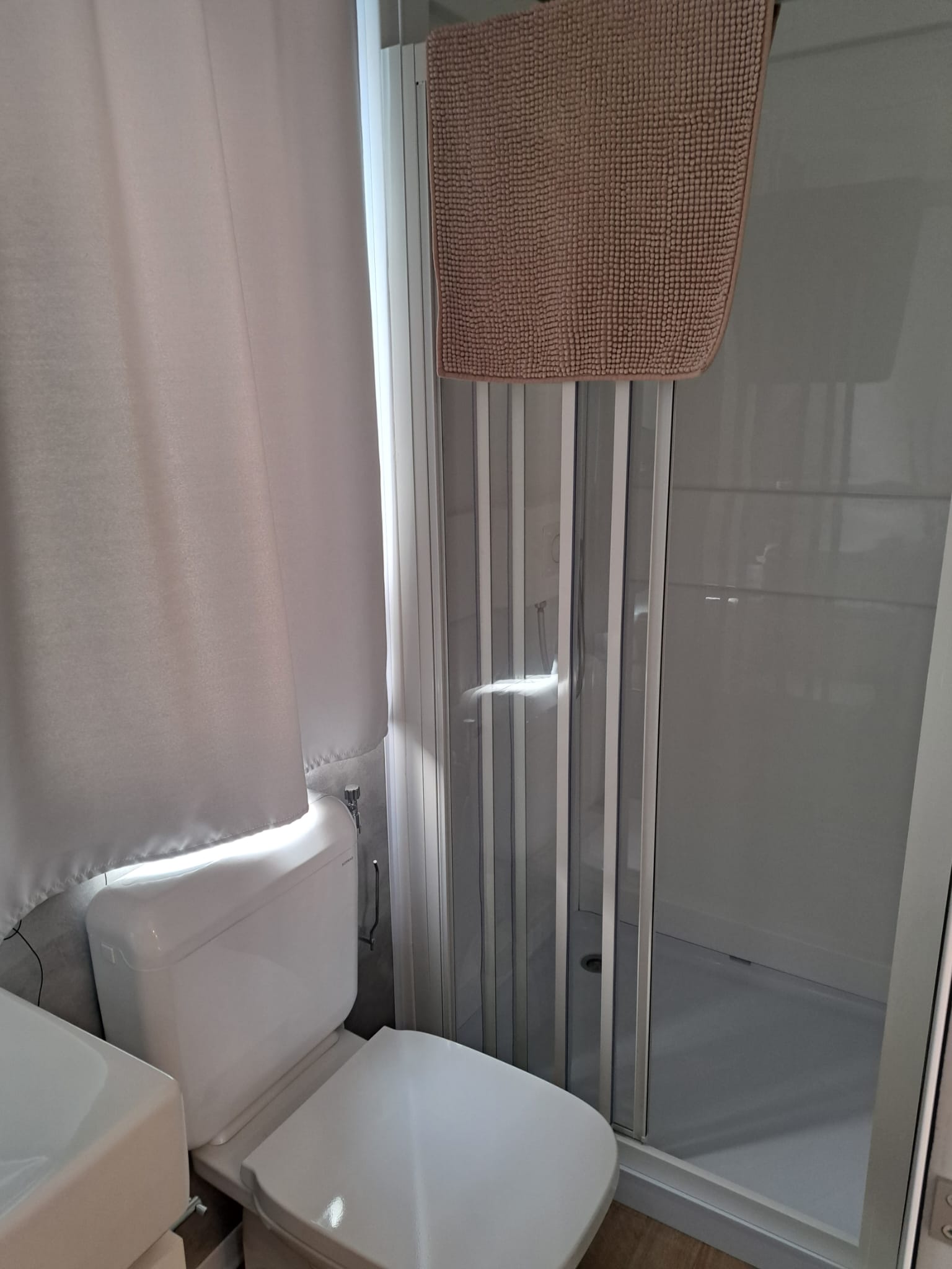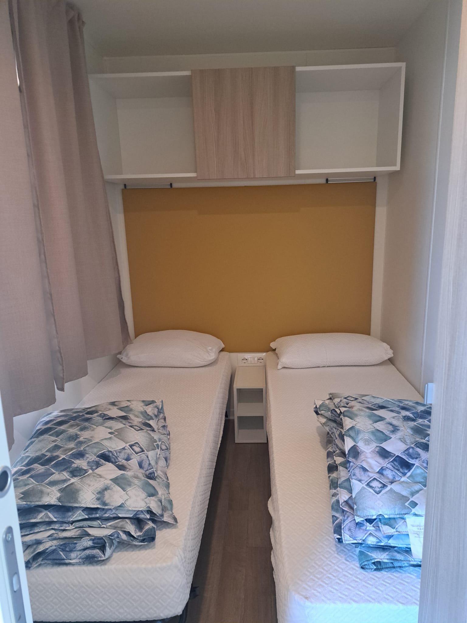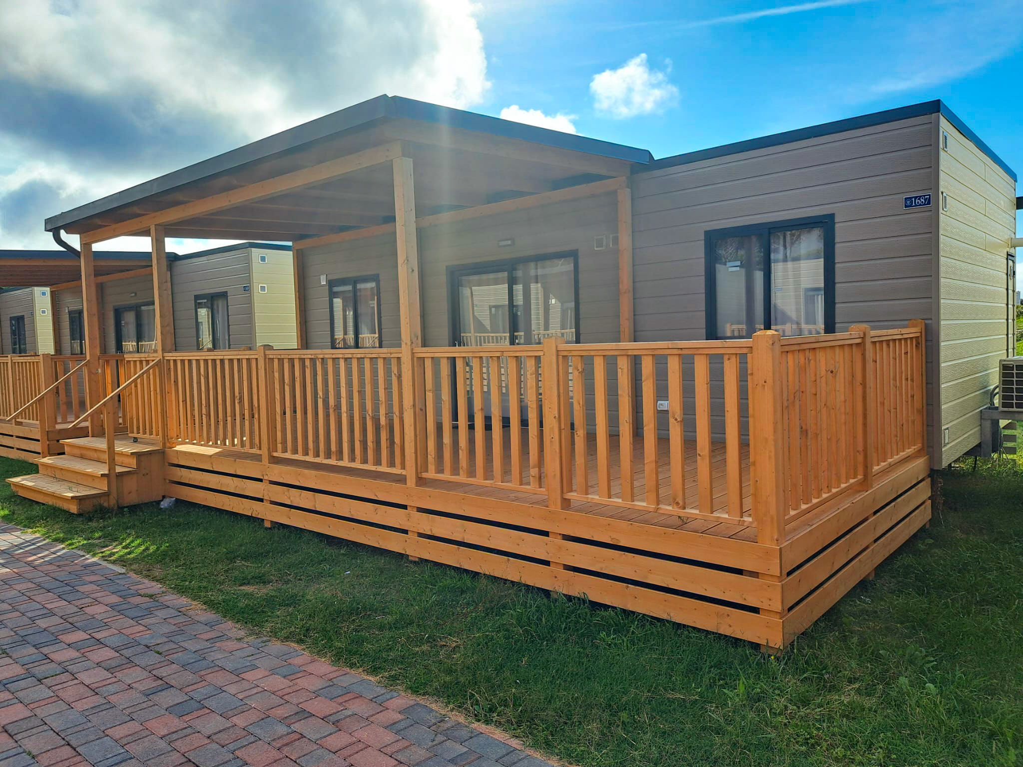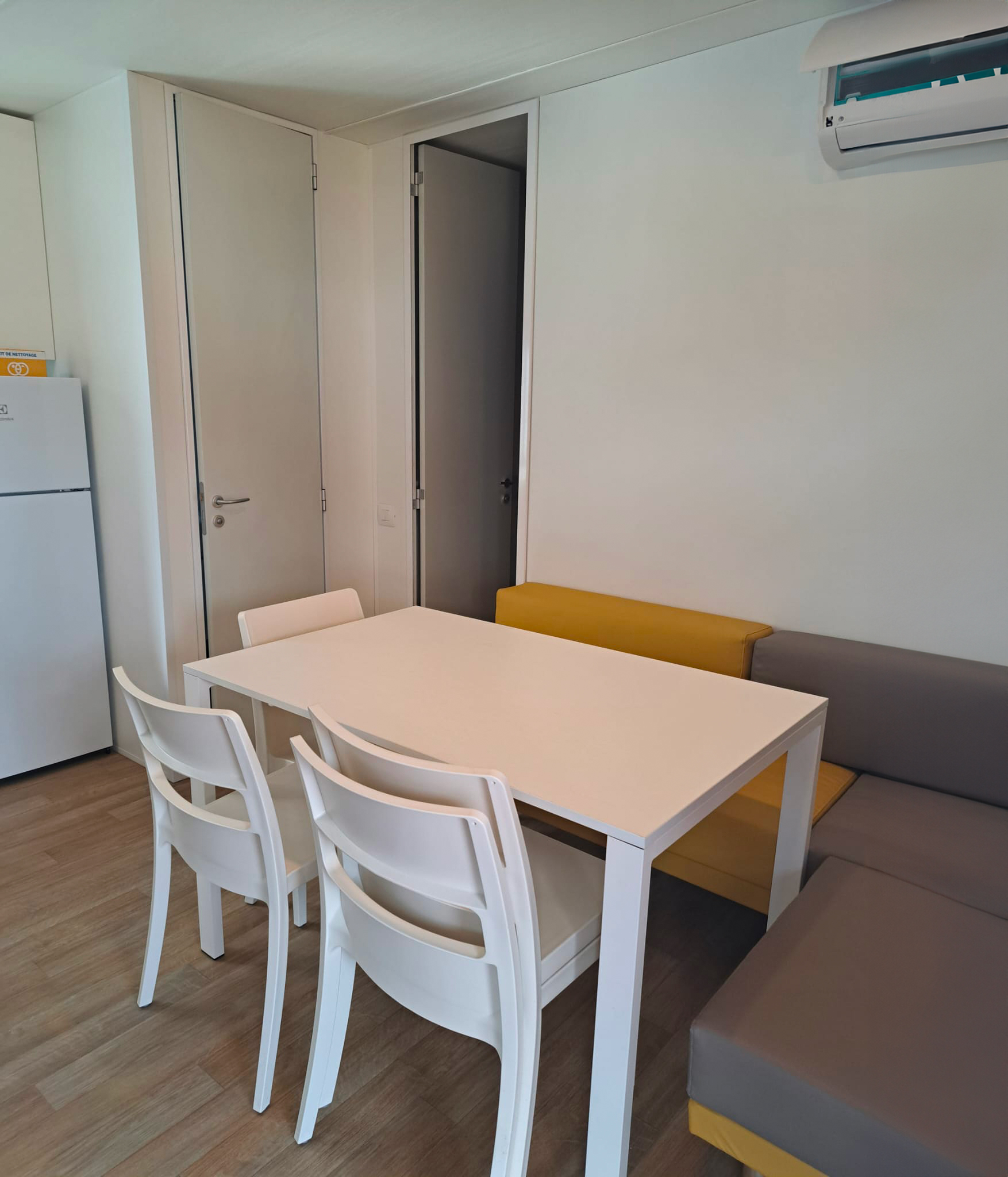 Das frische, junge und gemütliche Mobilhome Baia Elite mit einer Fläche von ca. 33 Quadratmetern ist für Familien oder Gruppen von Freunden mit bis zu 6 Personen konzipiert. Die Inneneinrichtung ist modern und komfortabel: eine Küchenecke mit Halbinsel (Halbinsel nur in einigen Unterkünften vorhanden), komplett mit 4-Flammen-Herd, Spüle, Töpfen und Geschirr sowie einem großen Kühlschrank mit Gefrierfach. Die große Fenstertür, die auf die geräumige Holzveranda führt, verleiht dem geräumigen Wohnzimmer, das mit einem Sofa, einem Tisch und Stühlen ausgestattet ist, Helligkeit. Die Unterkunft wird vervollständigt durch einen Schlafbereich mit 3 Schlafzimmern, eines mit einem Doppelbett und 2 mit 2 Einzelbetten, ein komplettes Badezimmer mit WC, Dusche, Waschbecken und 1 Badezimmer mit WC und Waschbecken.