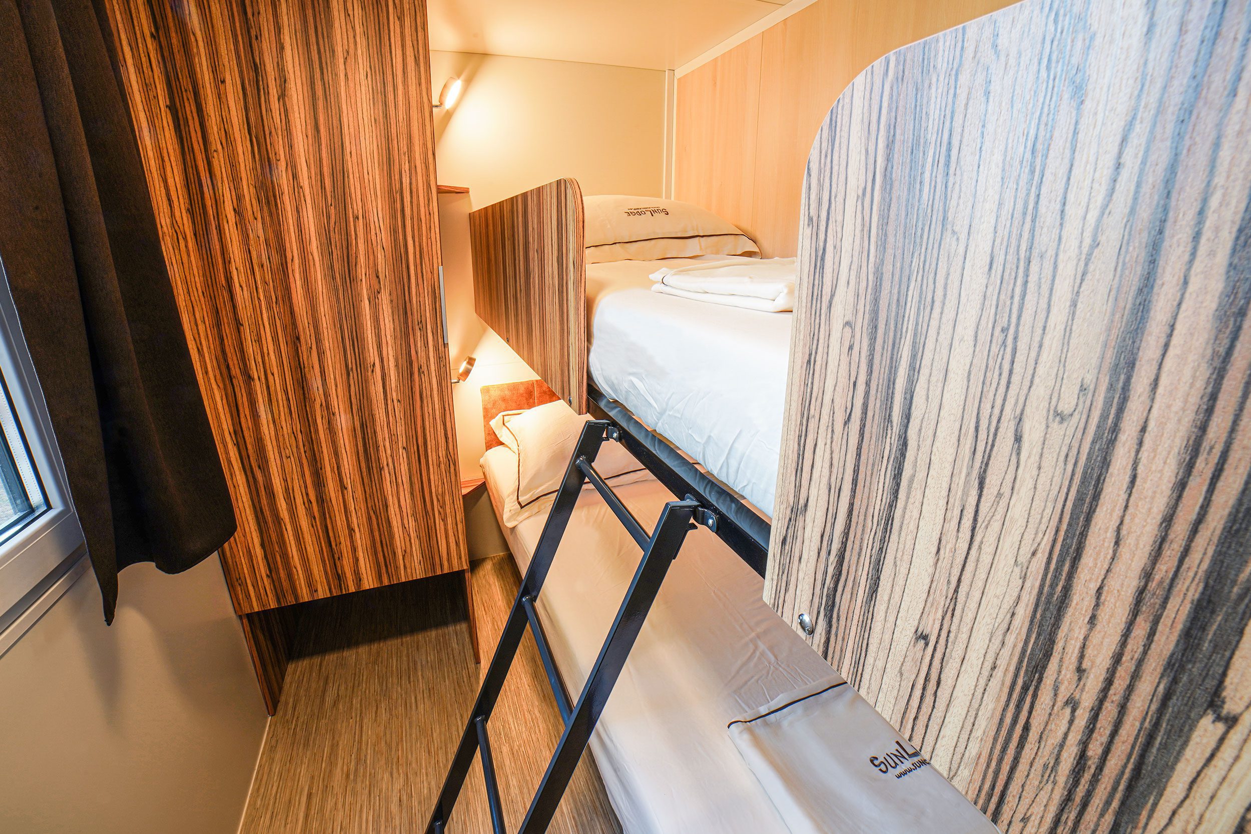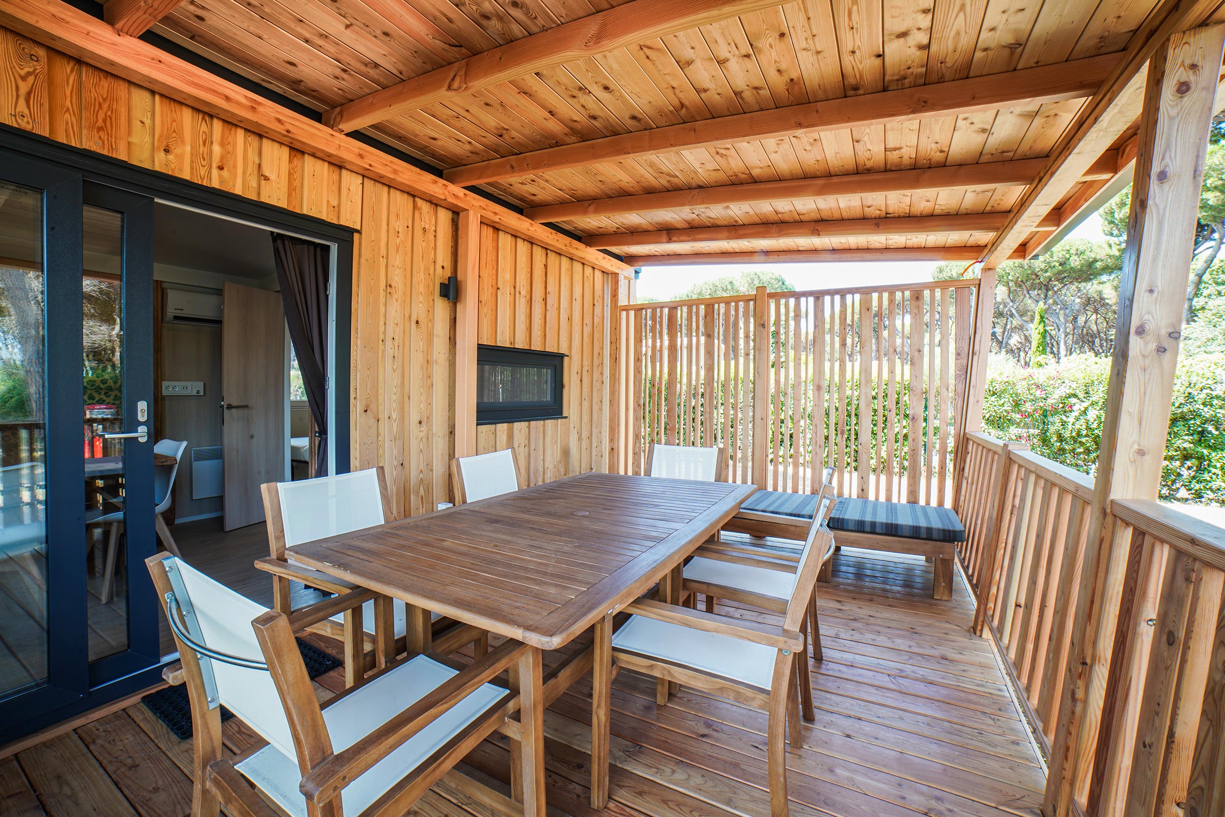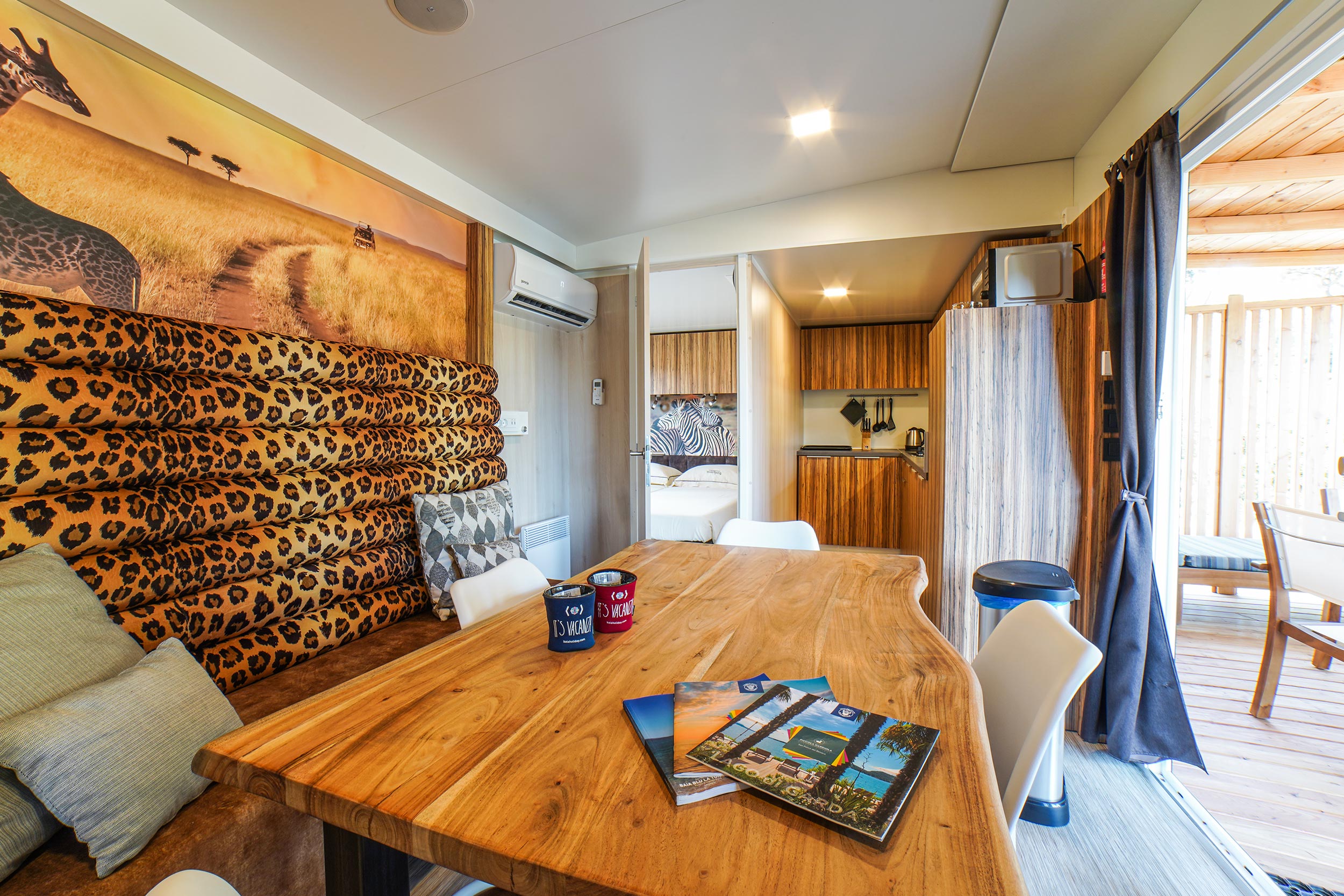 Die neue SunLodge BigLeaf im Safari-Stil ist etwa 36 m² groß und bietet Platz für maximal sechs Personen. Sie besteht aus einem großen Wohnzimmer mit Tisch, Bank und Stühlen sowie einer Küchenzeile, die mit einem Säulenkühlschrank mit Gefrierfach, einem 4-flammigen Kochfeld, einer Spüle, Töpfen und Geschirr ausgestattet ist. Der Schlafbereich besteht aus drei Zimmern, eines mit einem Doppelbett, eines mit zwei Einzelbetten und eines mit einem Etagenbett. Die Unterkunft verfügt über 1 komplettes Badezimmer mit Regendusche und WC und 1 Badezimmer mit WC und Waschbecken. Eine große überdachte Holzterrasse von etwa 16 Quadratmetern, die mit Gartenmöbeln aus Holz und 2 Liegestühlen ausgestattet ist, vervollständigt die Unterkunft. Klimaanlage vorhanden, auf Anfrage.