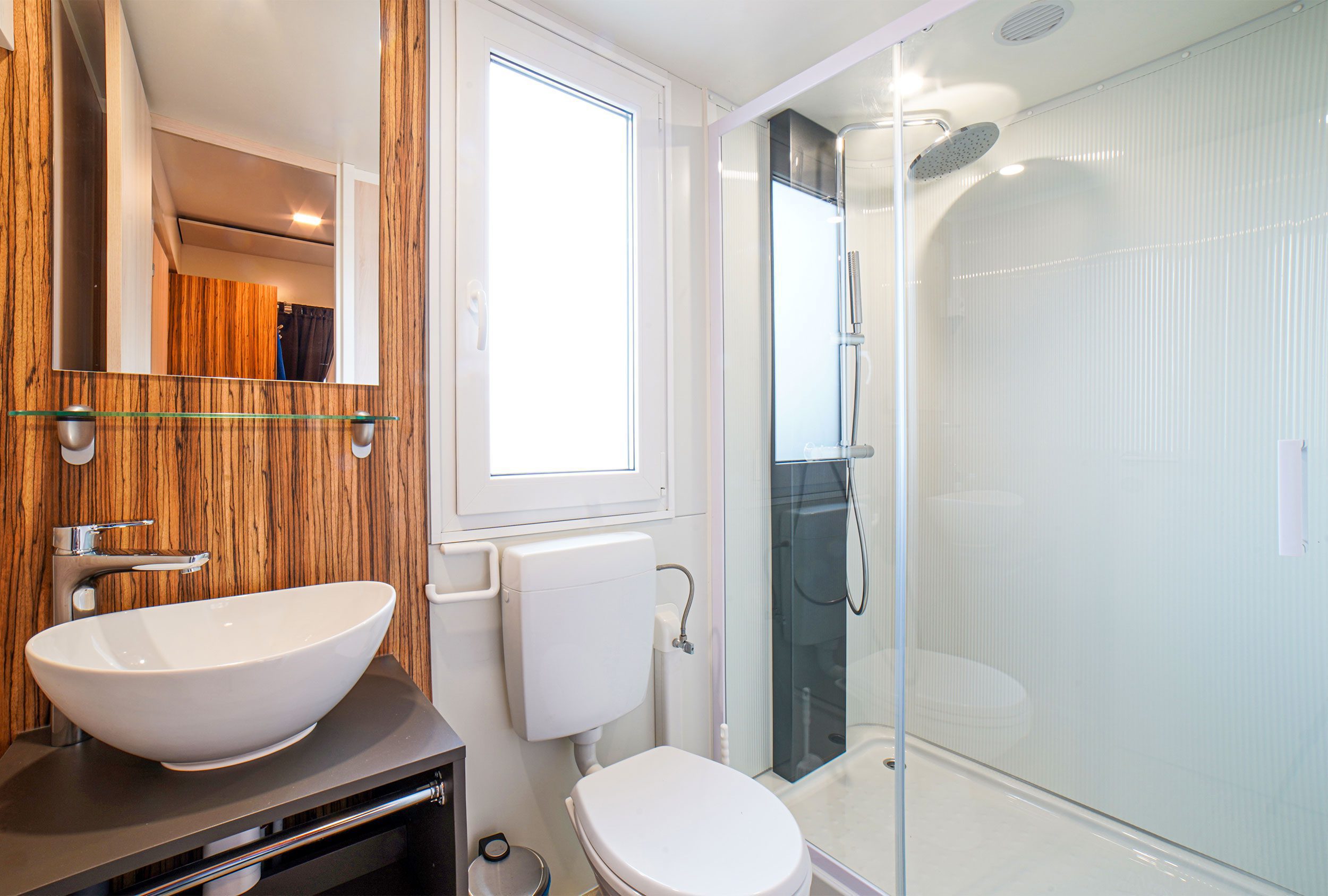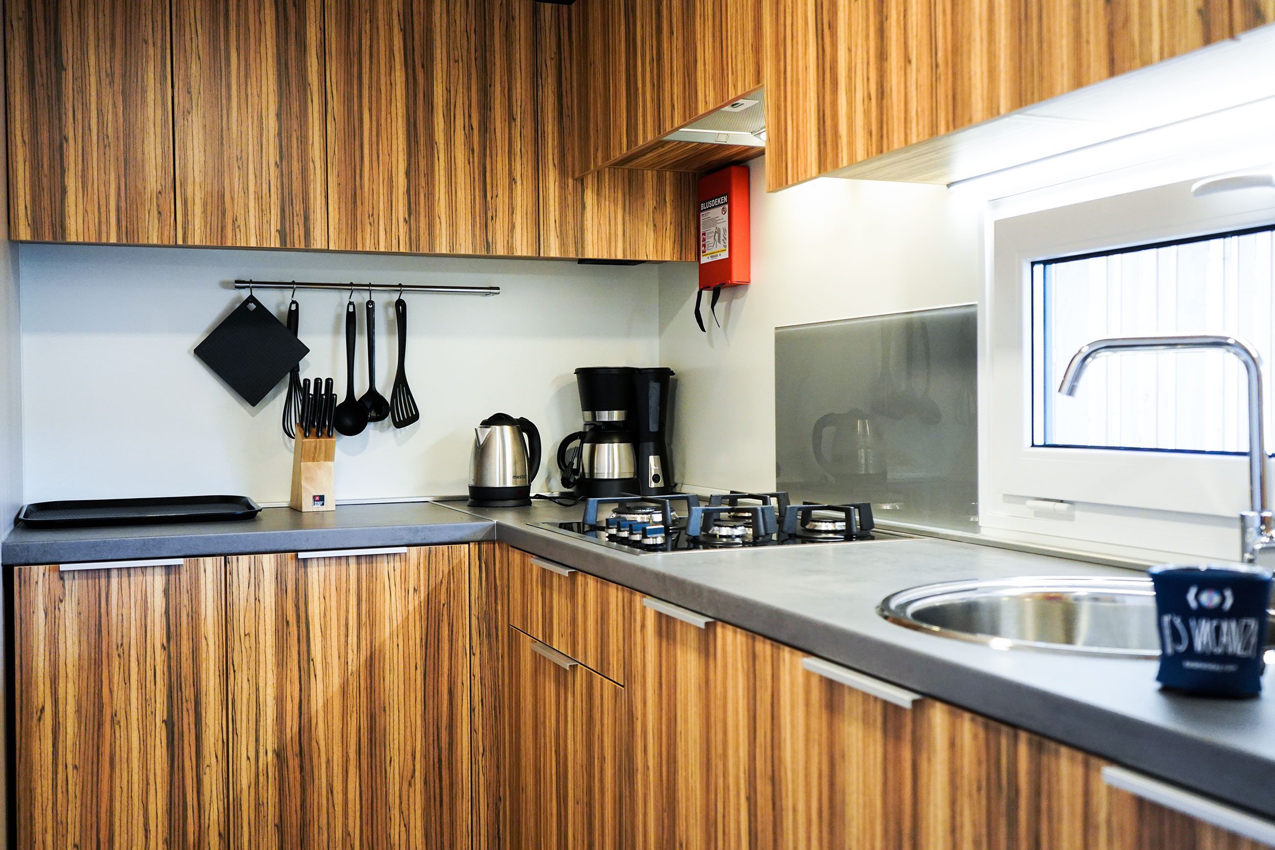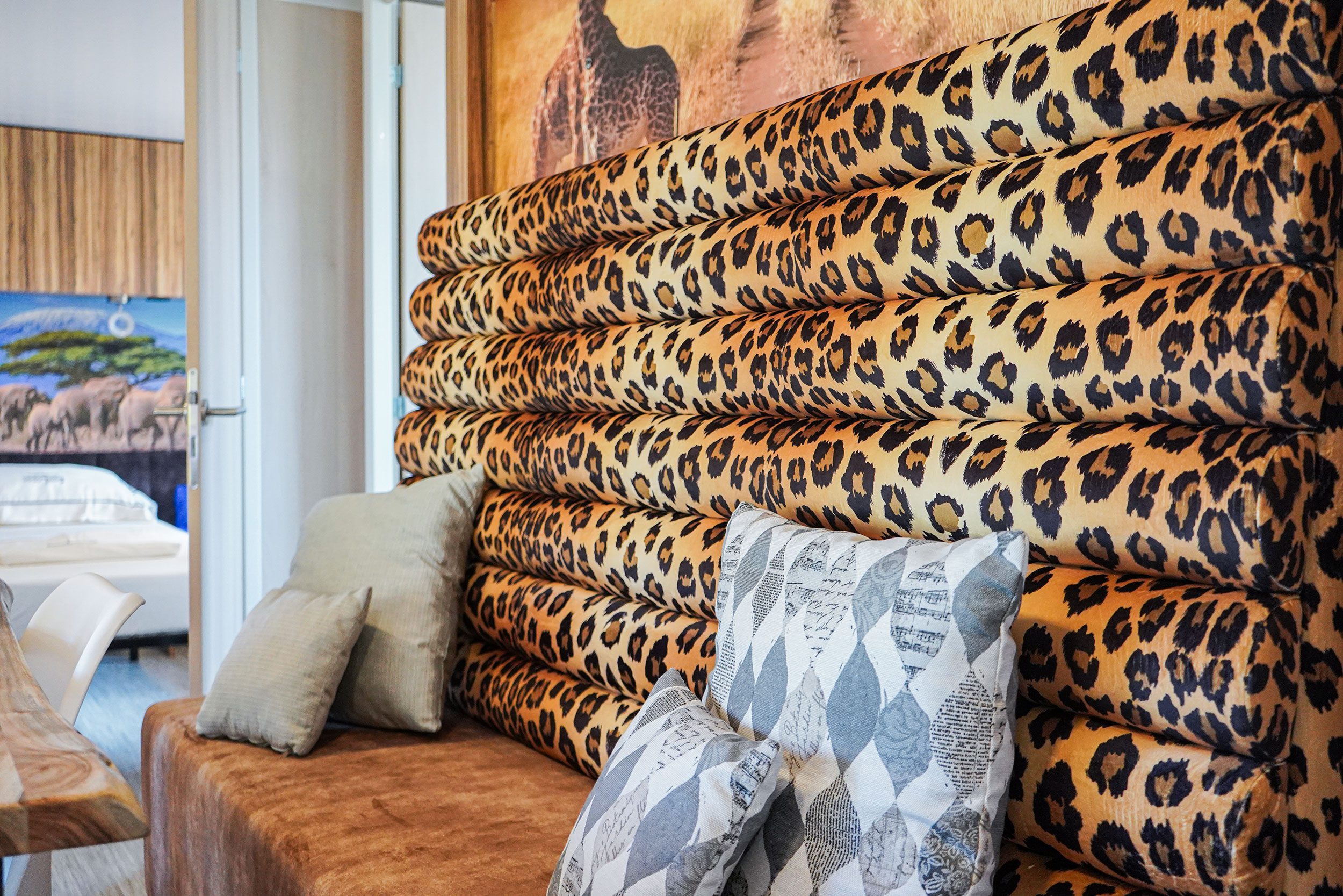 Die neue SunLodge BigLeaf im Safari-Stil ist etwa 36 m² groß und bietet Platz für maximal sechs Personen. Sie besteht aus einem großen Wohnzimmer mit Tisch, Bank und Stühlen sowie einer Küchenzeile, die mit einem Säulenkühlschrank mit Gefrierfach, einem 4-flammigen Kochfeld, einer Spüle, Töpfen und Geschirr ausgestattet ist. Der Schlafbereich besteht aus drei Zimmern, eines mit einem Doppelbett, eines mit zwei Einzelbetten und eines mit einem Etagenbett. Die Unterkunft verfügt über 1 komplettes Badezimmer mit Regendusche und WC und 1 Badezimmer mit WC und Waschbecken. Eine große überdachte Holzterrasse von etwa 16 Quadratmetern, die mit Gartenmöbeln aus Holz und 2 Liegestühlen ausgestattet ist, vervollständigt die Unterkunft. Klimaanlage vorhanden, auf Anfrage.