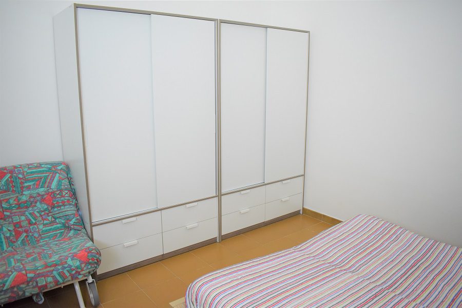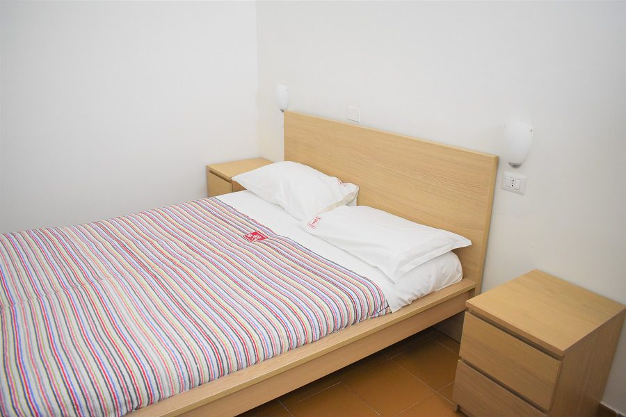 - Ein Zimmer mit einem Doppelbett und gegenüber einem Etagenbett (im selben Raum) und im Wohnzimmer gibt es ein Doppelschlafsofa