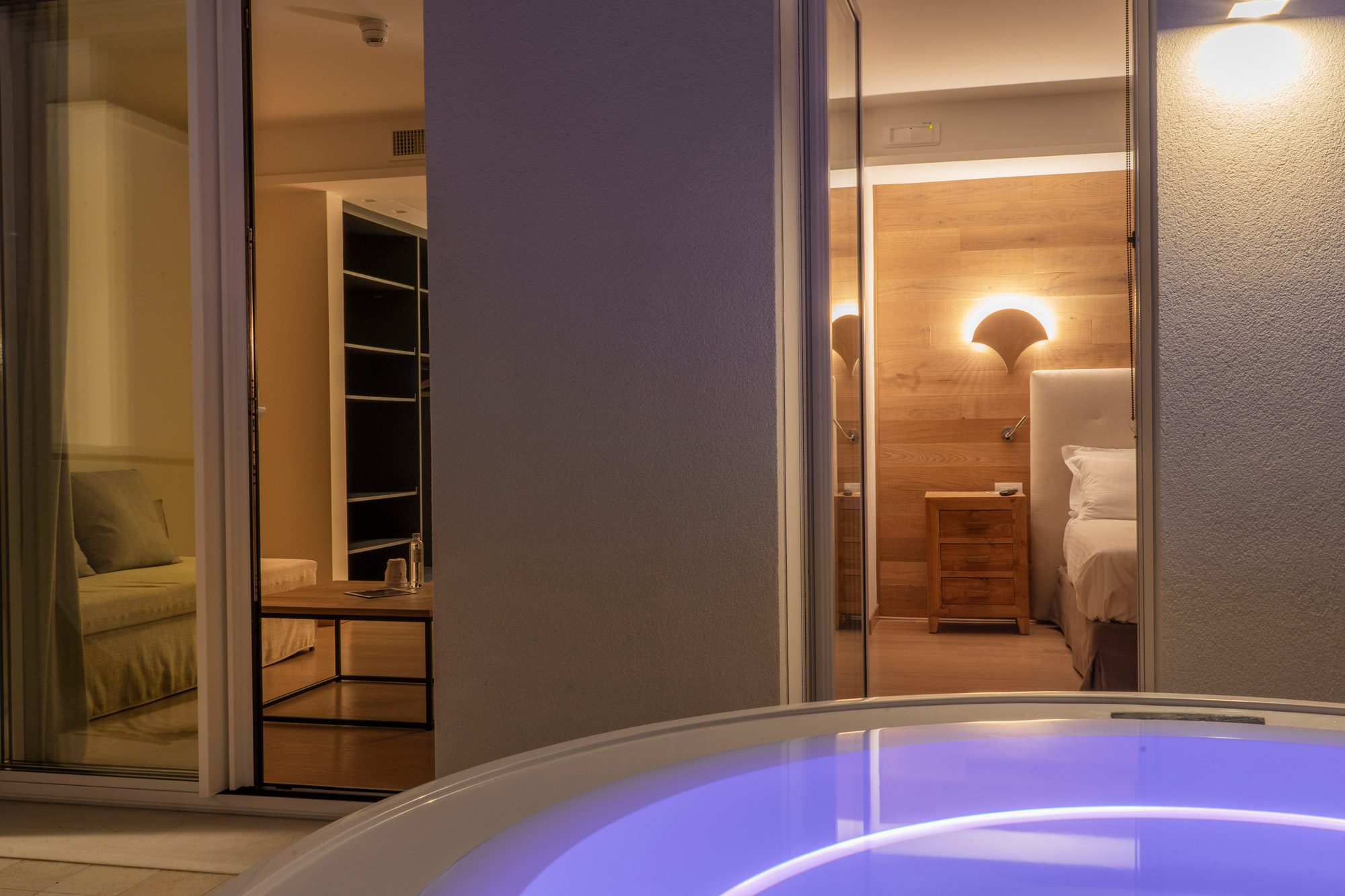 Die 40 Quadratmeter große Junior Suite befindet sich im ersten Stock und verfügt über zwei Schlafbereiche und ein komplettes Badezimmer. Es ist mit Holzmöbeln und -böden, Kleiderschrank oder begehbarem Kleiderschrank, Telefon, Safe, Minibar, Doppelfrequenz-Wi-Fi-Service, 43“ LCD-Fernseher mit Satellitenkanälen und Klimaanlage ausgestattet. Im Badezimmer finden Sie einen Haartrockner, ein Pflegeset und ein Strandtuch, das auf Anfrage erhältlich ist. Es verfügt über eine Terrasse mit einem privaten Jacuzzi, um entspannende Momente in Gesellschaft Ihrer Familie zu genießen.