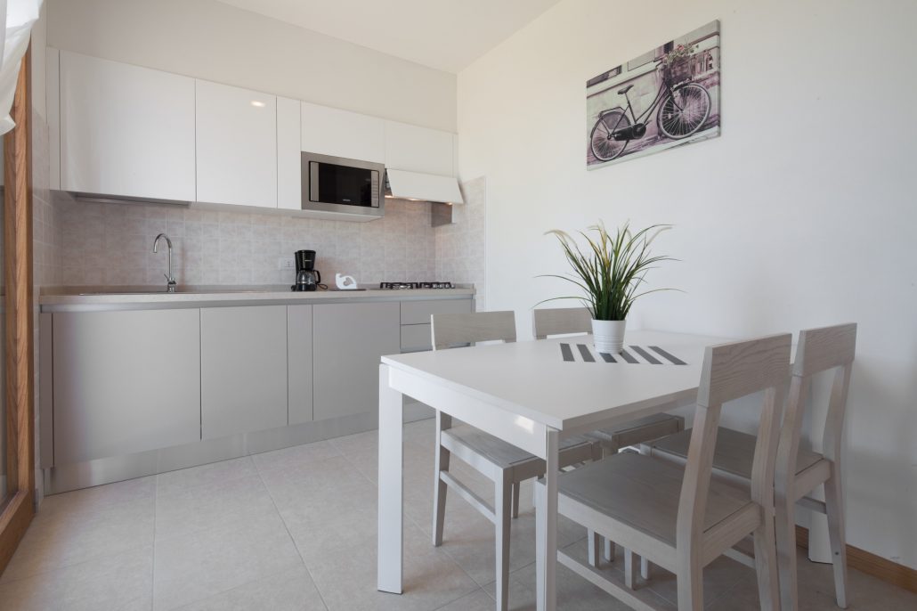 Das 81 m² große Haus besteht aus einem großen Wohnbereich mit einer offenen Küche mit Glaskeramik-Gasherd, Geschirrspüler, Multifunktionsofen, Kühlschrank mit Gefrierfach, Zubehör und Besteck. Im Schlafbereich finden Sie zwei Doppelschlafzimmer, von denen eines über ein eigenes Bad verfügt. Außerdem gibt es ein weiteres Gemeinschaftsbad mit Dusche. Die Wohnung kann dank des Schlafsofas im Wohnzimmer bis zu 6 Personen beherbergen und ist mit Klimaanlage und Fußbodenheizung für die kälteren Monate ausgestattet. Draußen können Sie sich in einem Außenbereich entspannen, wo Sie einen Tisch, Stühle und zwei Liegestühle vorfinden.