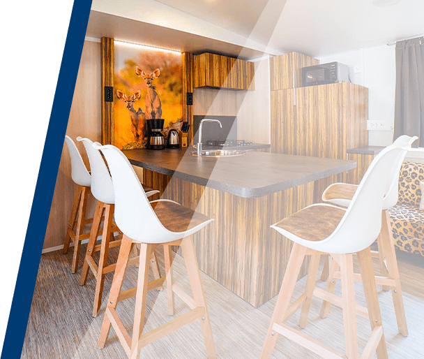A bit different accommodation, half a tent and half a mobile home. The Lodge Tent structures are raised from the ground with the interior walls and hard wood flooring, while the cover is typical of the tents. They consist of a living area with kitchenette, two bedrooms and a bathroom with shower. Outside there is a patio with umbrella, table and chairs.