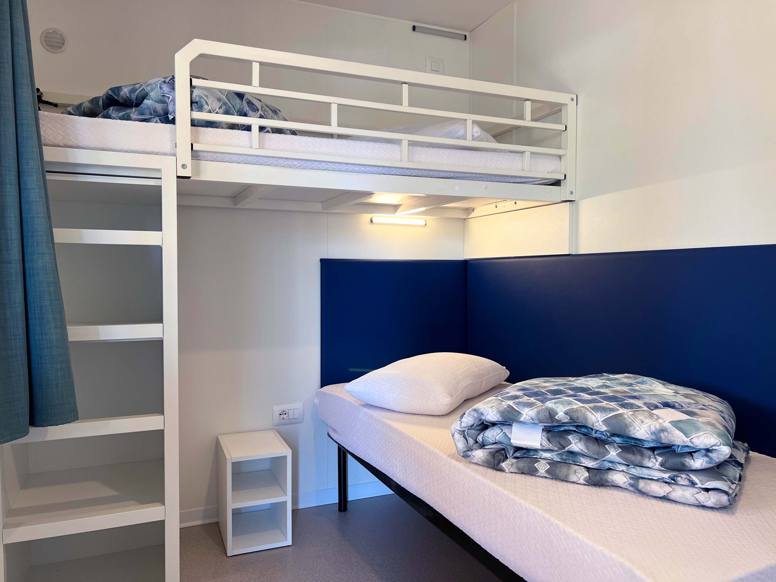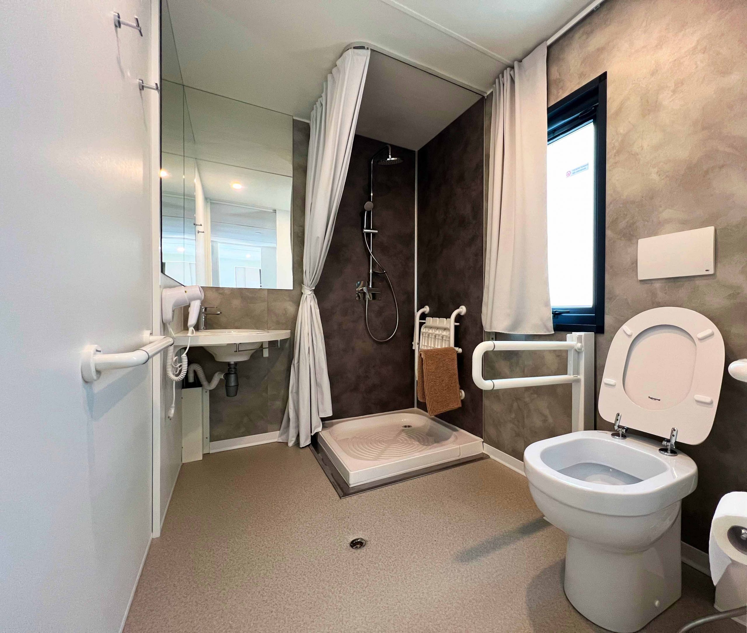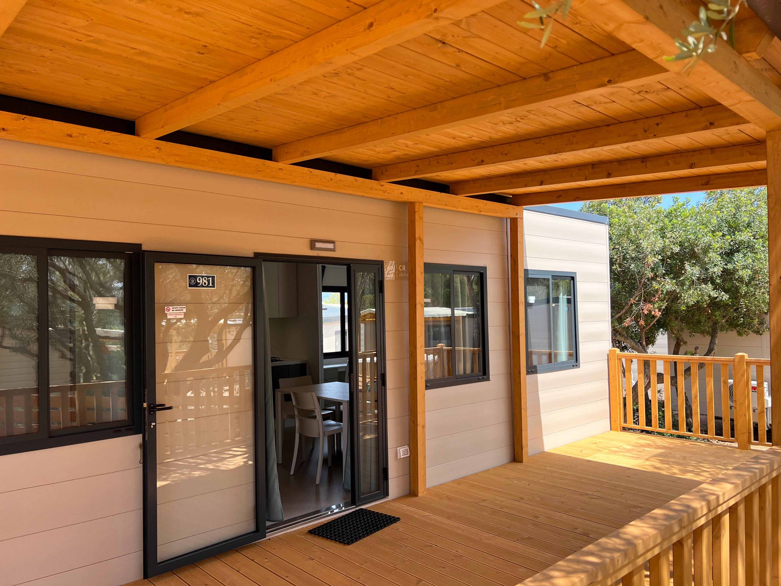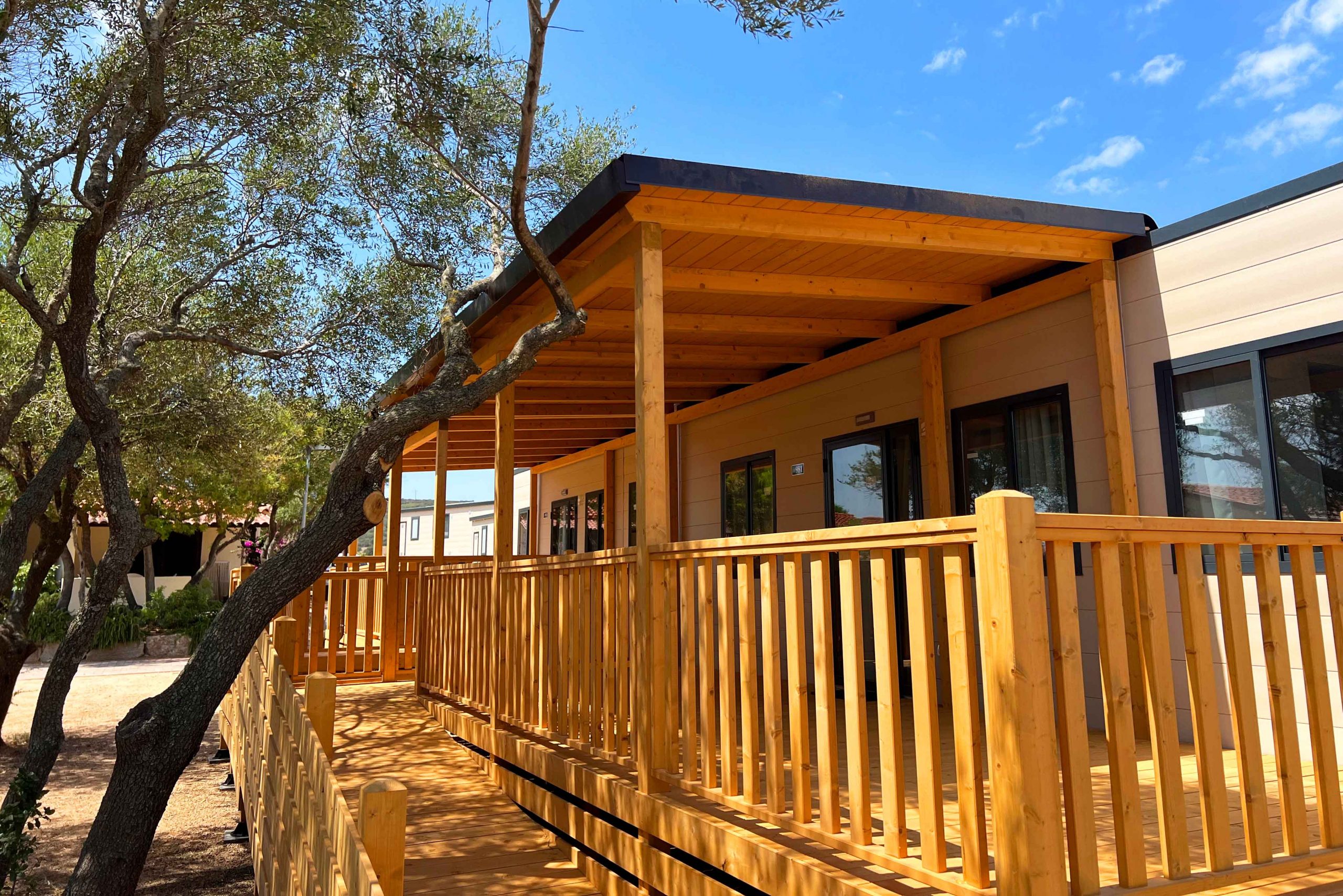This model is designed to provide all kinds of comforts even for people with mobility difficulties and can provide a better quality of life on vacation. It has an area of about 32 m² and can accommodate up to 4 people. It consists of living room with table and chairs, kitchenette equipped with pedestal refrigerator with freezer, 4-burner gas stove, sink, cookware and dishes. The sleeping area consists of 2 bedrooms, one with a double bed and one with 2 single beds. The accommodation has 1 full bathroom with toilet, shower and washbasin. A covered wooden veranda equipped with table and chairs completes the accommodation.