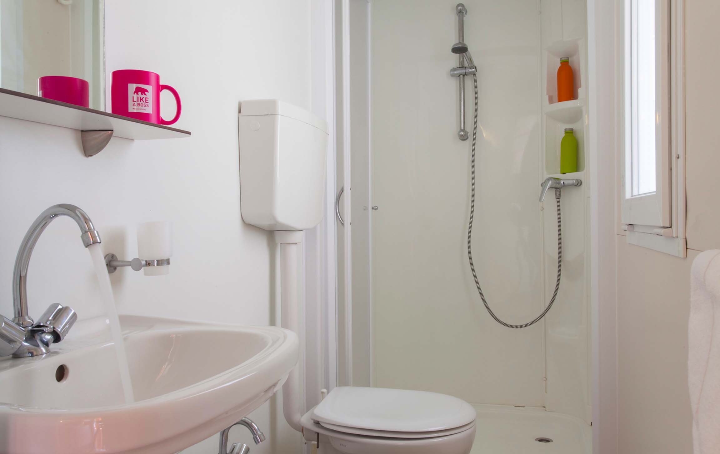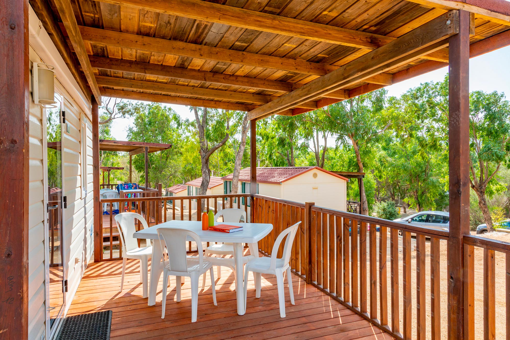 It has an area of about 24 m² and can hold a maximum of 4 adults and 1 child. It consists of a bedroom with double bed, a bedroom with 2 single beds and a third raised bed, living room with table, chairs and sofa, a room with toilet, bidet, shower and sink, kitchenette with sink and refrigerator, outside, garden table and chairs. Cutlery, dishes, blankets and pillows are included in the mobile home. Air conditioning available at extra charge.