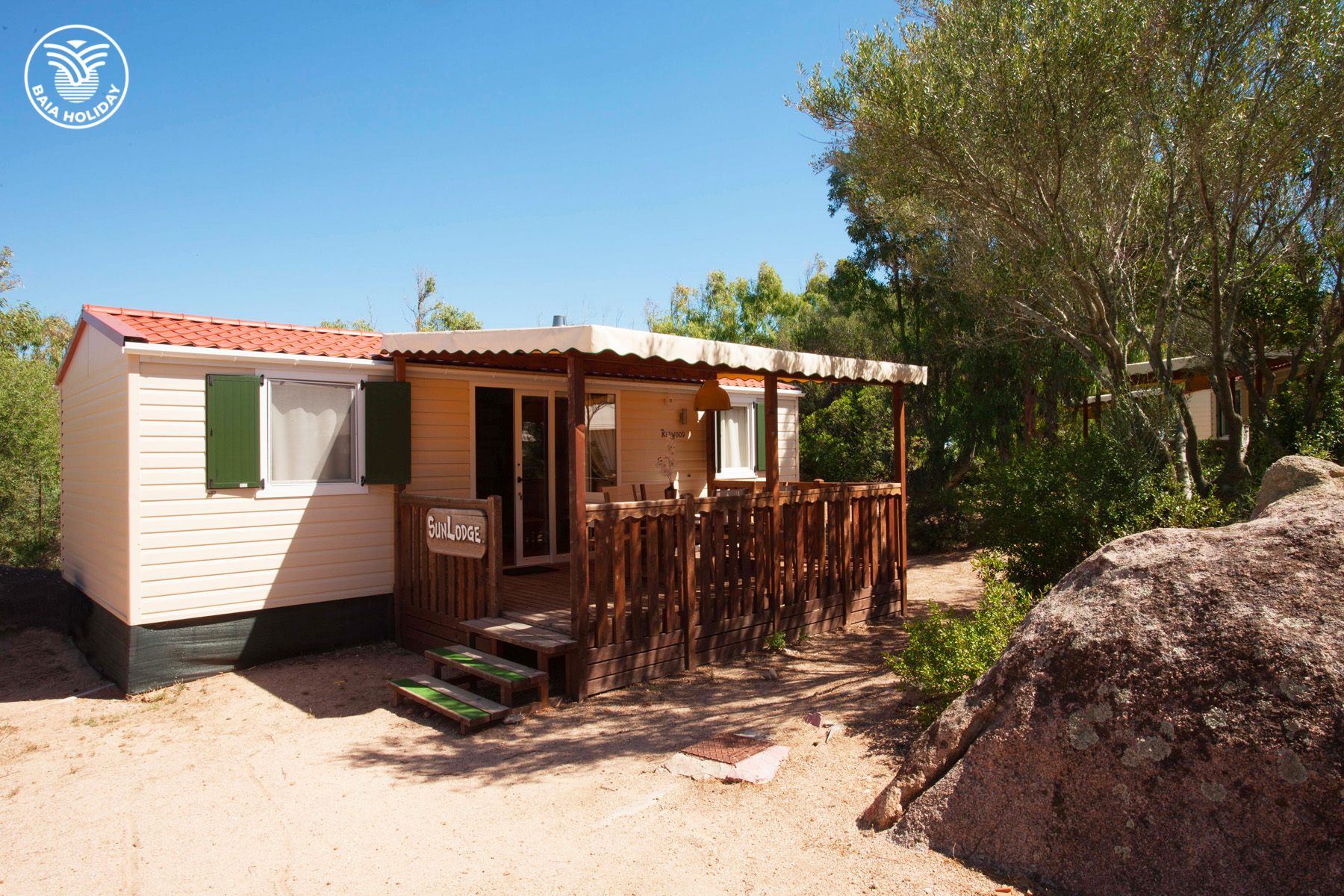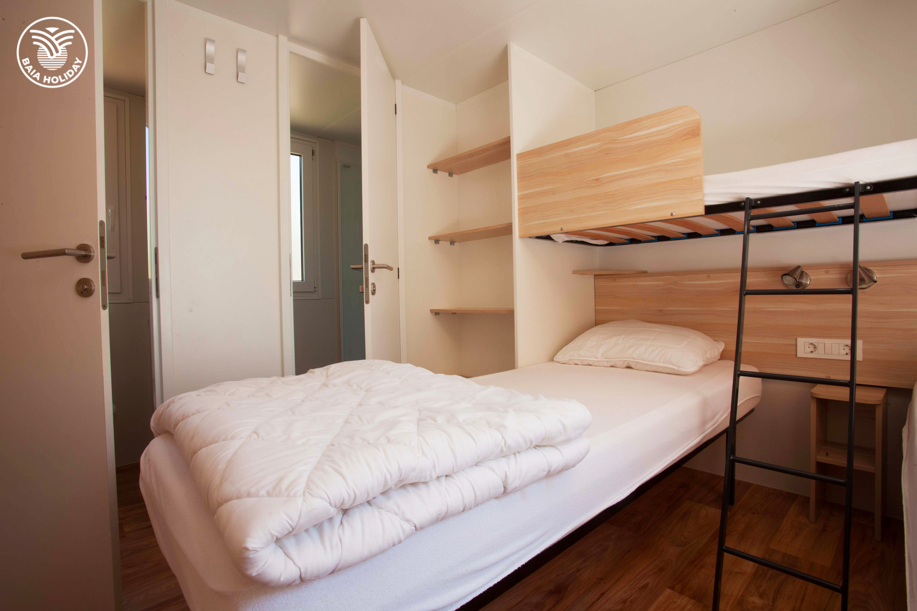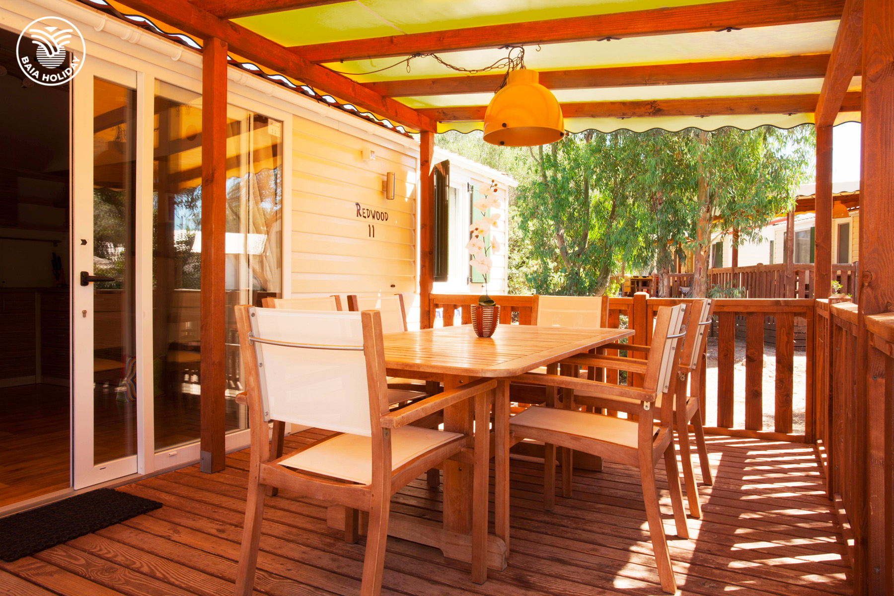 It has an area of about 34 m² and can hold a maximum of 4 adults and 1 child. It consists of living room with table and chairs, kitchenette equipped with refrigerator, 4-burner stove, sink, cookware and dishes. The sleeping area consists of 2 rooms, one with a double bed and one with 2 single beds plus a third raised bed. The accommodation features 2 full bathrooms with shower, toilet and washbasin. Outside is a spacious covered wooden veranda equipped with a table, chairs and two sun loungers.