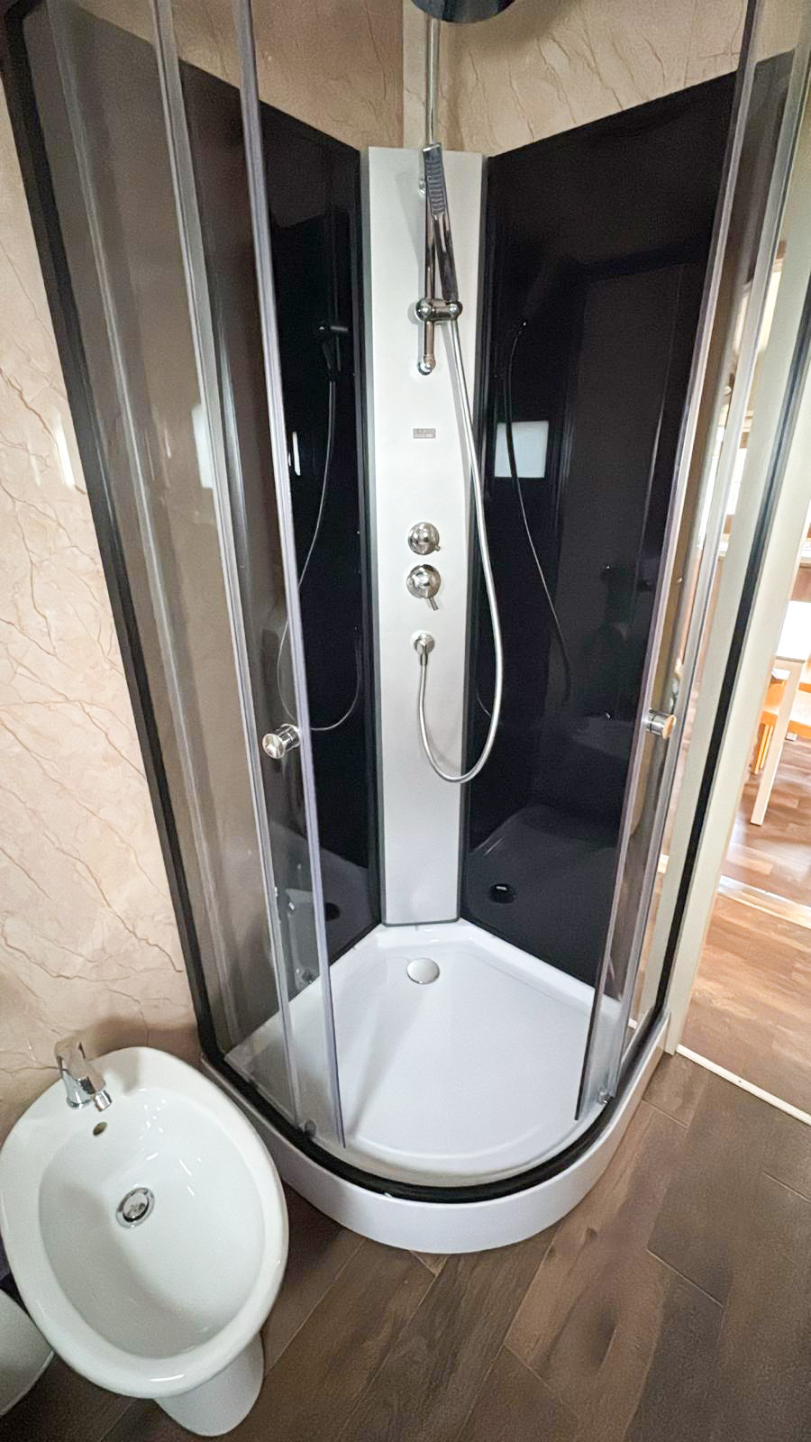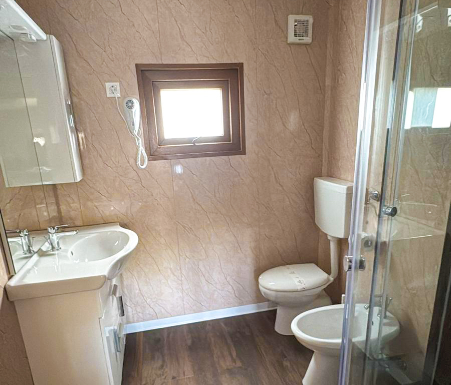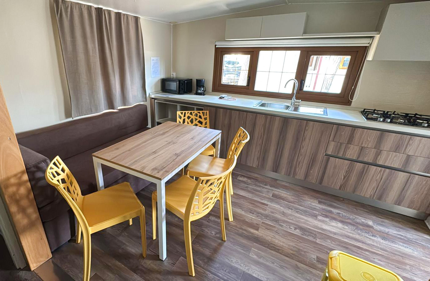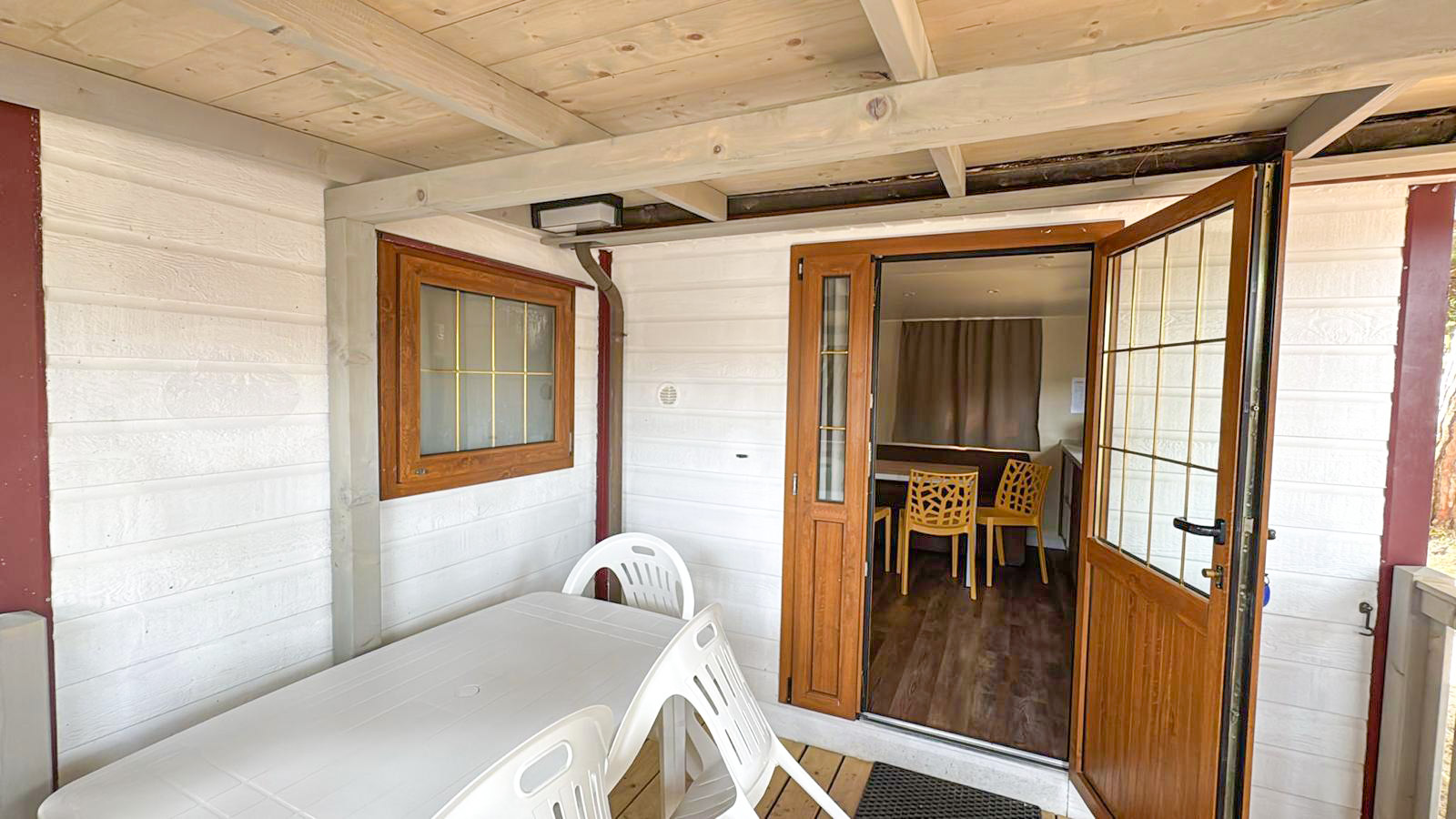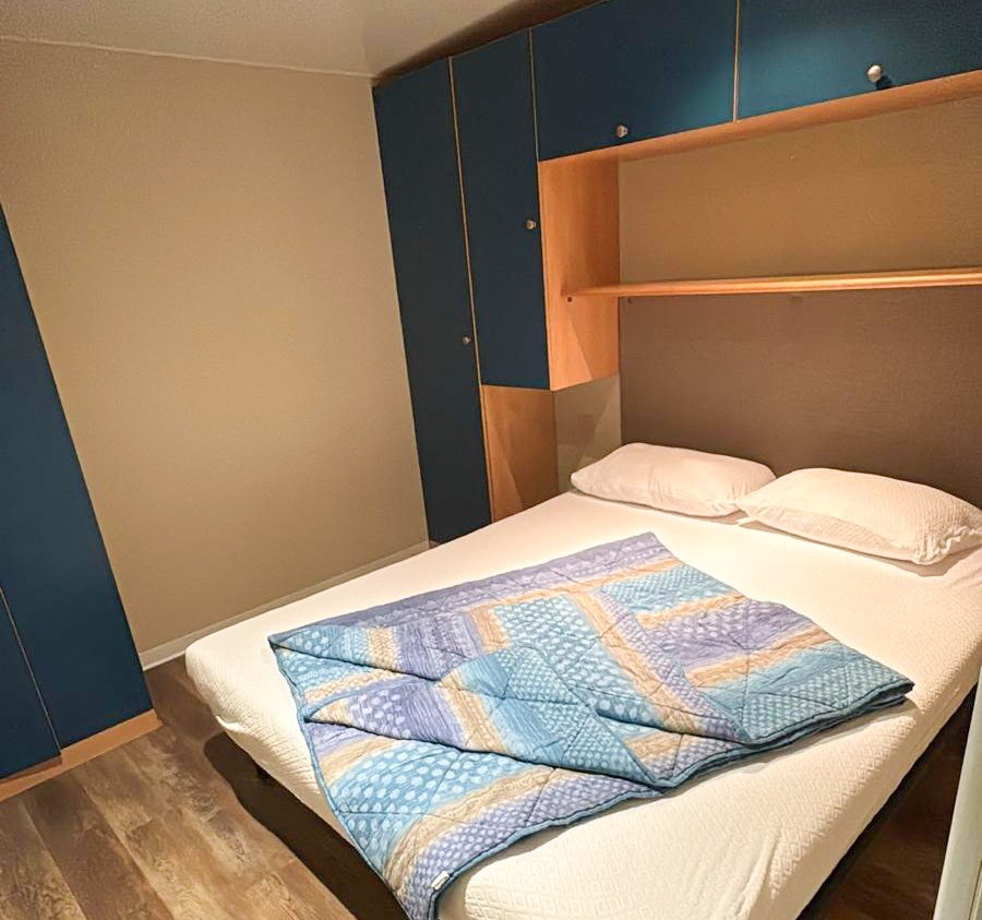 It has an area of about 31 m² and can hold a maximum of 4 adults and 1 child. This mobile home, with its recently renovated interior, consists of a living room with table, chairs and bench-bed, kitchenette equipped with a pedestal refrigerator complete with freezer, 4-burner stove, sink, cookware, dishes, American coffee maker and microwave. The sleeping area consists of 2 rooms, one with a double bed and a generous room with 2 single beds, which can be joined upon request. The accommodation has 1 spacious full bathroom with toilet, shower, bidet and washbasin. Outside a wooden veranda is equipped with table and chairs where you can enjoy relaxing moments!