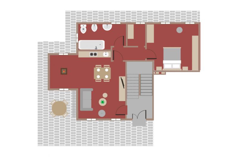Fully equipped 50-square-meter apartment consisting of a large living room with double sofa bed, fireplace and open kitchen equipped with gas stove, dishwasher, microwave oven, refrigerator with freezer and 32″ TV. A master bedroom and a bathroom with a bathtub complete the apartment. Outside there is a gazebo with table and chairs for outdoor dining. Your apartment for a comfortable and relaxing vacation is equipped with AC and heating. Max. 4 people.