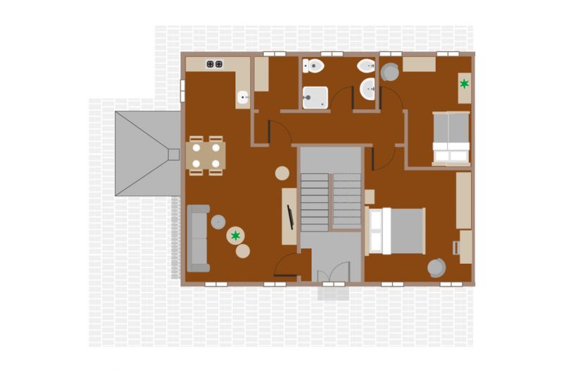 The apartment, located on the second floor, consists of a large living area with an open kitchen, double sofa bed and 32″ TV. The kitchen is equipped with an electric ceramic hob, dishwasher, multifunction oven and refrigerator with freezer. Sleeping area with double bedroom, bedroom with single bed and a second pull-out, and bathroom with shower. Outside is a cozy lounge area complete with table and seating to relax and enjoy the surrounding nature of Cavallino Treporti. Air conditioning and heating are available. The total area is 73 m².